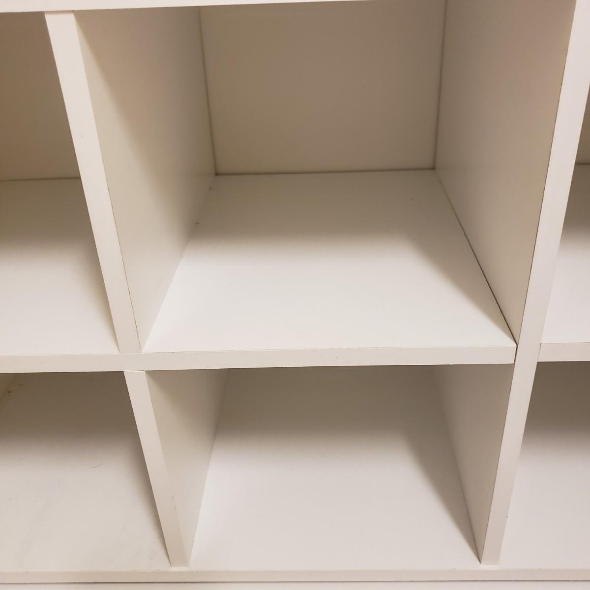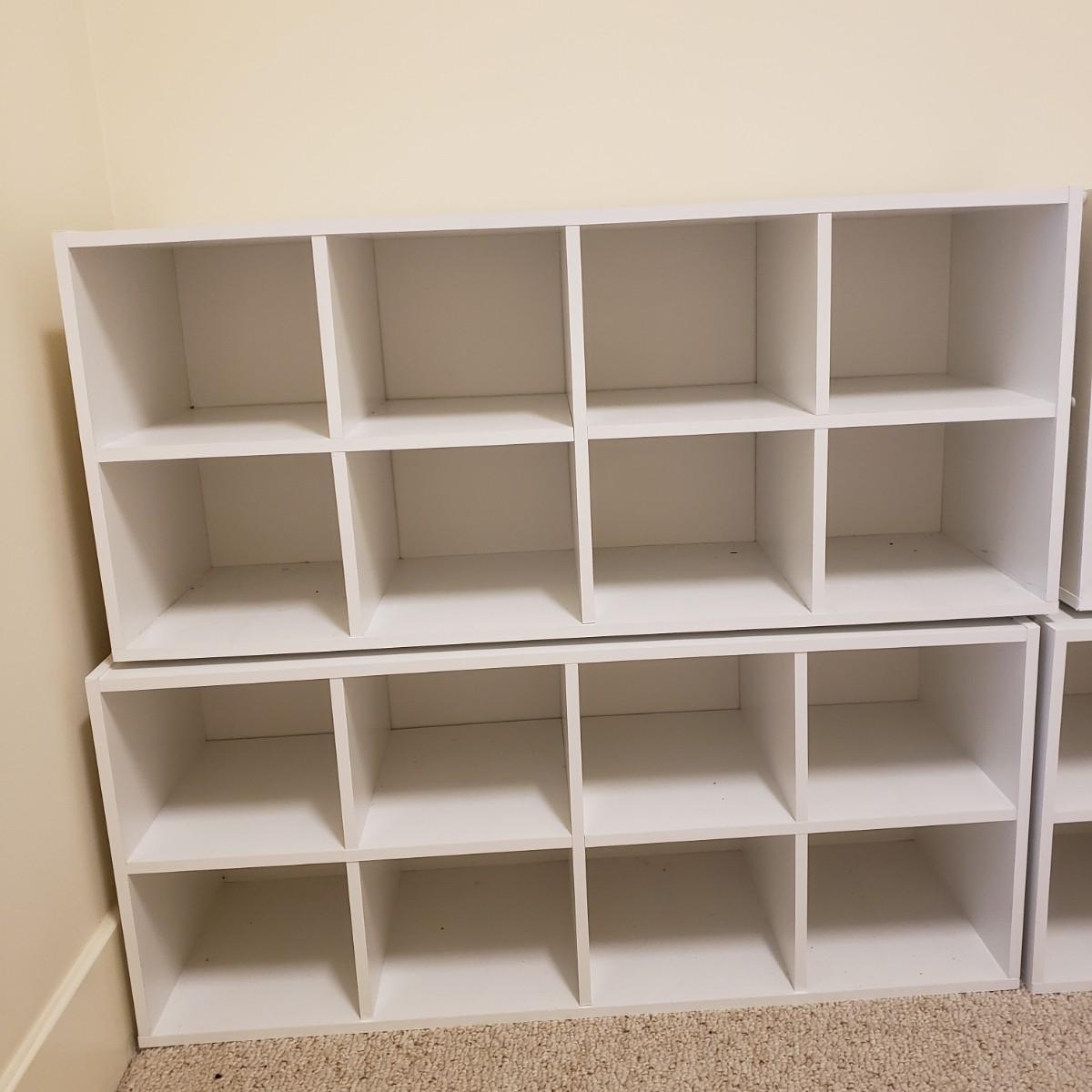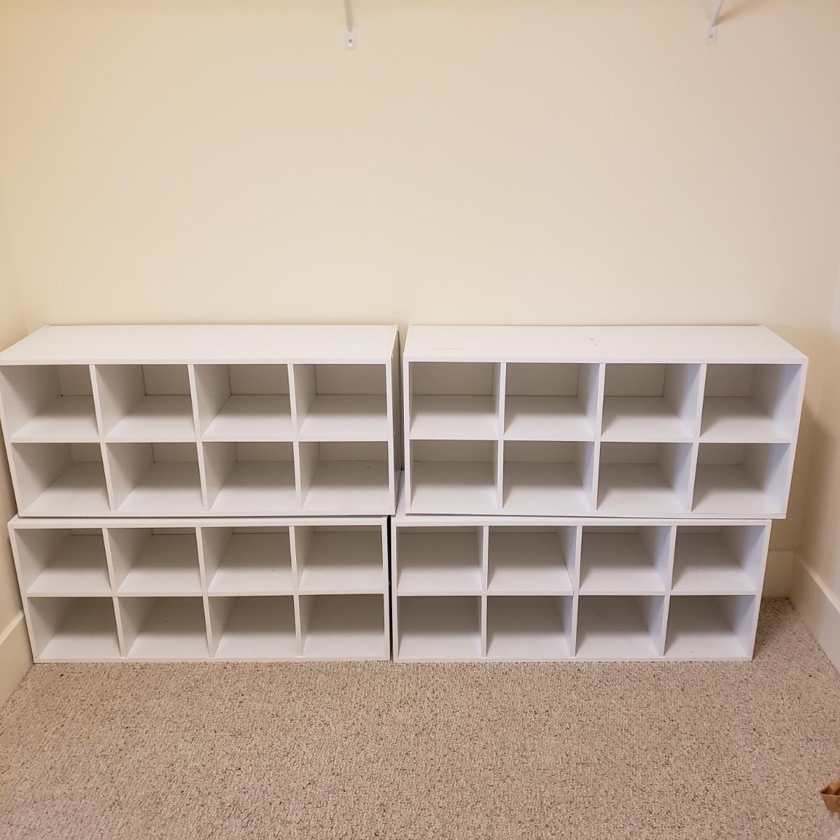 This four-piece lot contains cubed storage organizers. Each unit measures 36" x 11.5" x 16"H. One cube opening measures approximately 8" x 7". One shelf has the white plastic screw cover missing. They are made from pressed wood with a laminate covering.