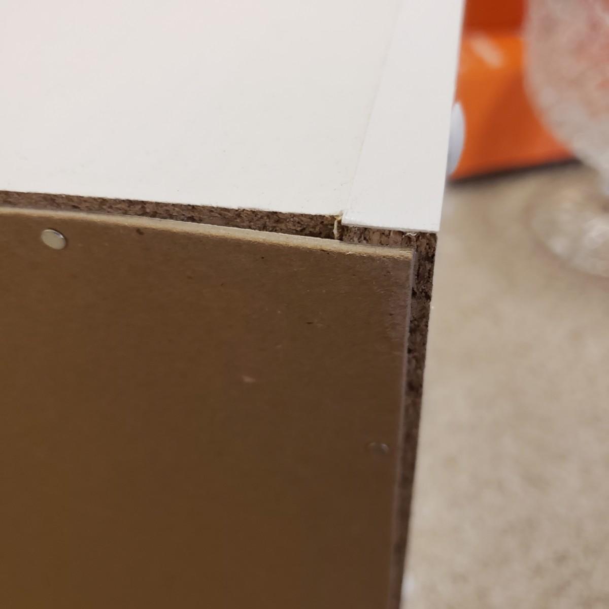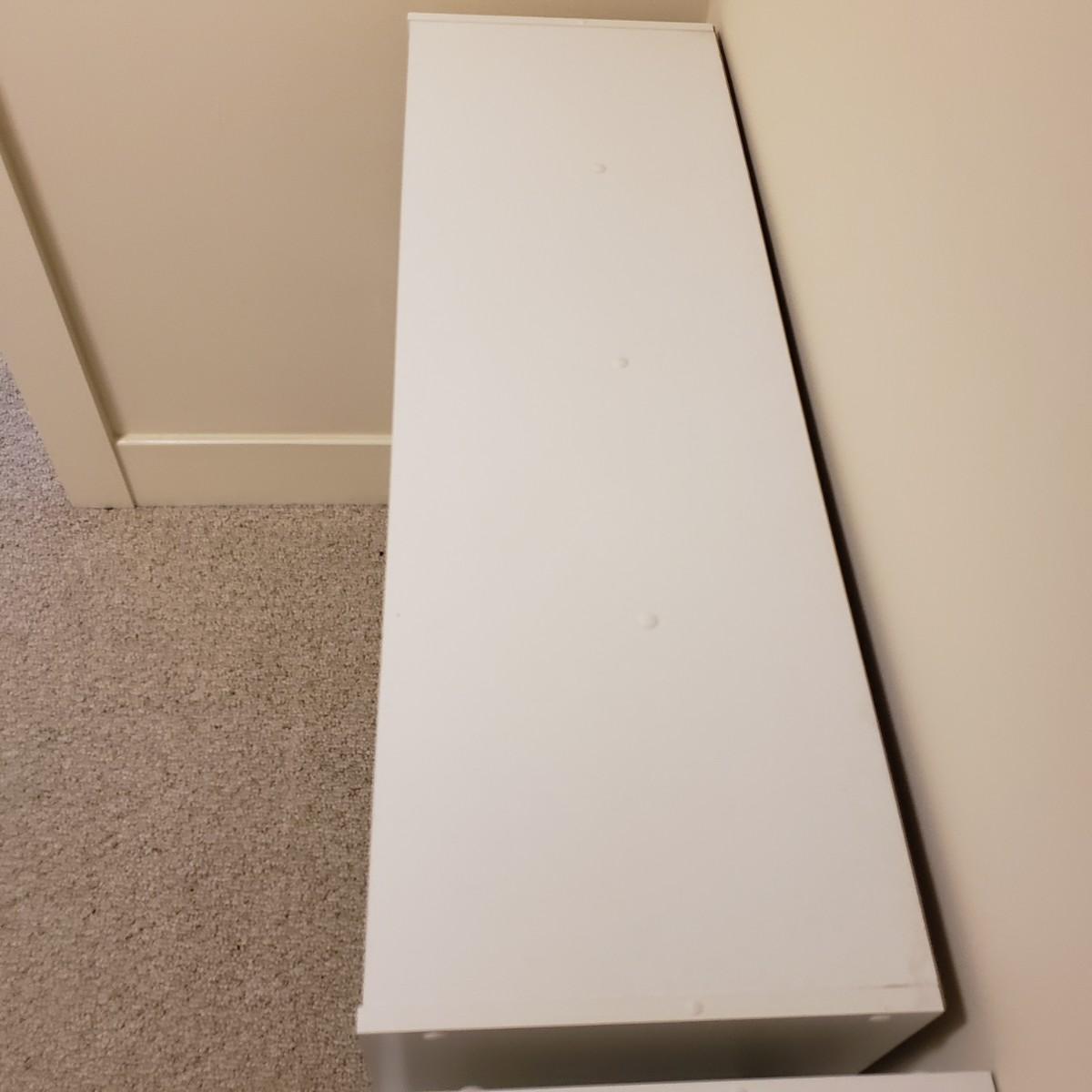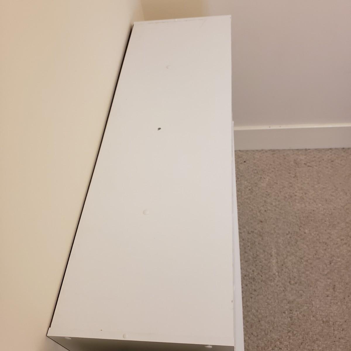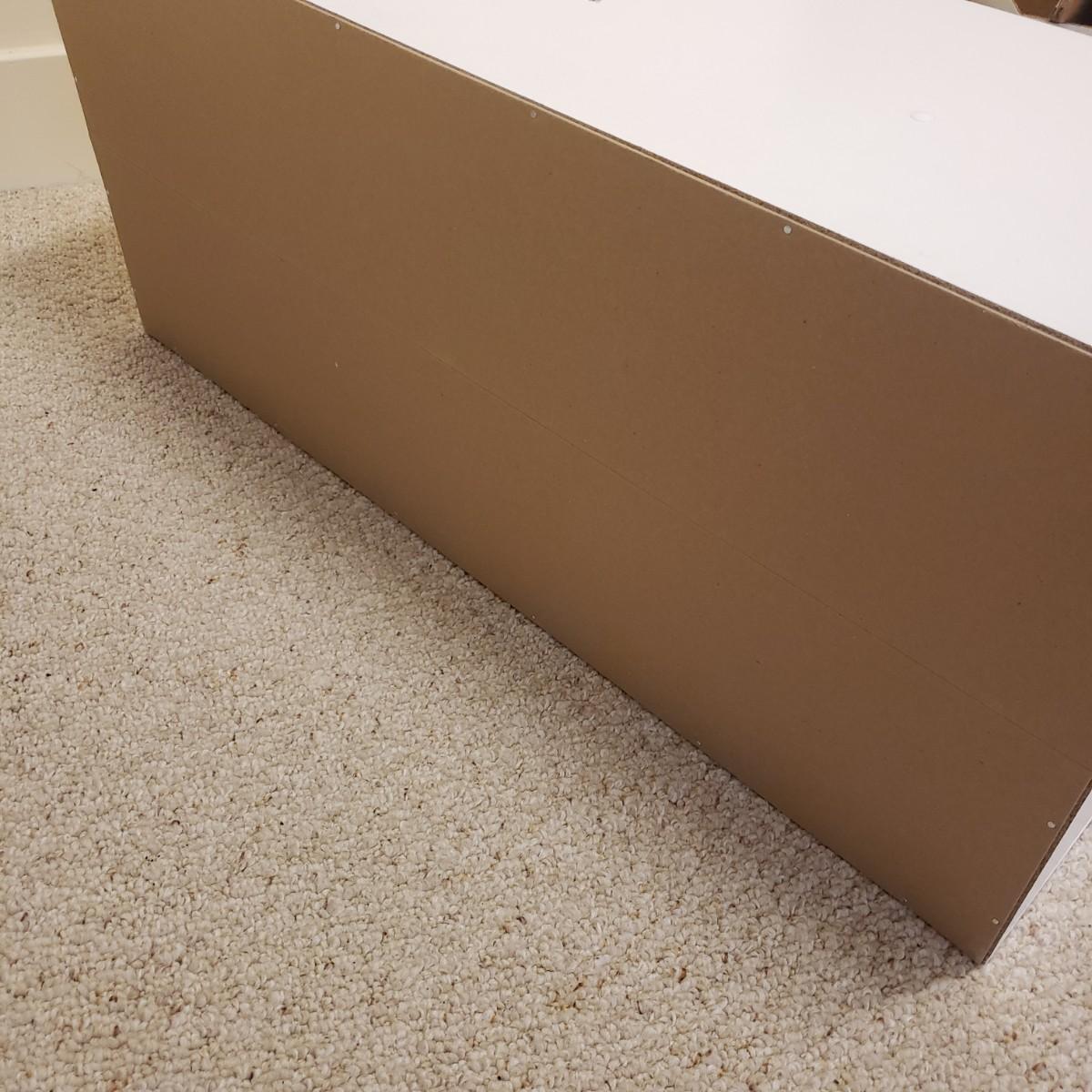 This four-piece lot contains cubed storage organizers. Each unit measures 36" x 11.5" x 16"H. One cube opening measures approximately 8" x 7". One shelf has the white plastic screw cover missing. They are made from pressed wood with a laminate covering.