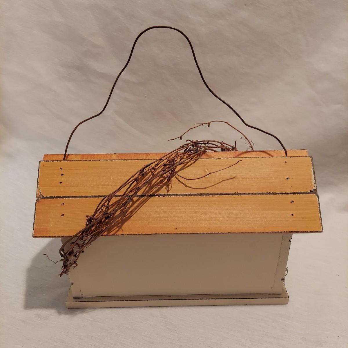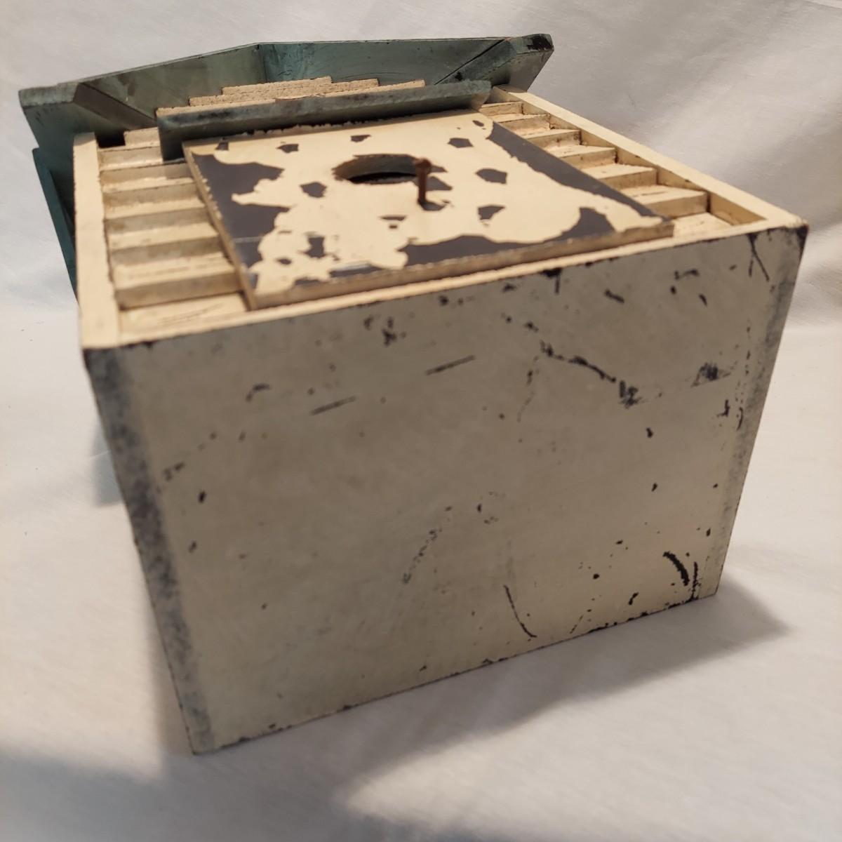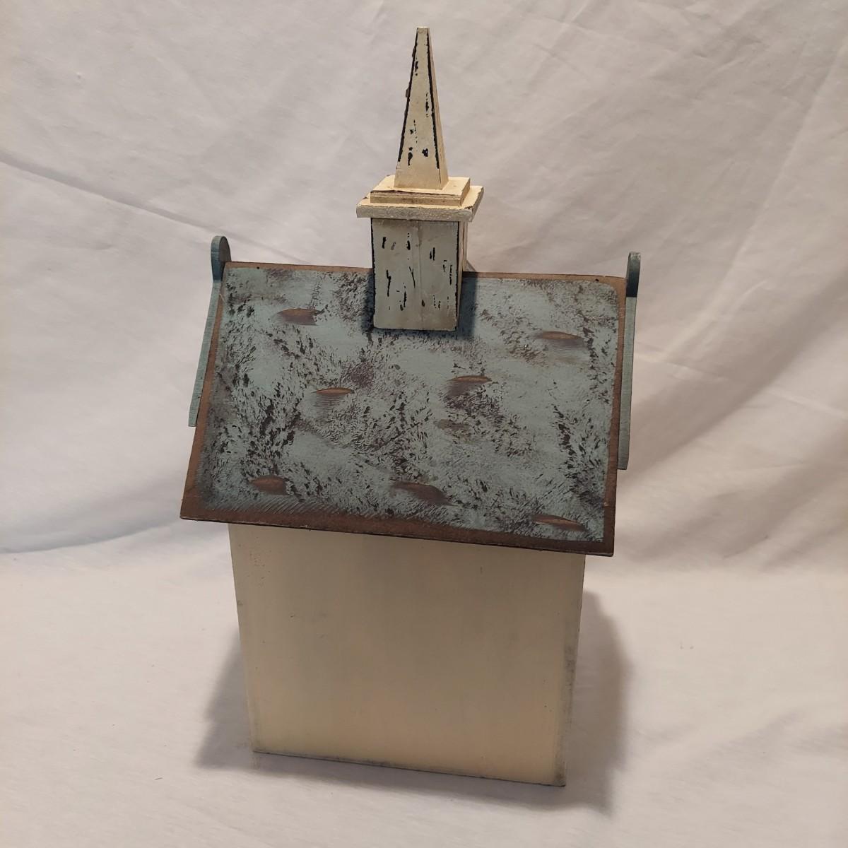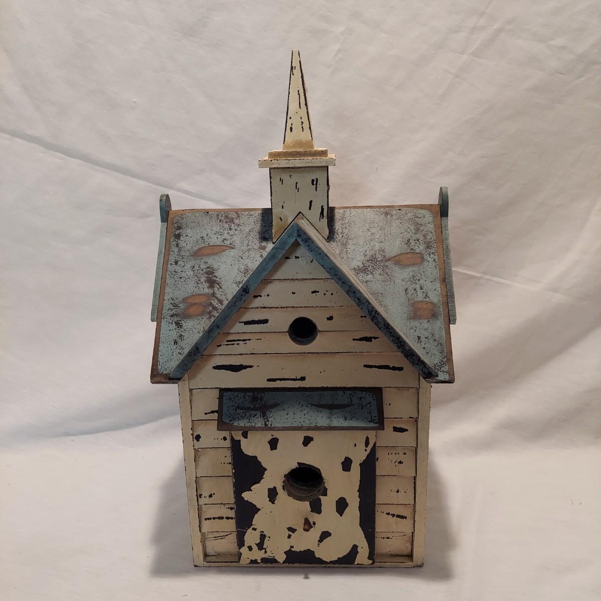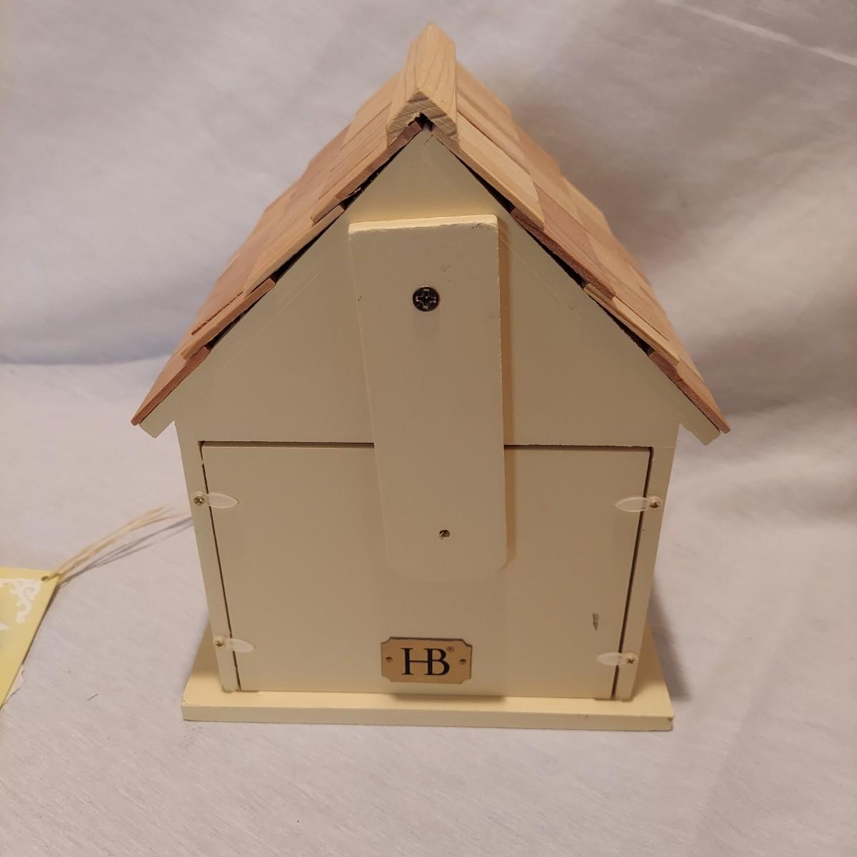 Four decorative bird houses made of wood and metal, plus a paperback book about making bird houses and feeders. The shortest bird house is 6"H and the tallest is 18.5"H. Shipping available