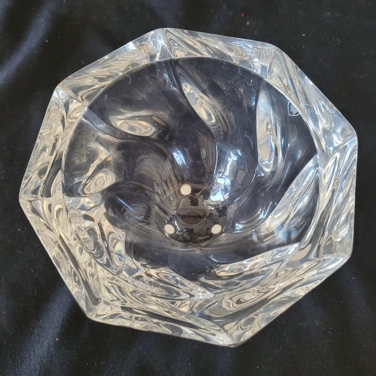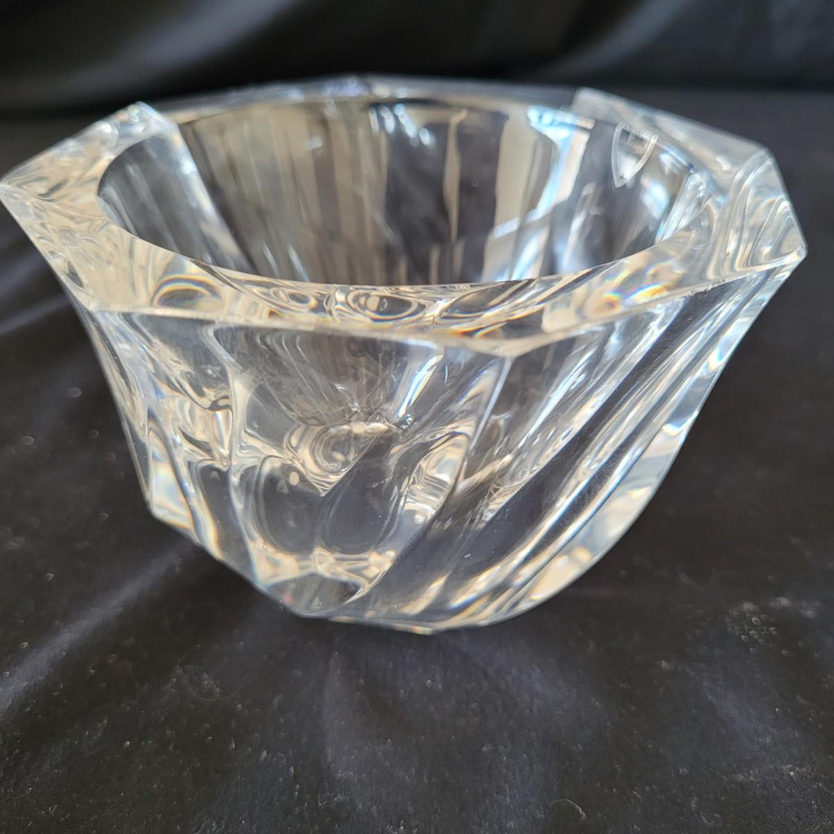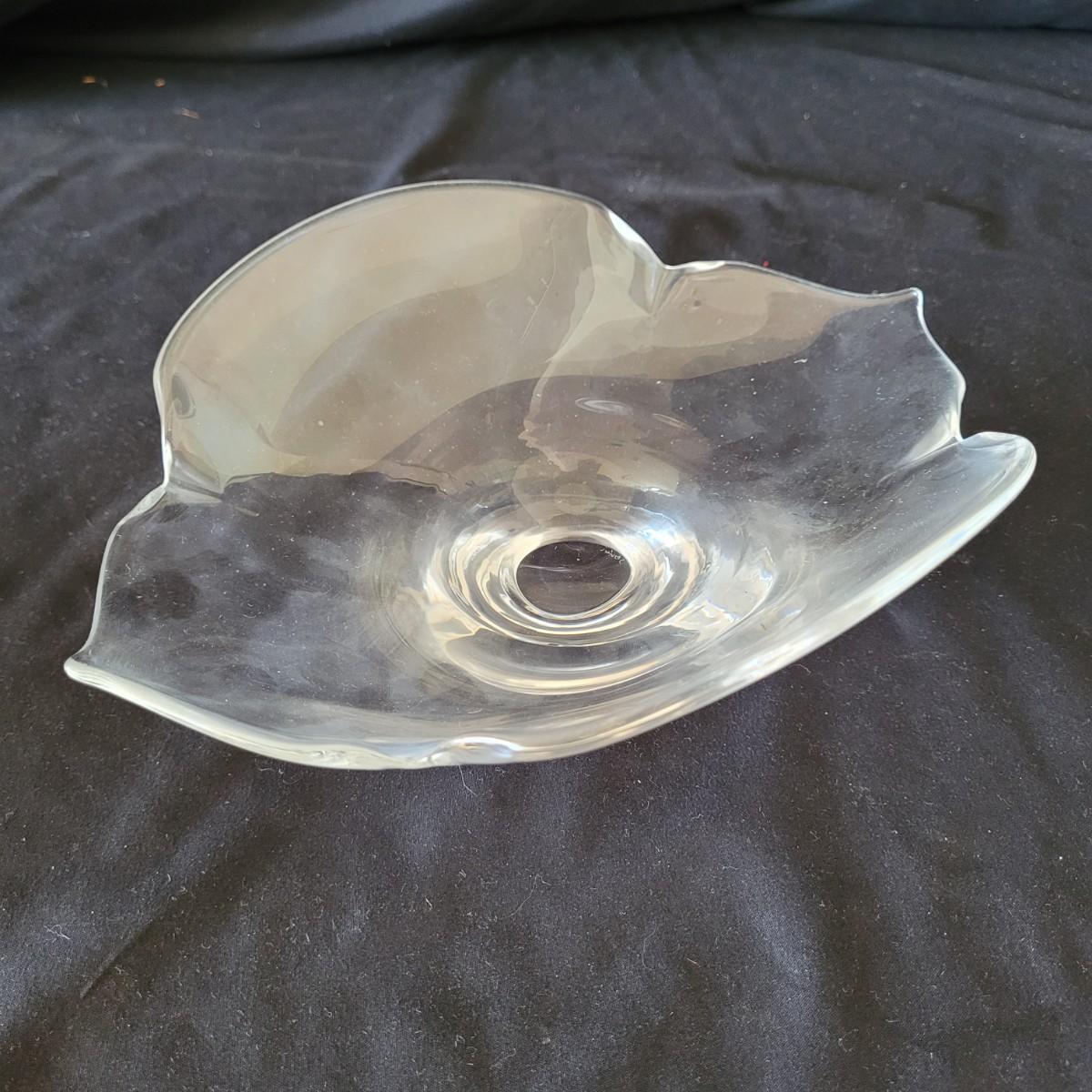 This lot includes four decorative glass pieces. The first item is a glass vase style vessel engraved with birds, measuring 5" x 5" x 5"H. The second piece is a spiraled glass bowl signed “Orrefors”. It is made from very thick glass with a twisted design and measures 5" x 5" x 3.5"H. The third item is a delicate leaf style glass serving bowl signed “Steuben”. It has thin curved edges resembling leaves and measures 10" x 7" x 3.5"H. And the last item is a thick glass ash tray. It is very heavy and features a groove for resting cigars or cigarettes. The ash tray measures 6.5" x 6.5" x 3"H. All pieces are signed.
