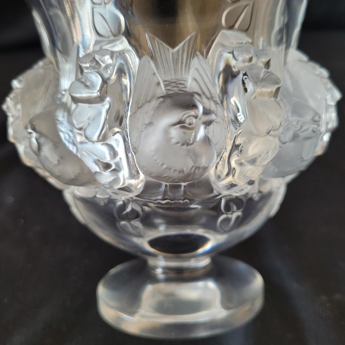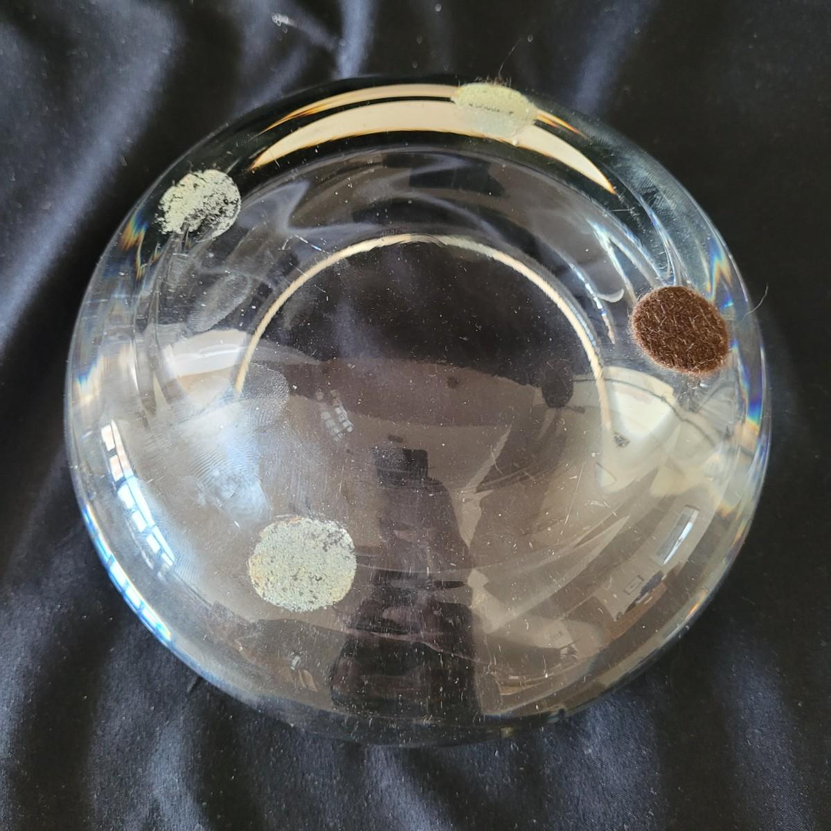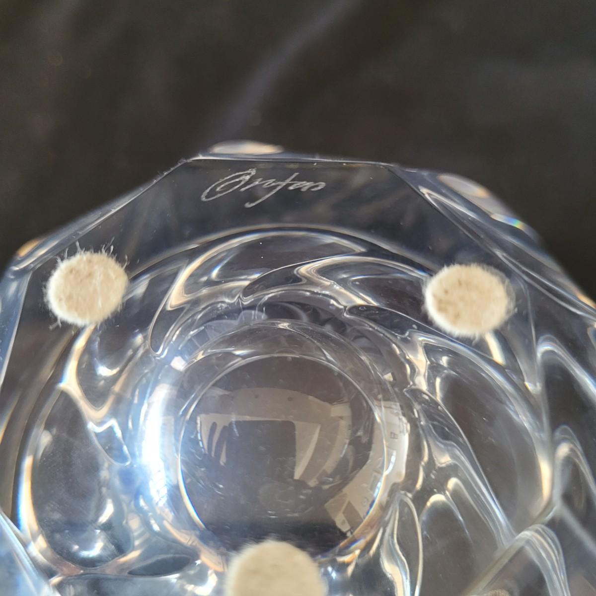 This lot includes four decorative glass pieces. The first item is a glass vase style vessel engraved with birds, measuring 5" x 5" x 5"H. The second piece is a spiraled glass bowl signed “Orrefors”. It is made from very thick glass with a twisted design and measures 5" x 5" x 3.5"H. The third item is a delicate leaf style glass serving bowl signed “Steuben”. It has thin curved edges resembling leaves and measures 10" x 7" x 3.5"H. And the last item is a thick glass ash tray. It is very heavy and features a groove for resting cigars or cigarettes. The ash tray measures 6.5" x 6.5" x 3"H. All pieces are signed.