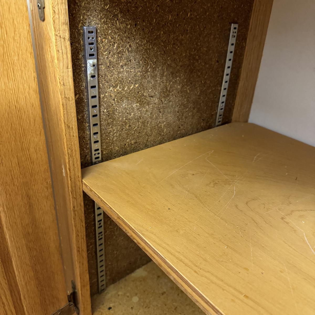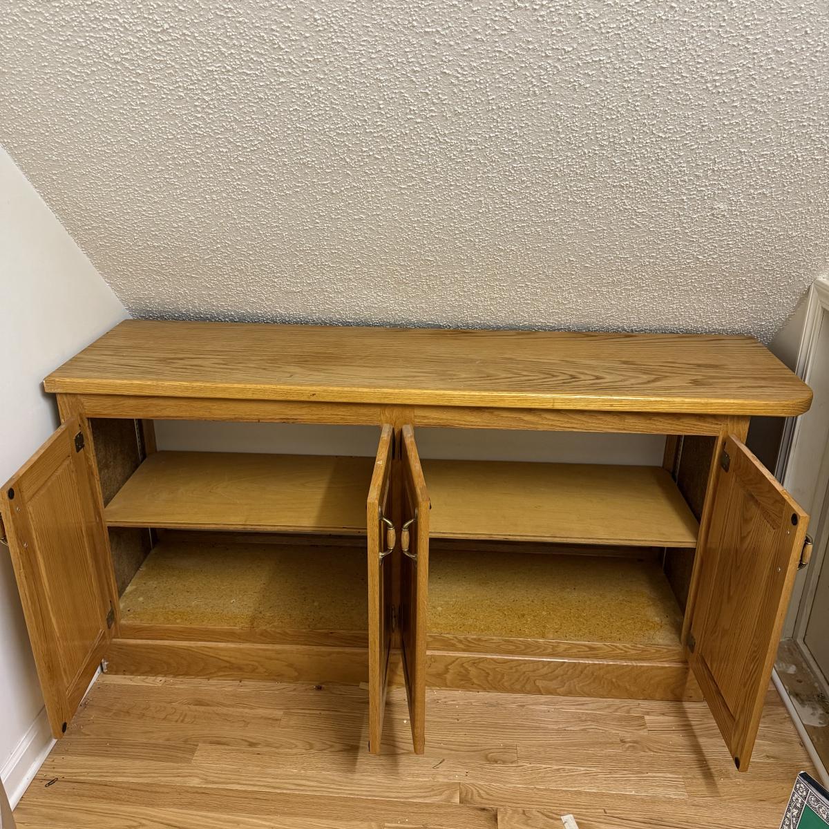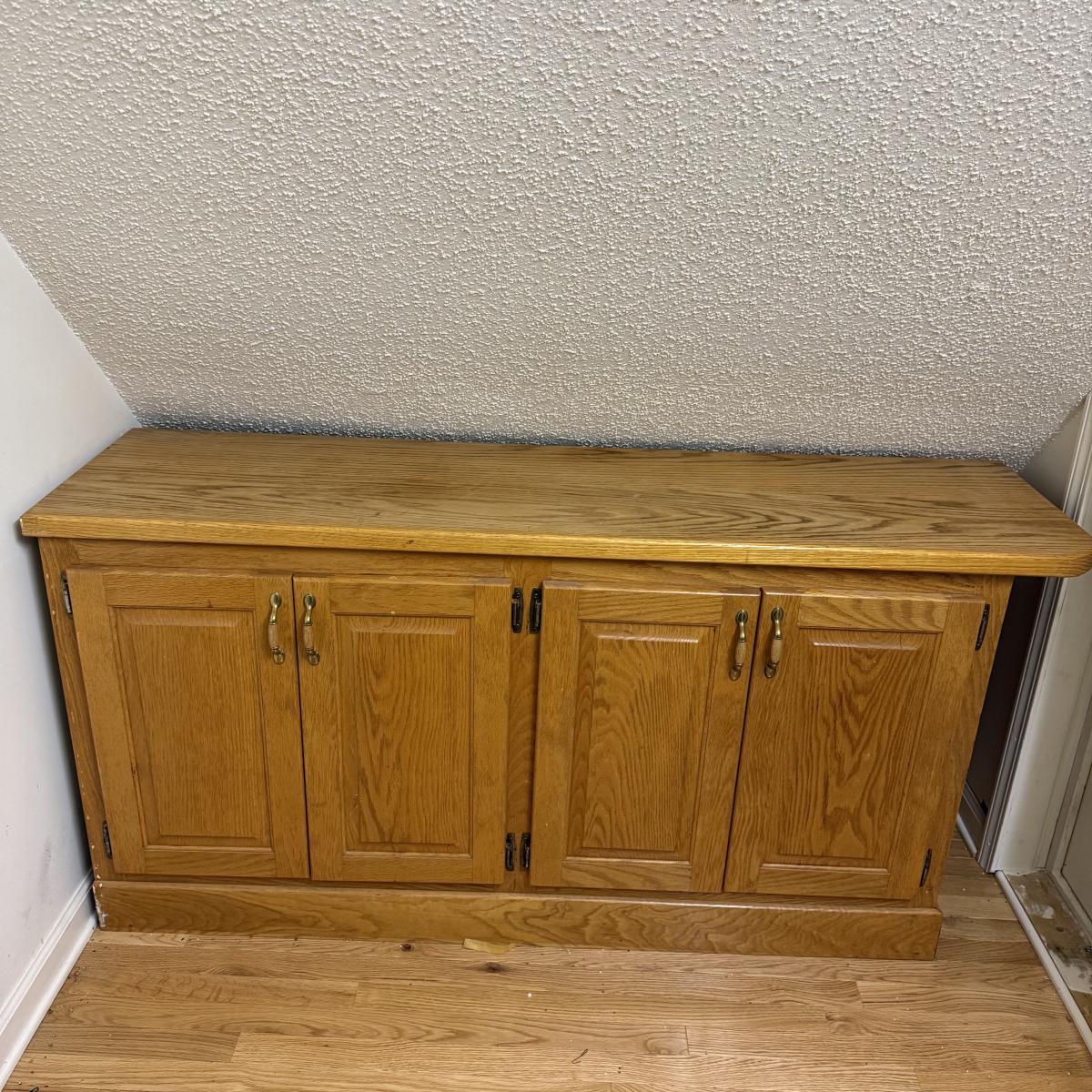 One wooden four door cabinet. Each cabinet has two shelves, and you can adjust the height of one. The top of the cabinet is a flat piece of finished wood, it looks attached, but it is not and its placement can be adjusted. This item measures 63.5” x 17.75” x 31.5”H. Local pick up only. Winning bidder must bring assistance to help move and load this item due to its weight and/or size. Item is located up one flight of stairs and there are six steps to go down outside as well.