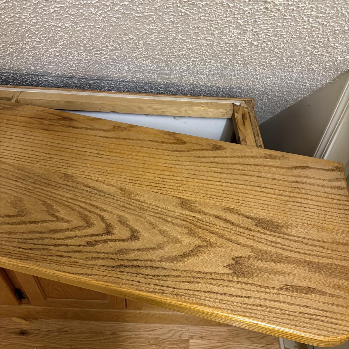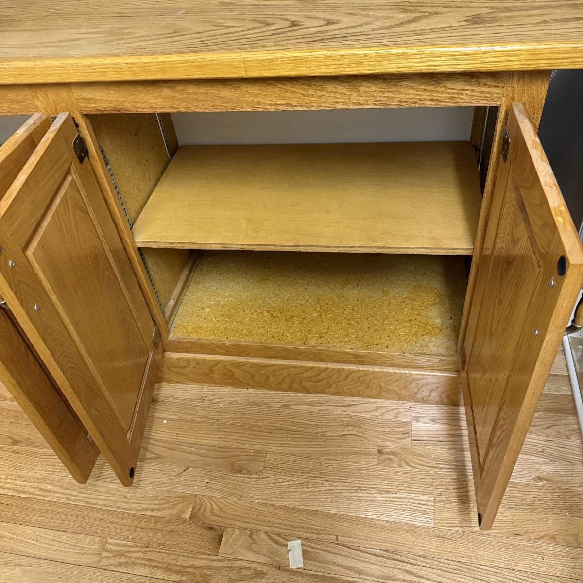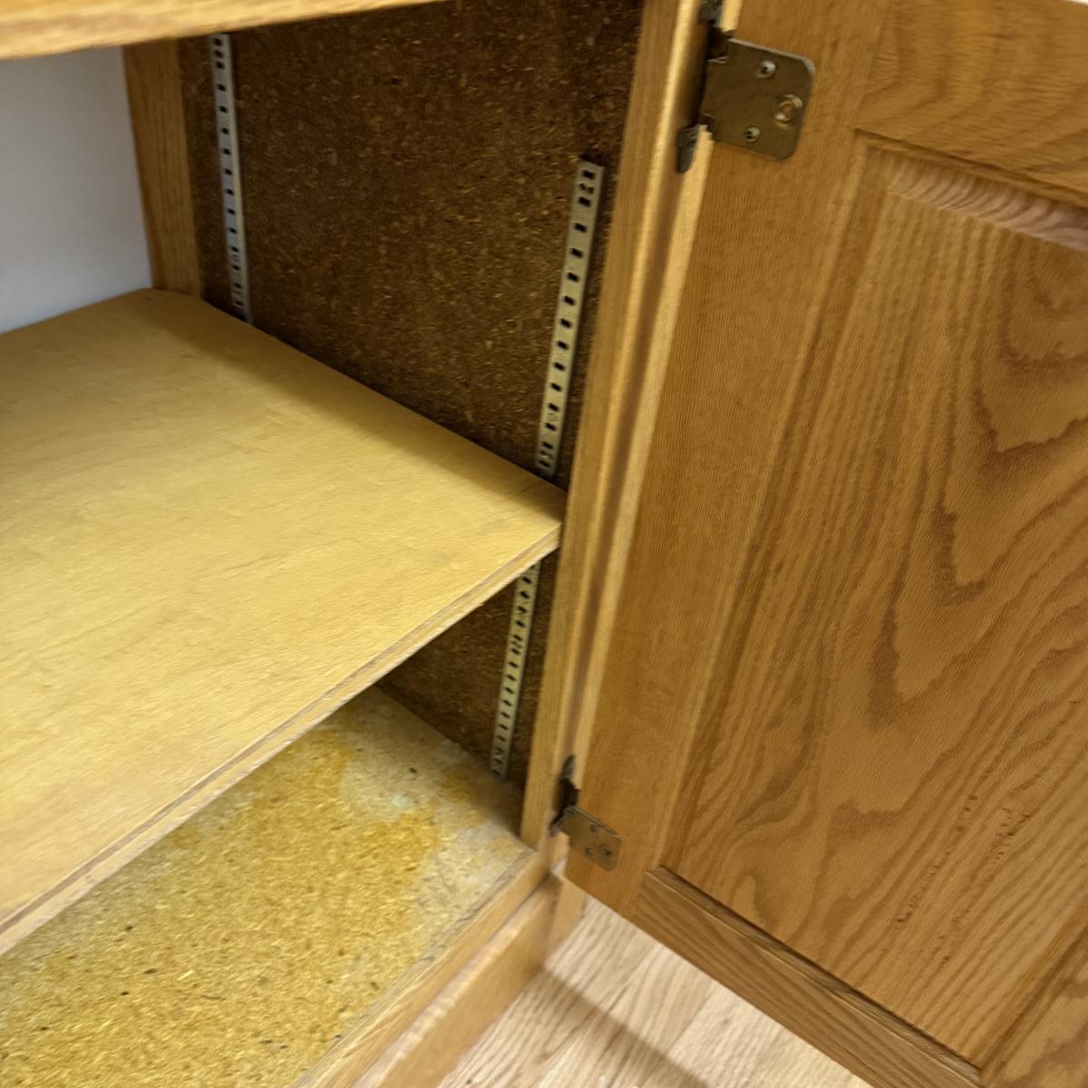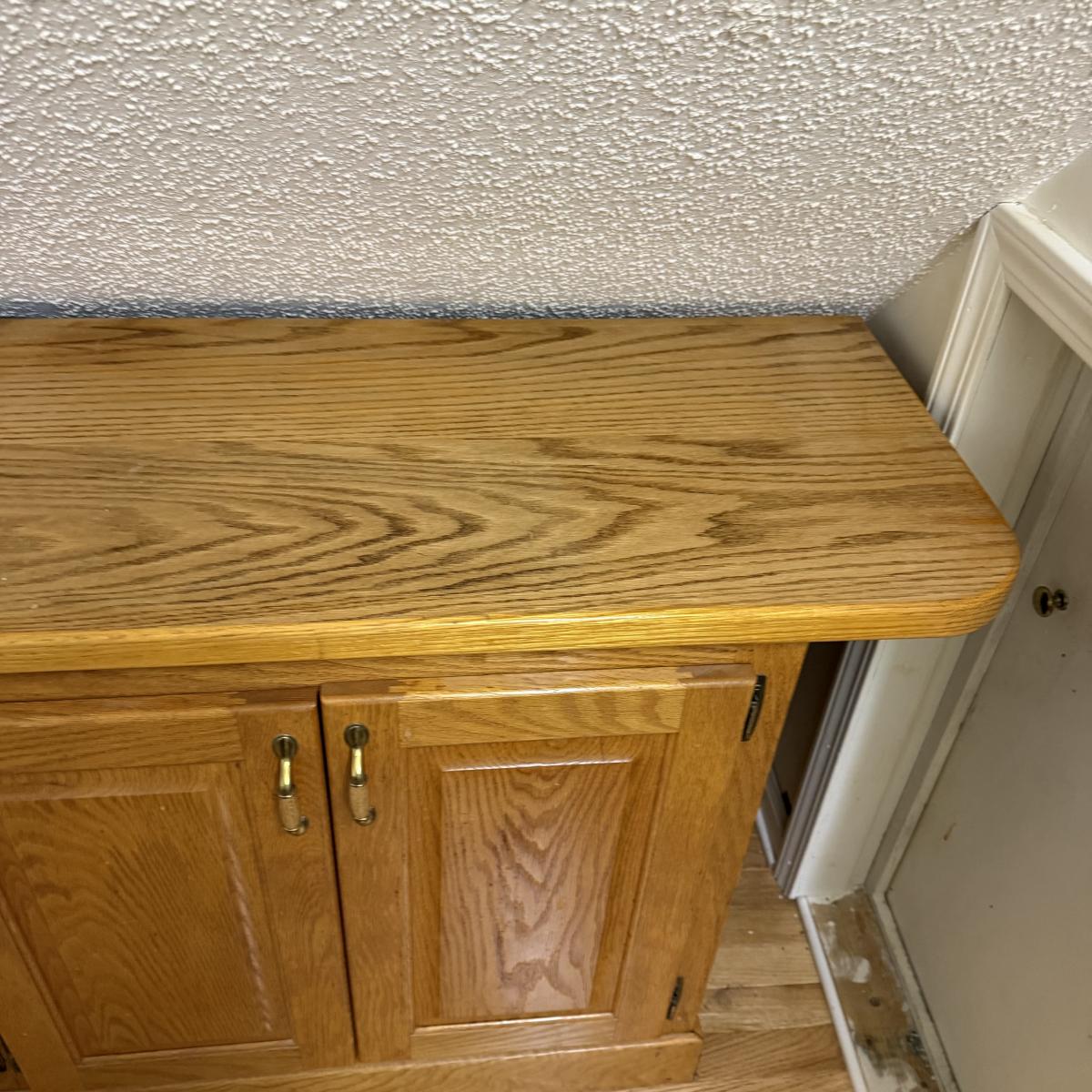 One wooden four door cabinet. Each cabinet has two shelves, and you can adjust the height of one. The top of the cabinet is a flat piece of finished wood, it looks attached, but it is not and its placement can be adjusted. This item measures 63.5” x 17.75” x 31.5”H. Local pick up only. Winning bidder must bring assistance to help move and load this item due to its weight and/or size. Item is located up one flight of stairs and there are six steps to go down outside as well.