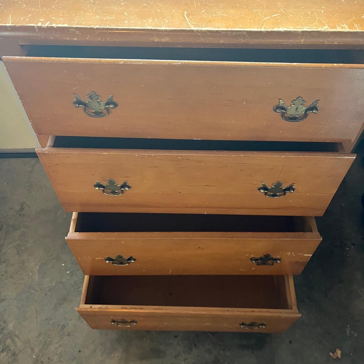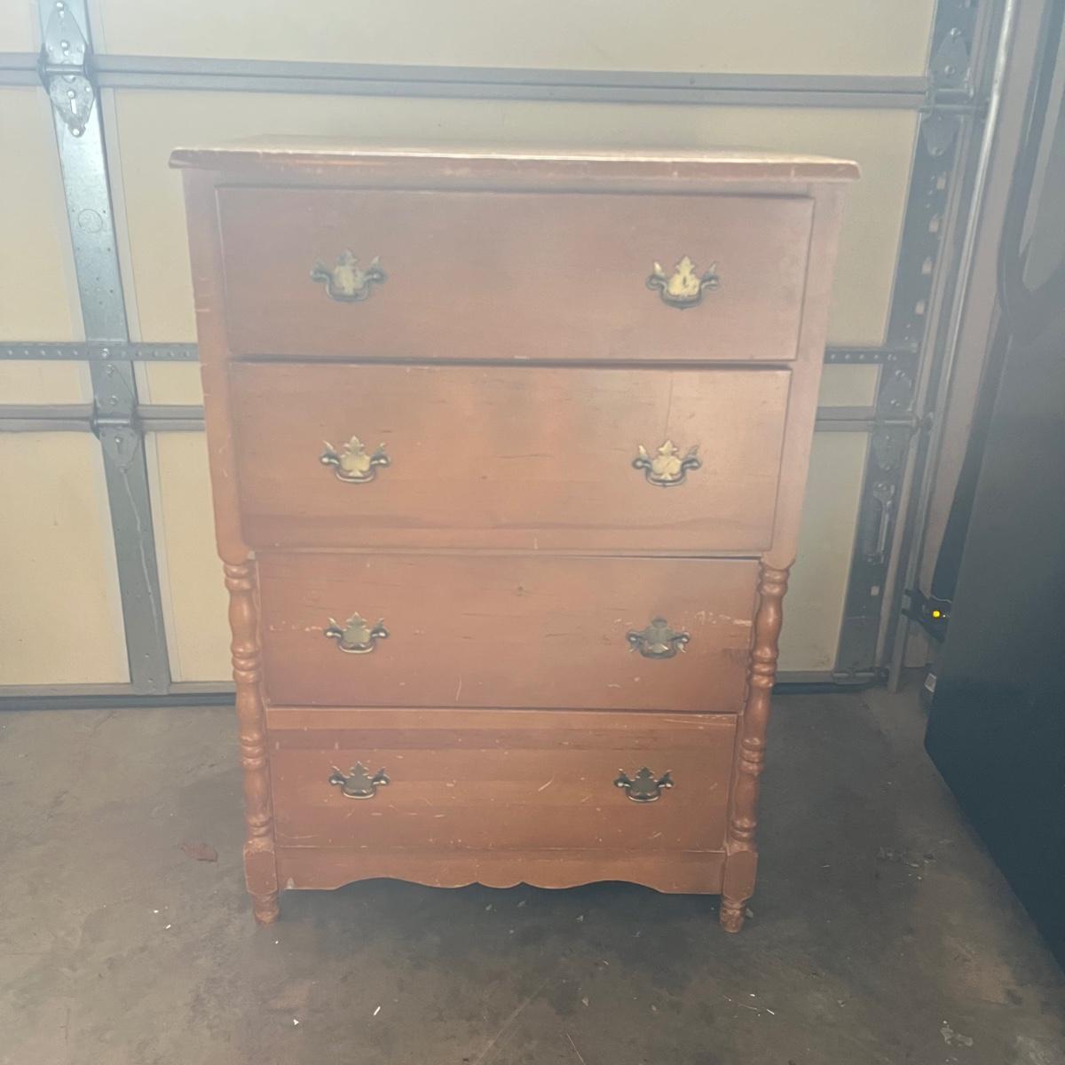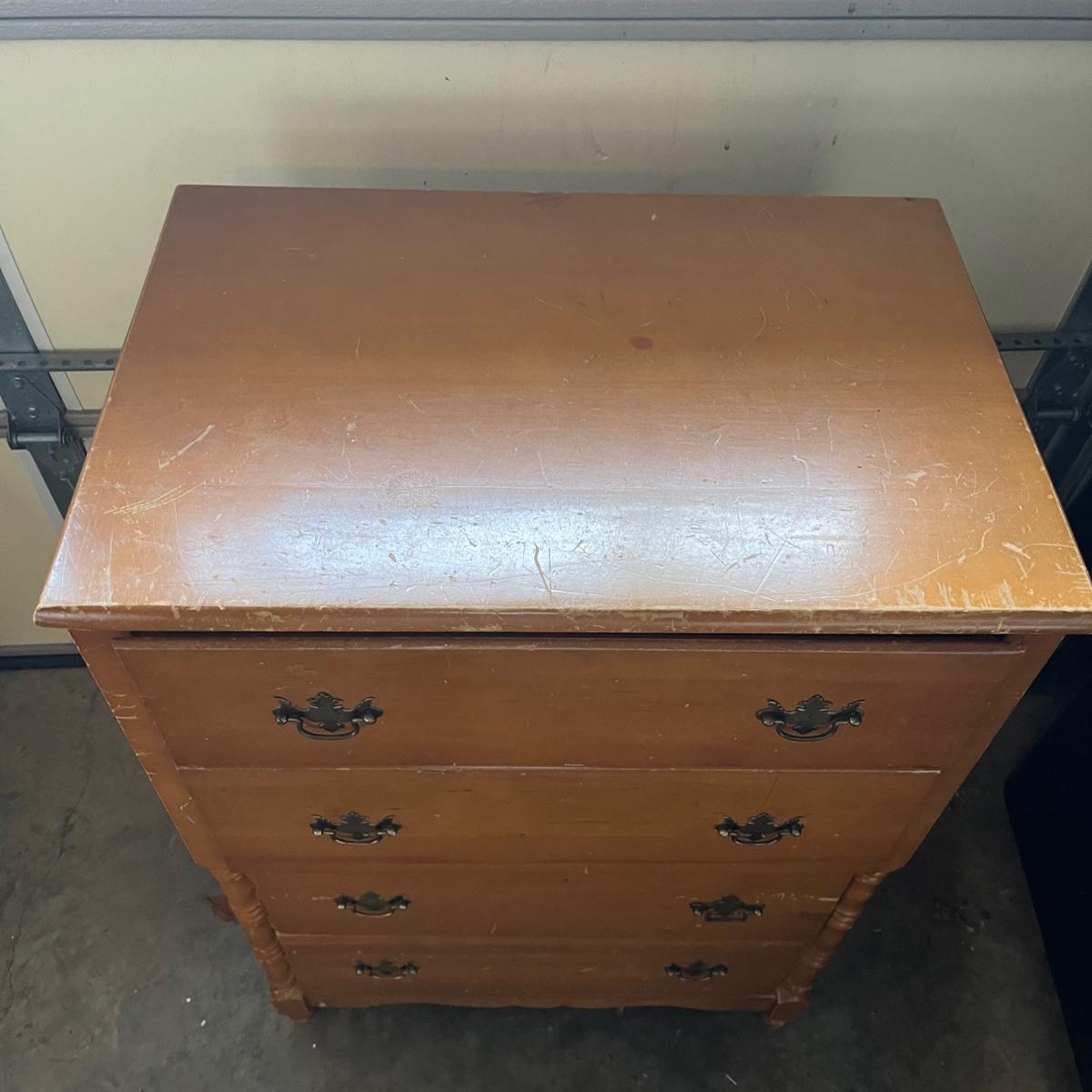 Lot includes a four dovetailed drawer chest of drawers that measures 18.5” x 28” x 40”. Chest has scratches and nicks, see pictures.