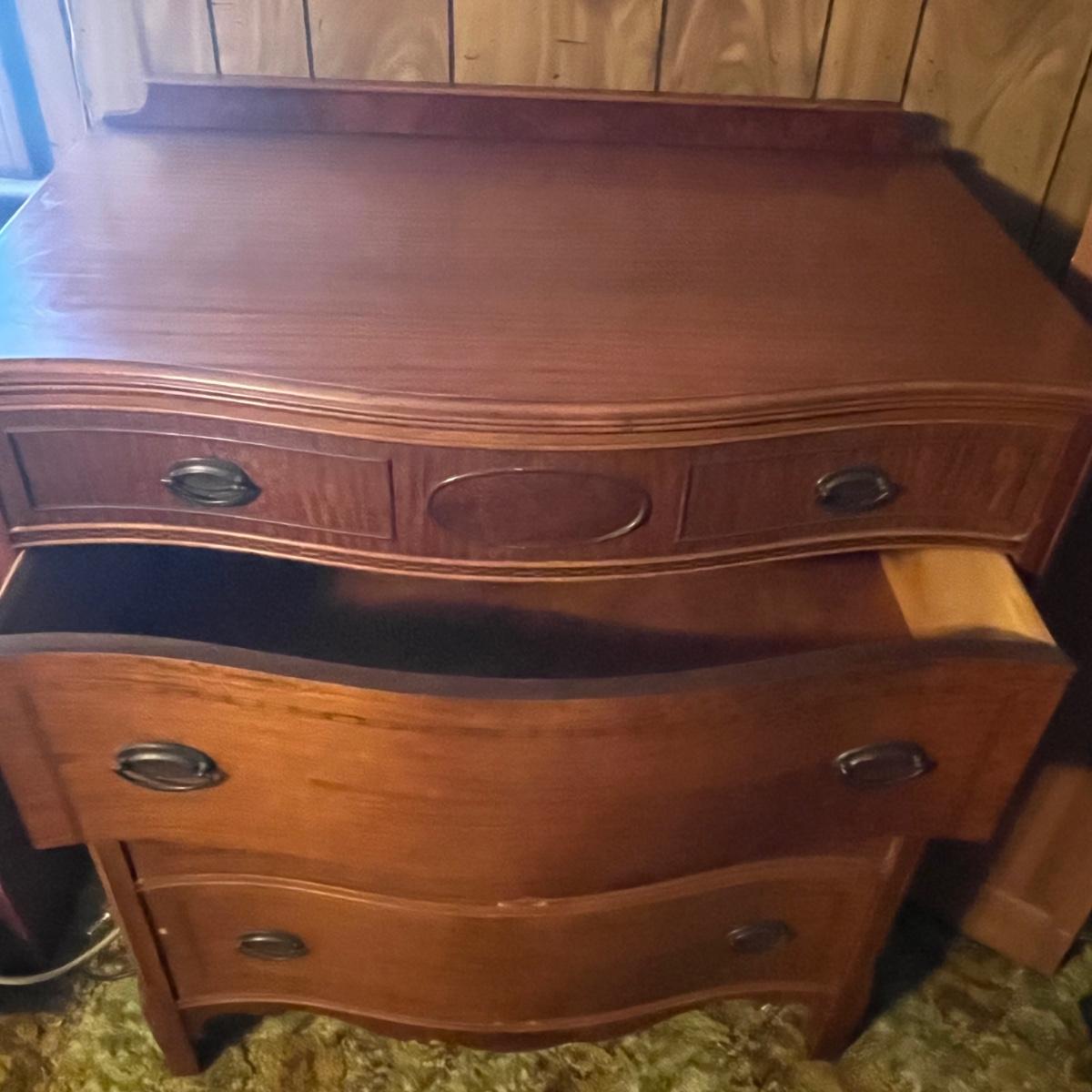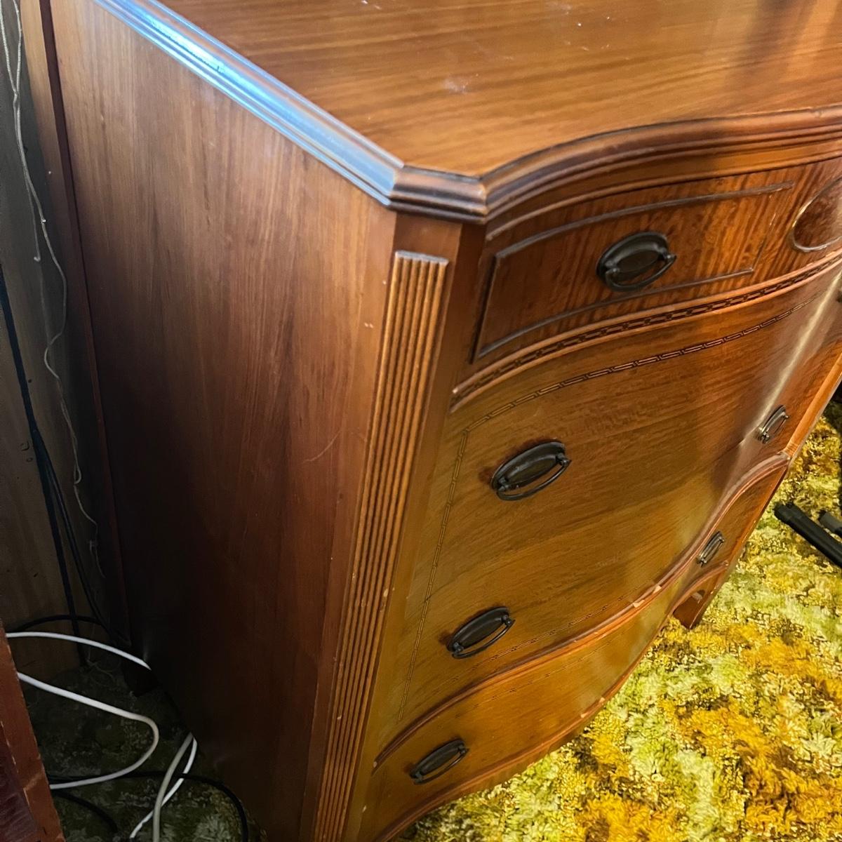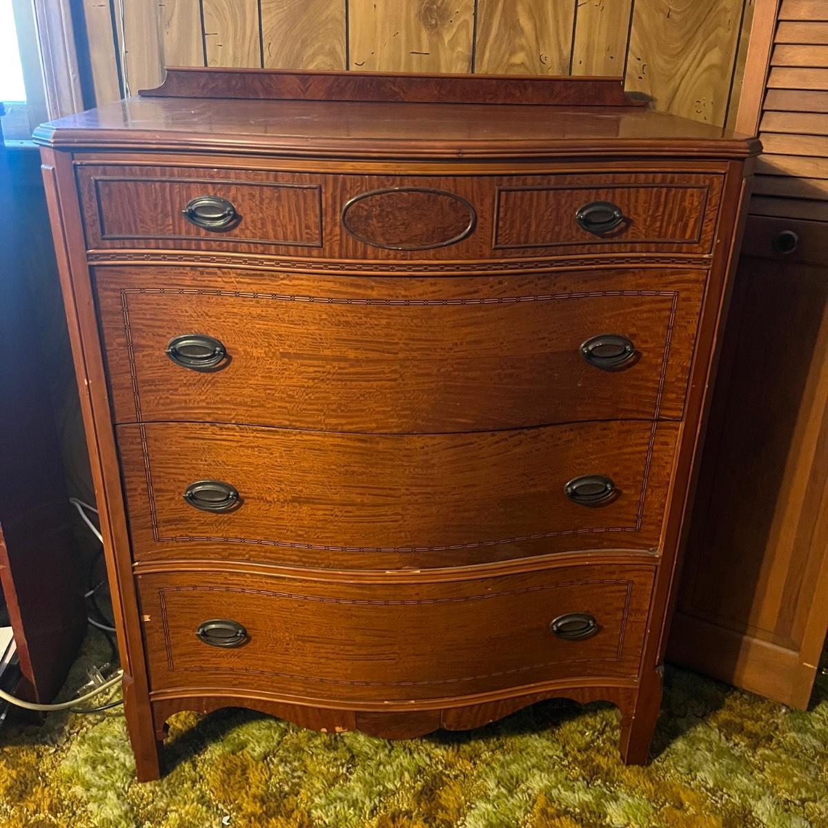 Lot includes a four dovetailed drawer chest of drawers with a veneer finish with inlaid wood. Veneer has a few chips, see pictures. Chest measures 36” x 20” x 44”H.