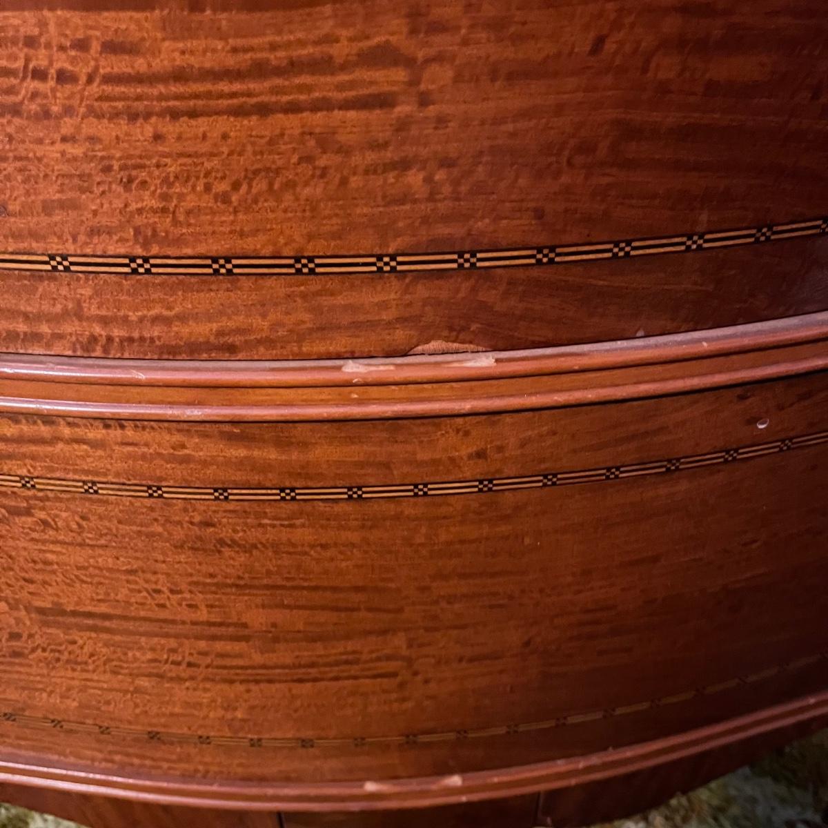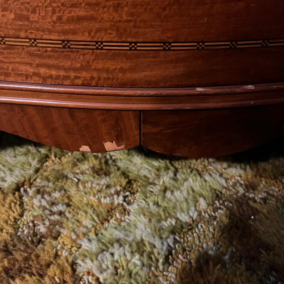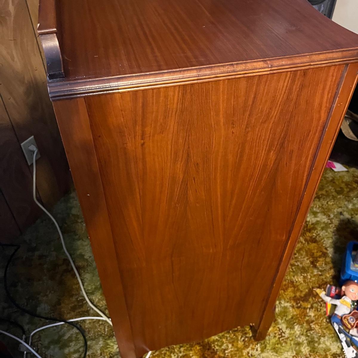 Lot includes a four dovetailed drawer chest of drawers with a veneer finish with inlaid wood. Veneer has a few chips, see pictures. Chest measures 36” x 20” x 44”H.
