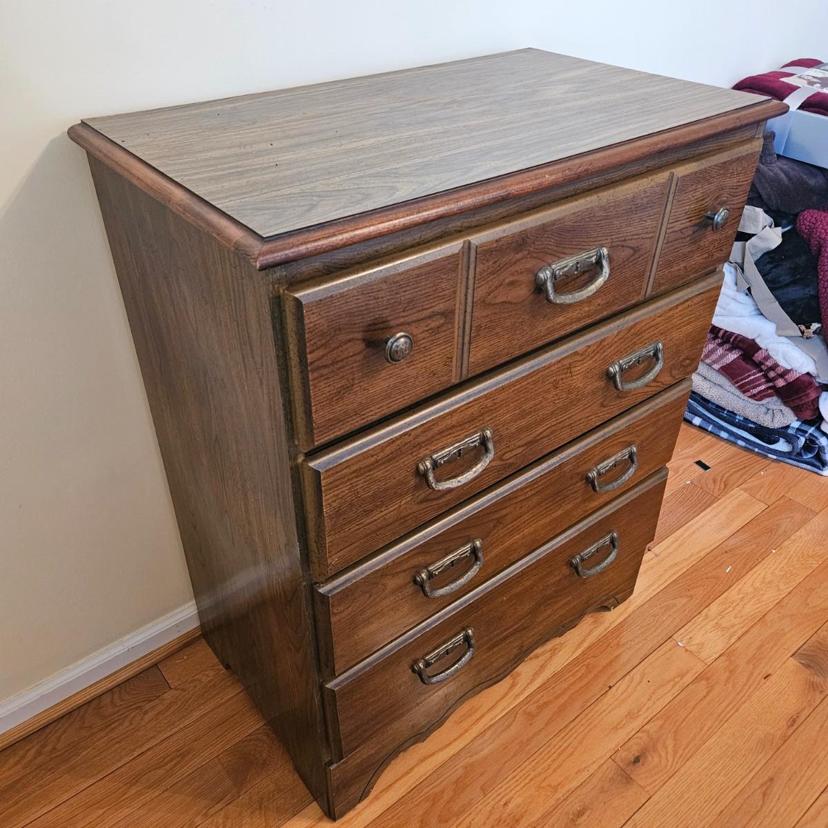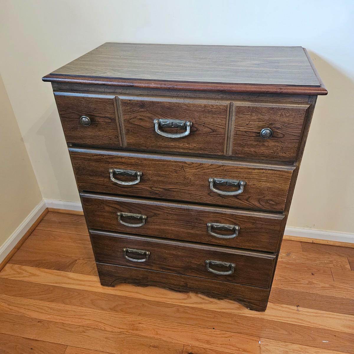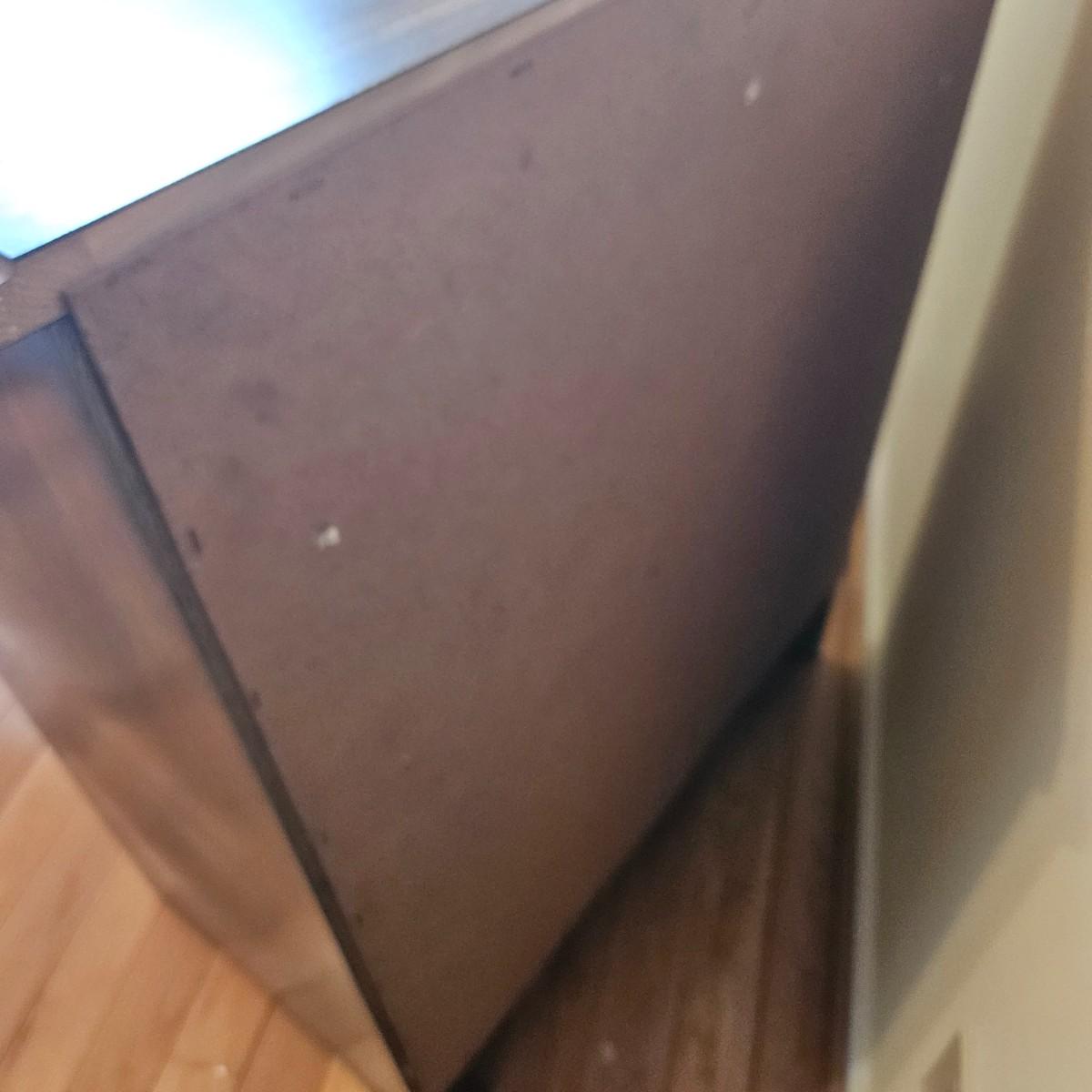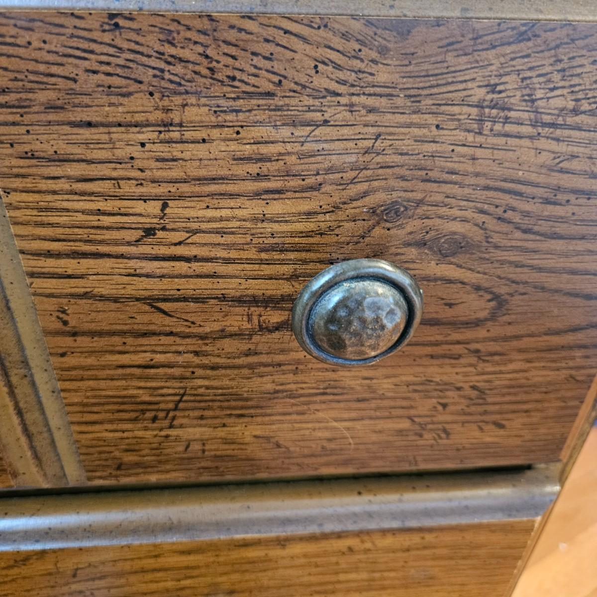 A four door dresser that features brass hardware and measures approximately 31" x 18" x 38"H. It is made of engineered wood with a faux wood veneer. Local pickup only. Winning bidder must bring assistance to help move and load this item due to its weight and/or size.