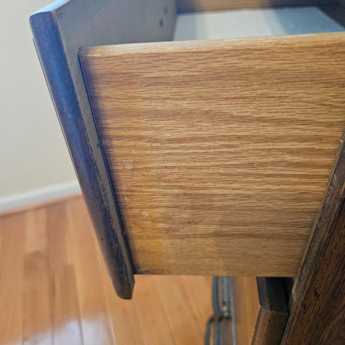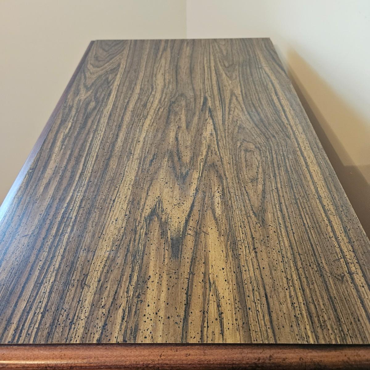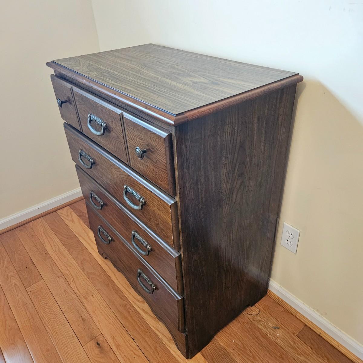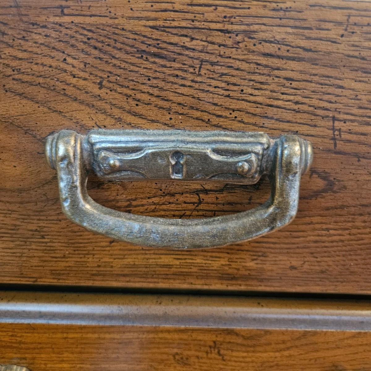 A four door dresser that features brass hardware and measures approximately 31" x 18" x 38"H. It is made of engineered wood with a faux wood veneer. Local pickup only. Winning bidder must bring assistance to help move and load this item due to its weight and/or size.