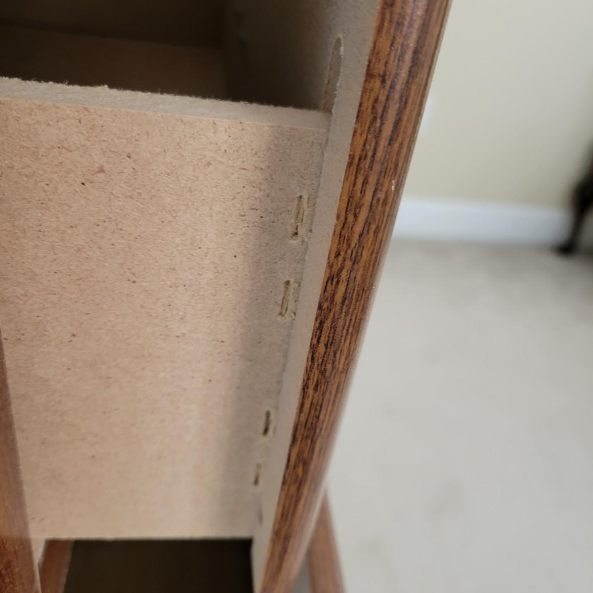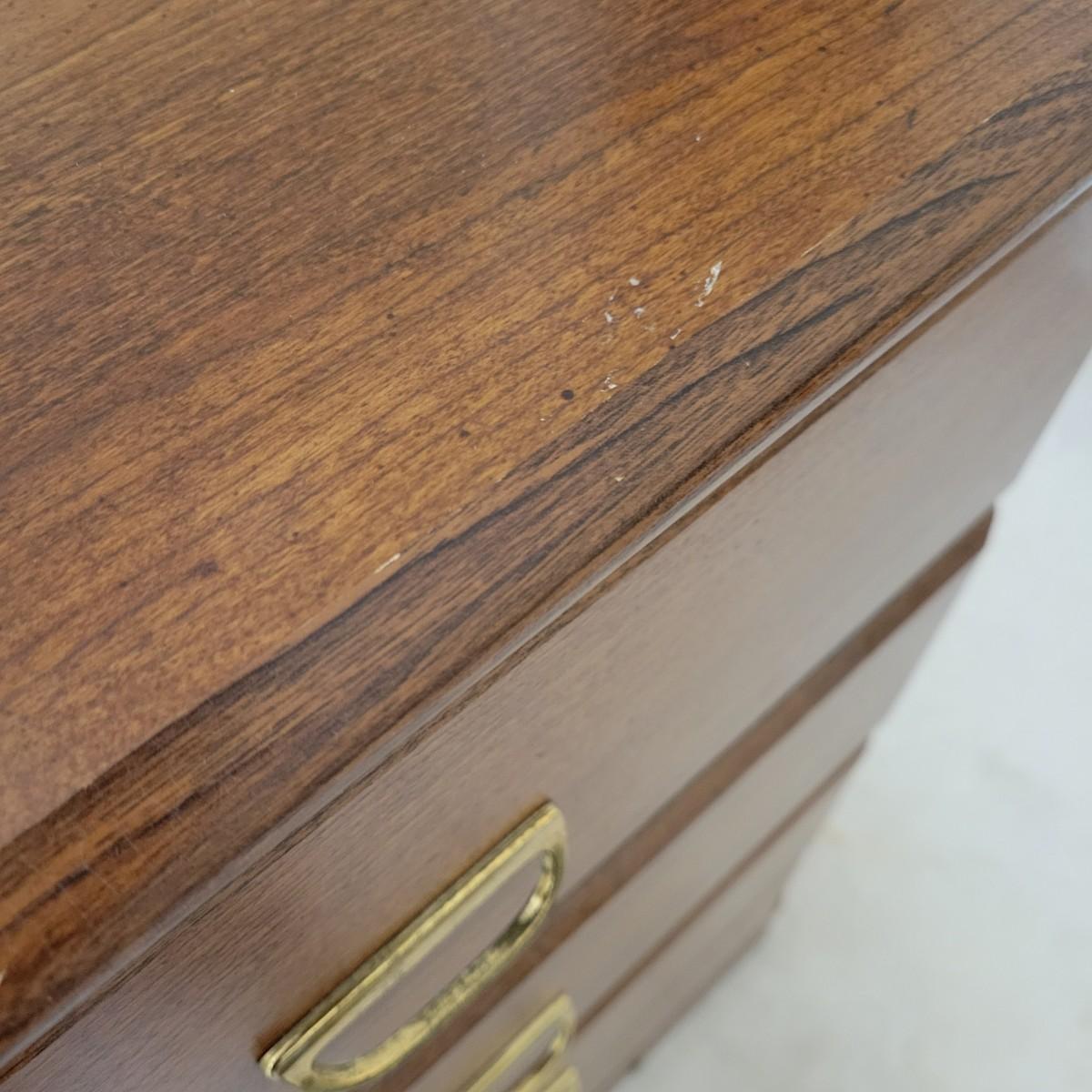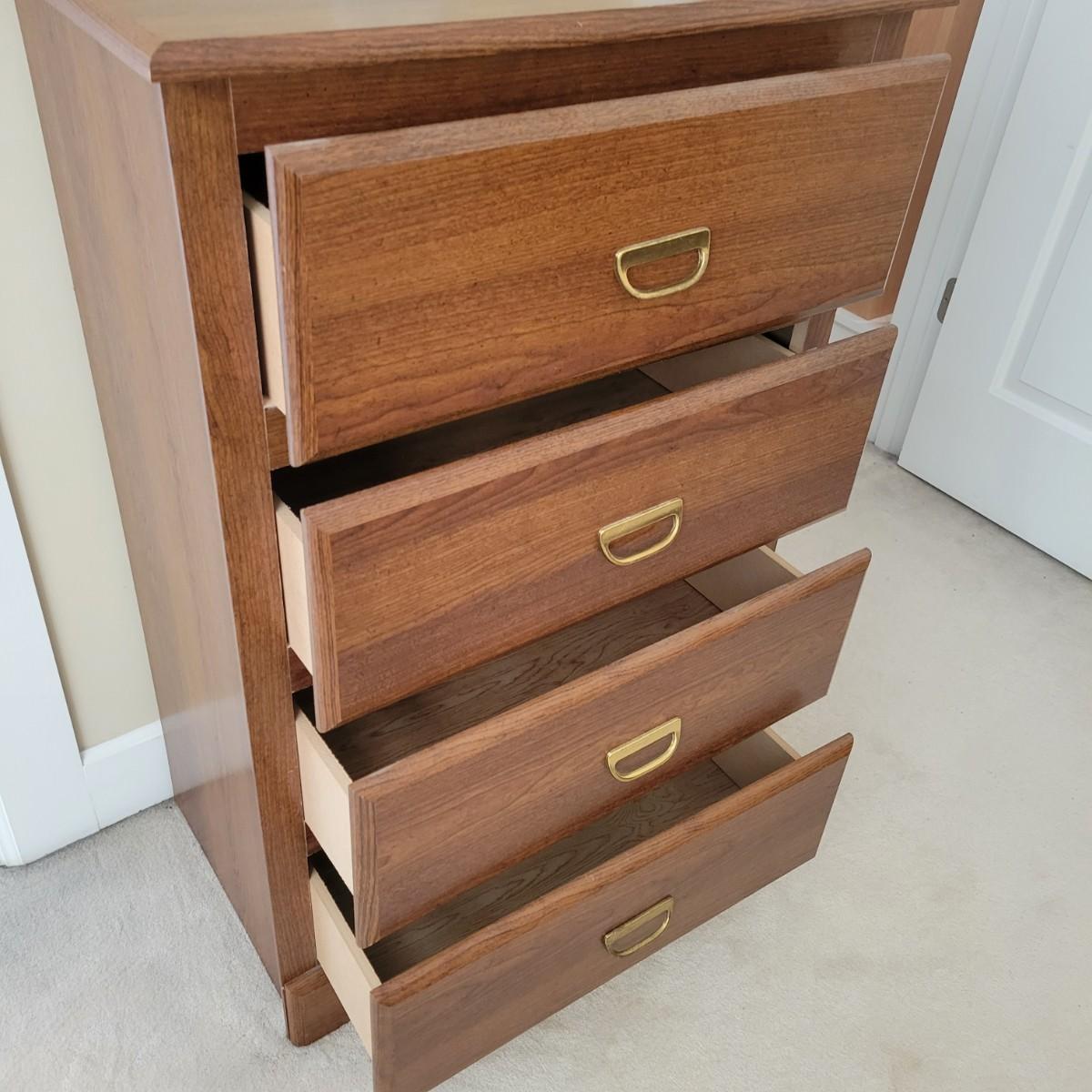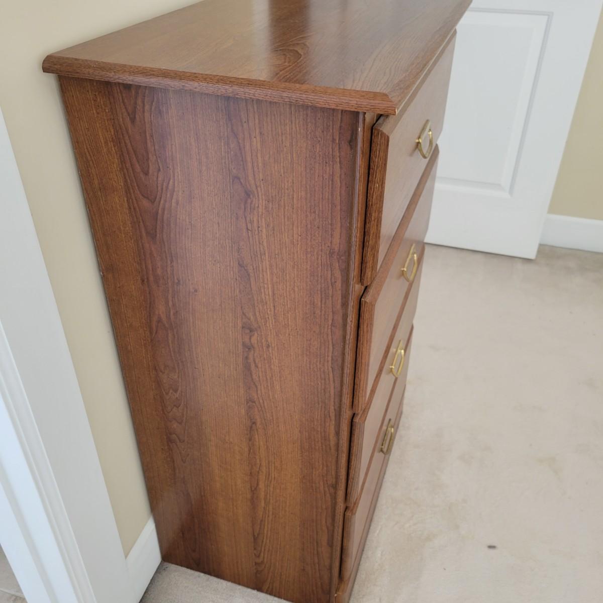A four drawer dresser in good condition with some minor blemishes. This dresser has brass hardware and is constructed of pressed wood that has a faux oak veneer. Measures approximately 25" x 16" x 40". Local pickup only. Winning bidder must bring assistance to help move and load this item due to its weight and/or size. Item will also need to descend a flight of stairs.