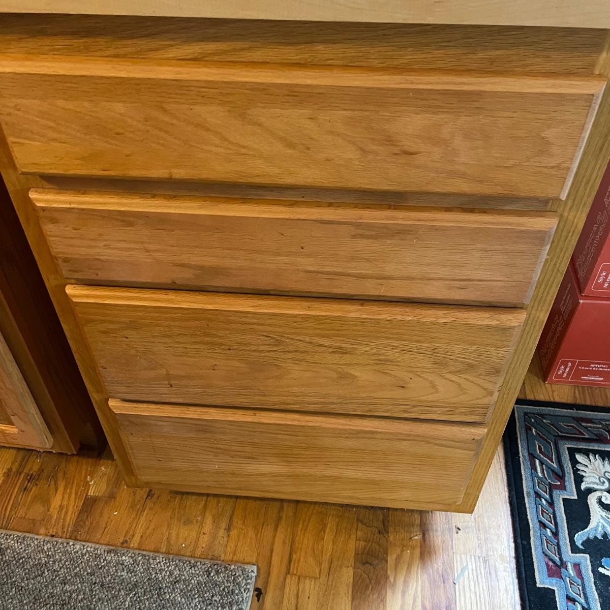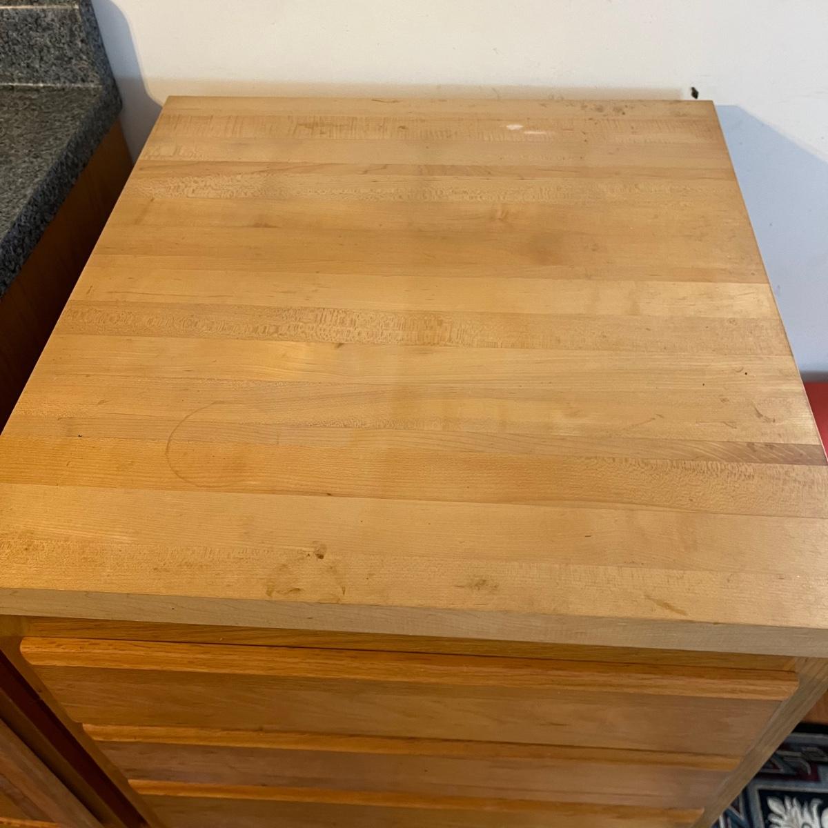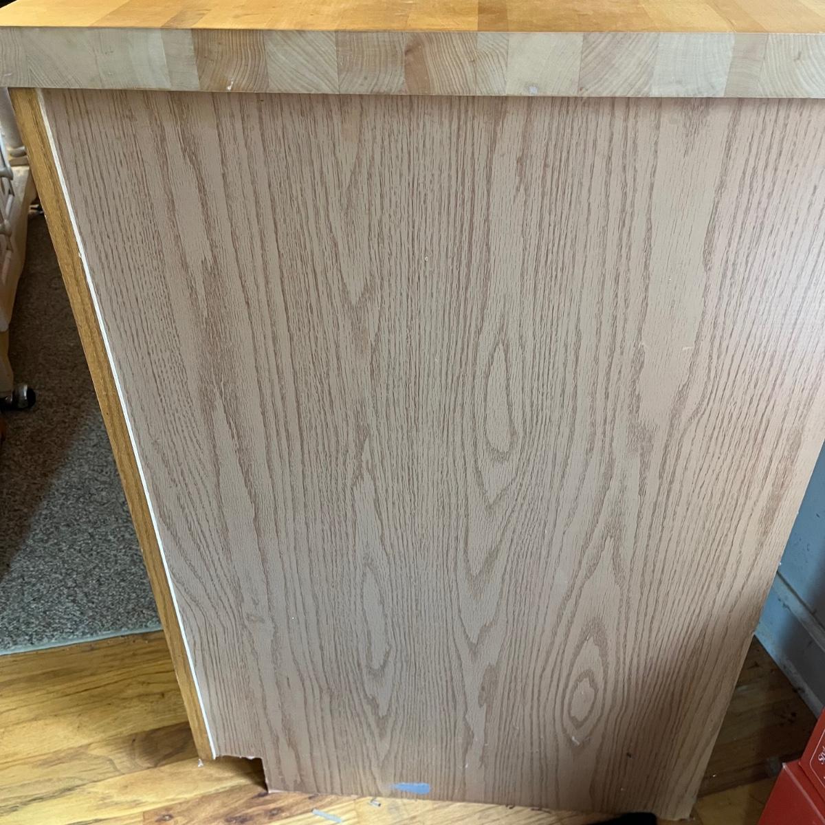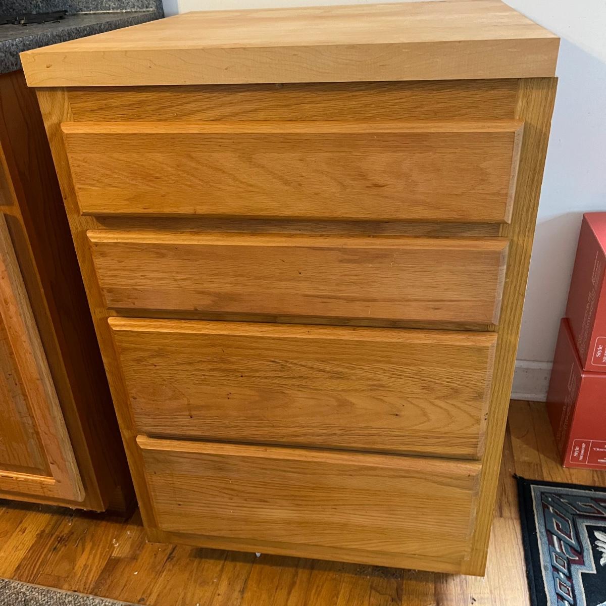 Lot includes a four drawer kitchen cabinet with a butcher block top that is not attached. Cabinet measures 24” x 25” x 36.5”.