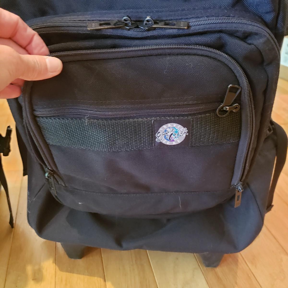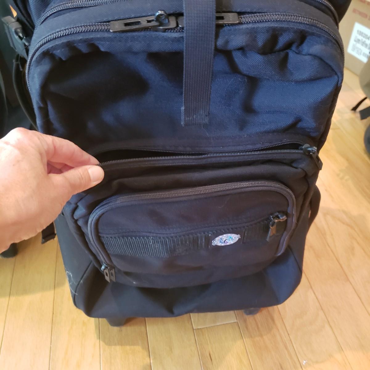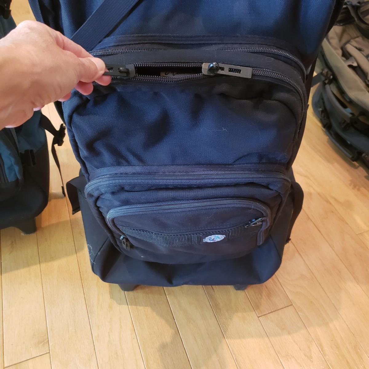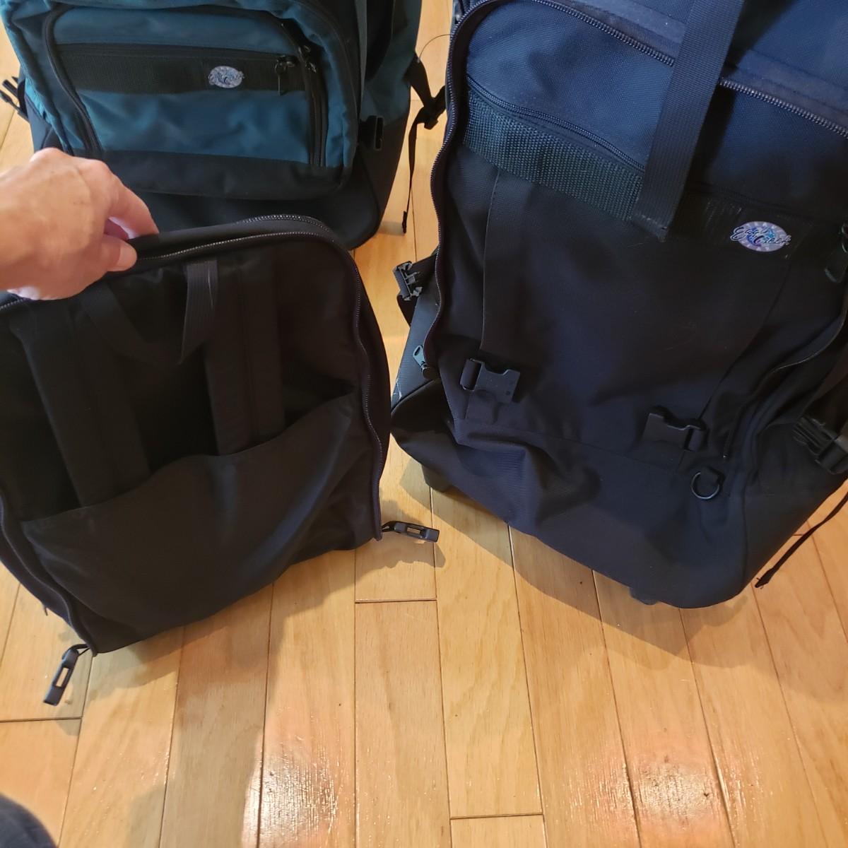 These bags covert from rolling luggage to backpacks. There is so much storage in these bags! The front zippers off into a small backpack measuring 12" x 4" x 14"H. See pictures for details. Also included is a NIB luggage straps and an orange soft handle grip, that is a luggage tag as well. There is a combination lock on the dark blue bag that unfortunately we don't have the code.