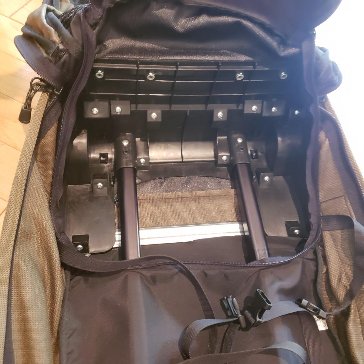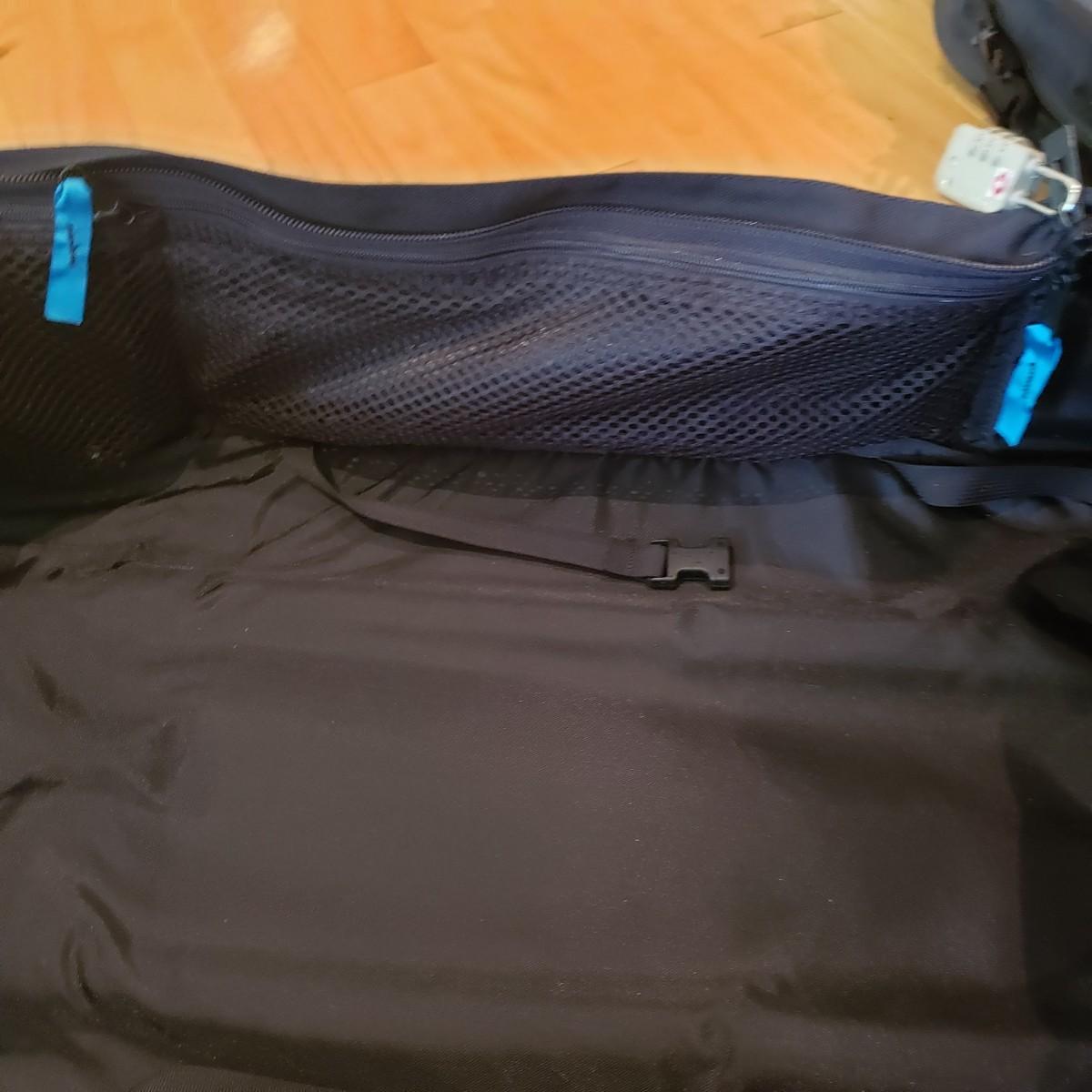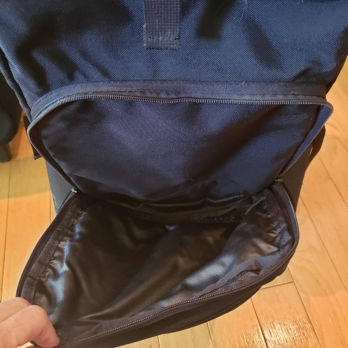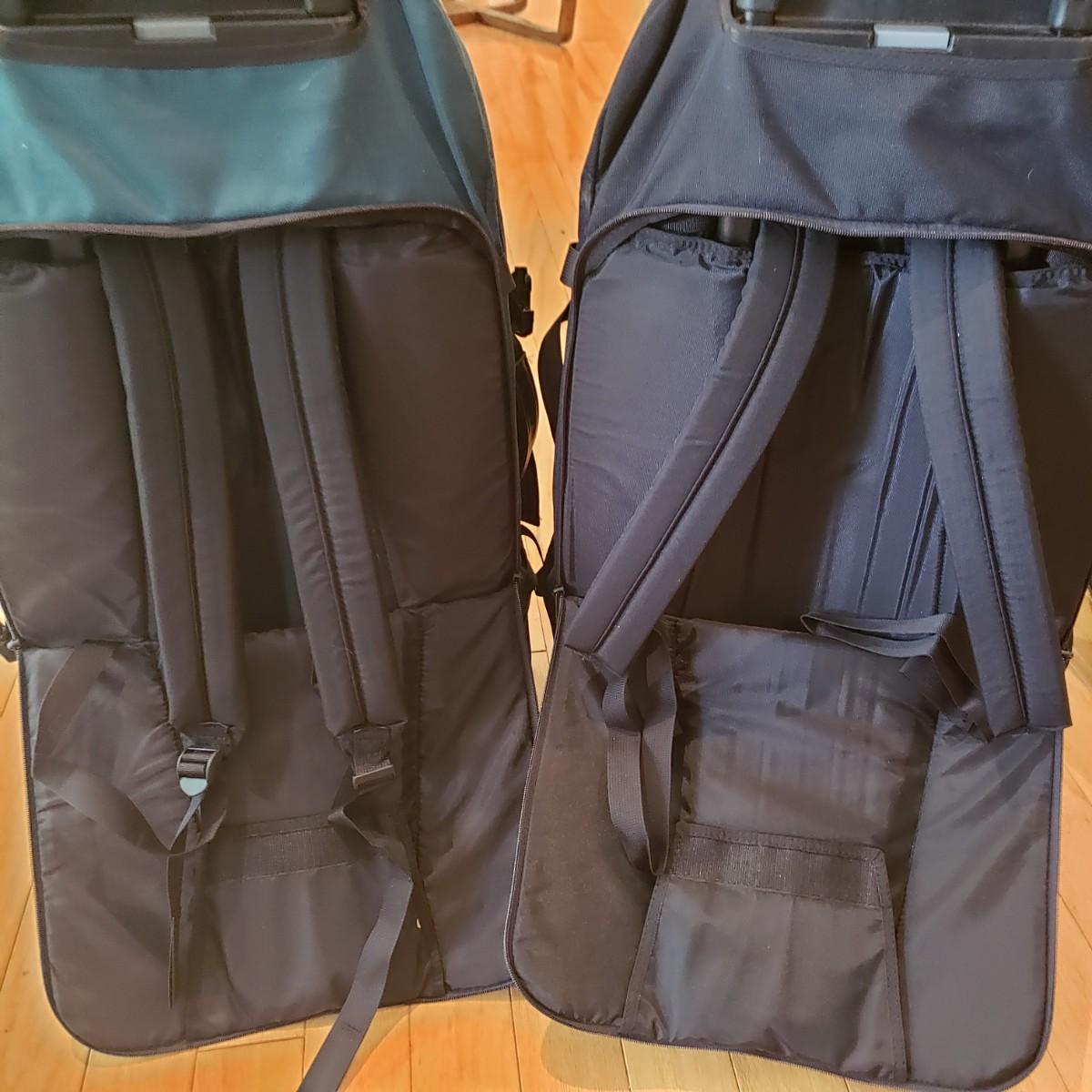 These bags covert from rolling luggage to backpacks. There is so much storage in these bags! The front zippers off into a small backpack measuring 12" x 4" x 14"H. See pictures for details. Also included is a NIB luggage straps and an orange soft handle grip, that is a luggage tag as well. There is a combination lock on the dark blue bag that unfortunately we don't have the code.