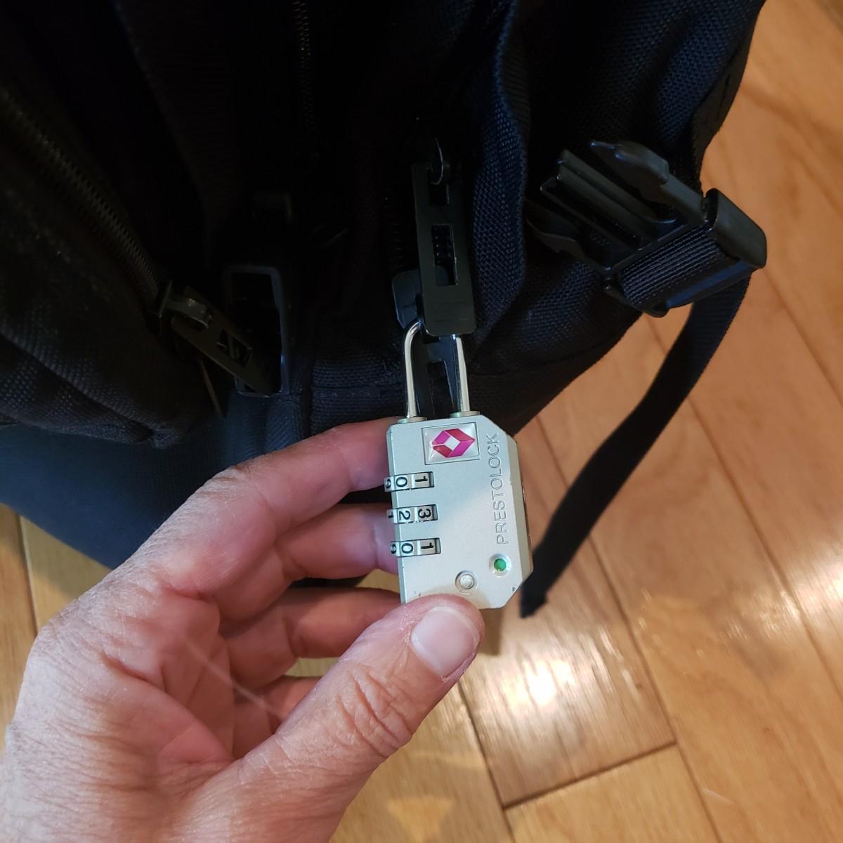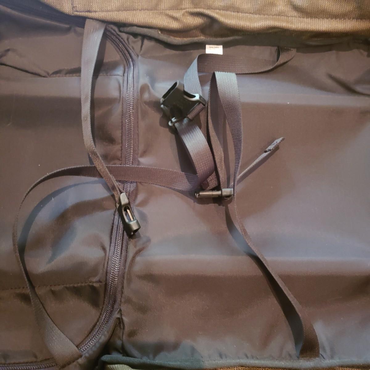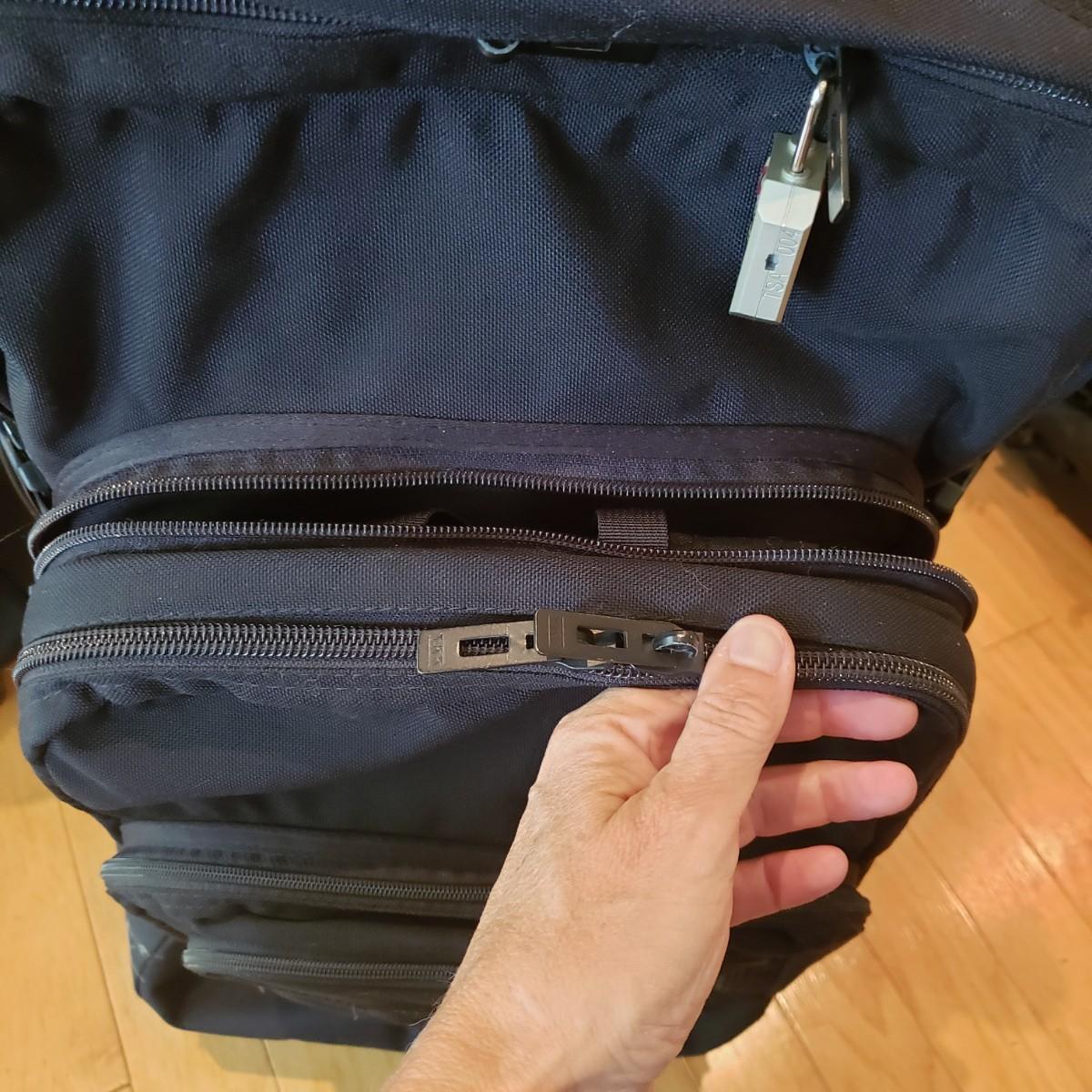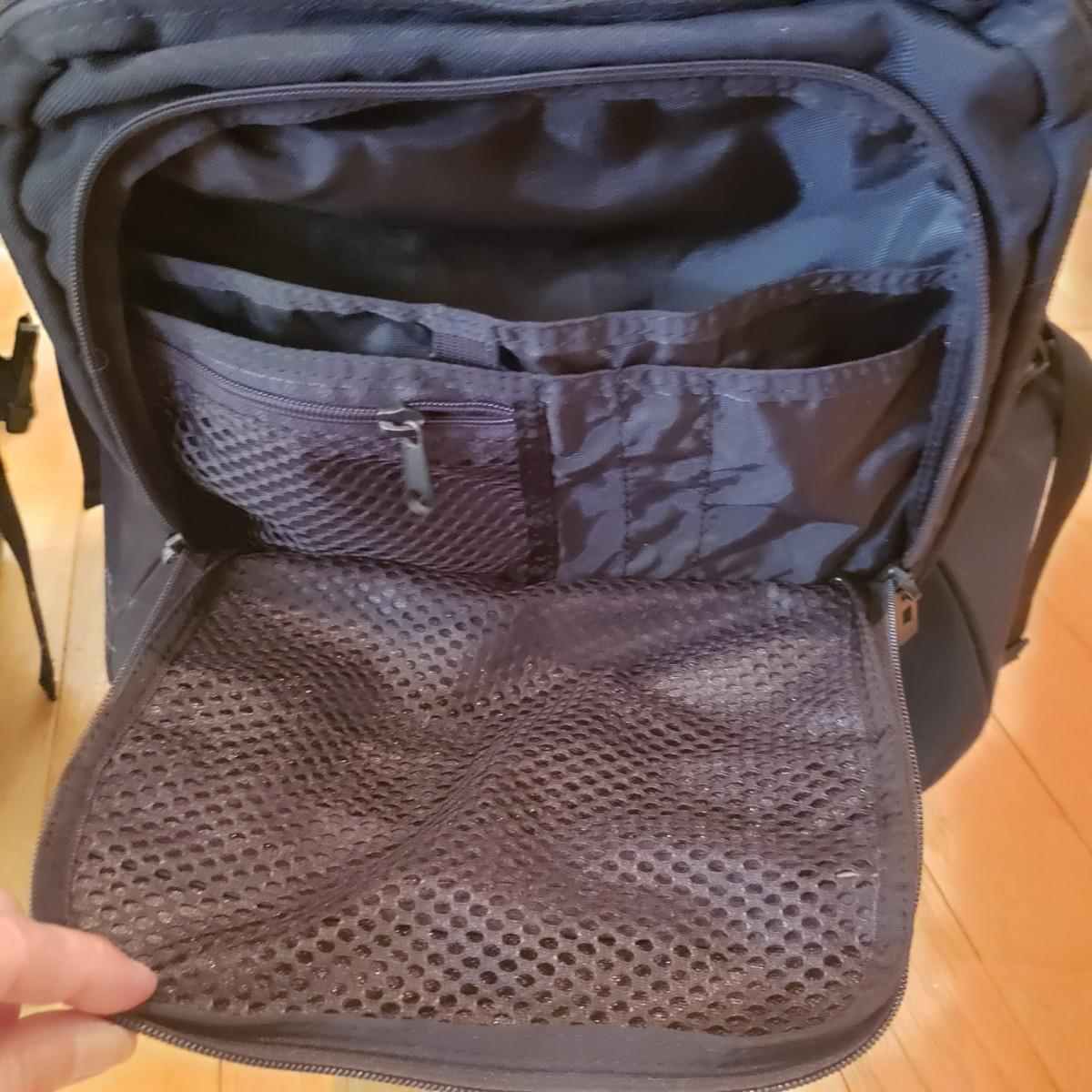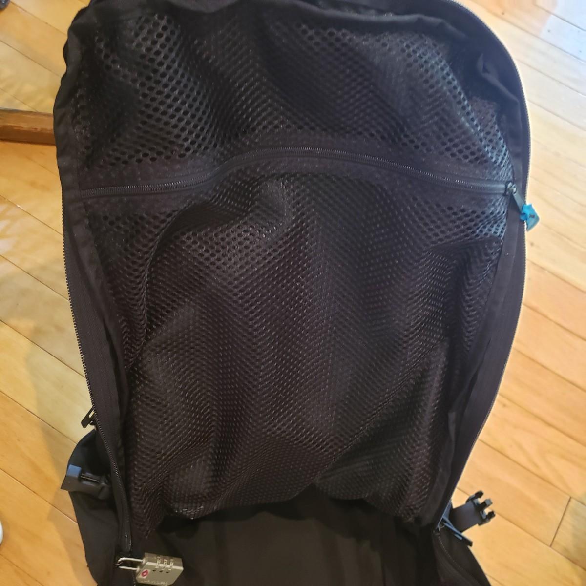 These bags covert from rolling luggage to backpacks. There is so much storage in these bags! The front zippers off into a small backpack measuring 12" x 4" x 14"H. See pictures for details. Also included is a NIB luggage straps and an orange soft handle grip, that is a luggage tag as well. There is a combination lock on the dark blue bag that unfortunately we don't have the code.