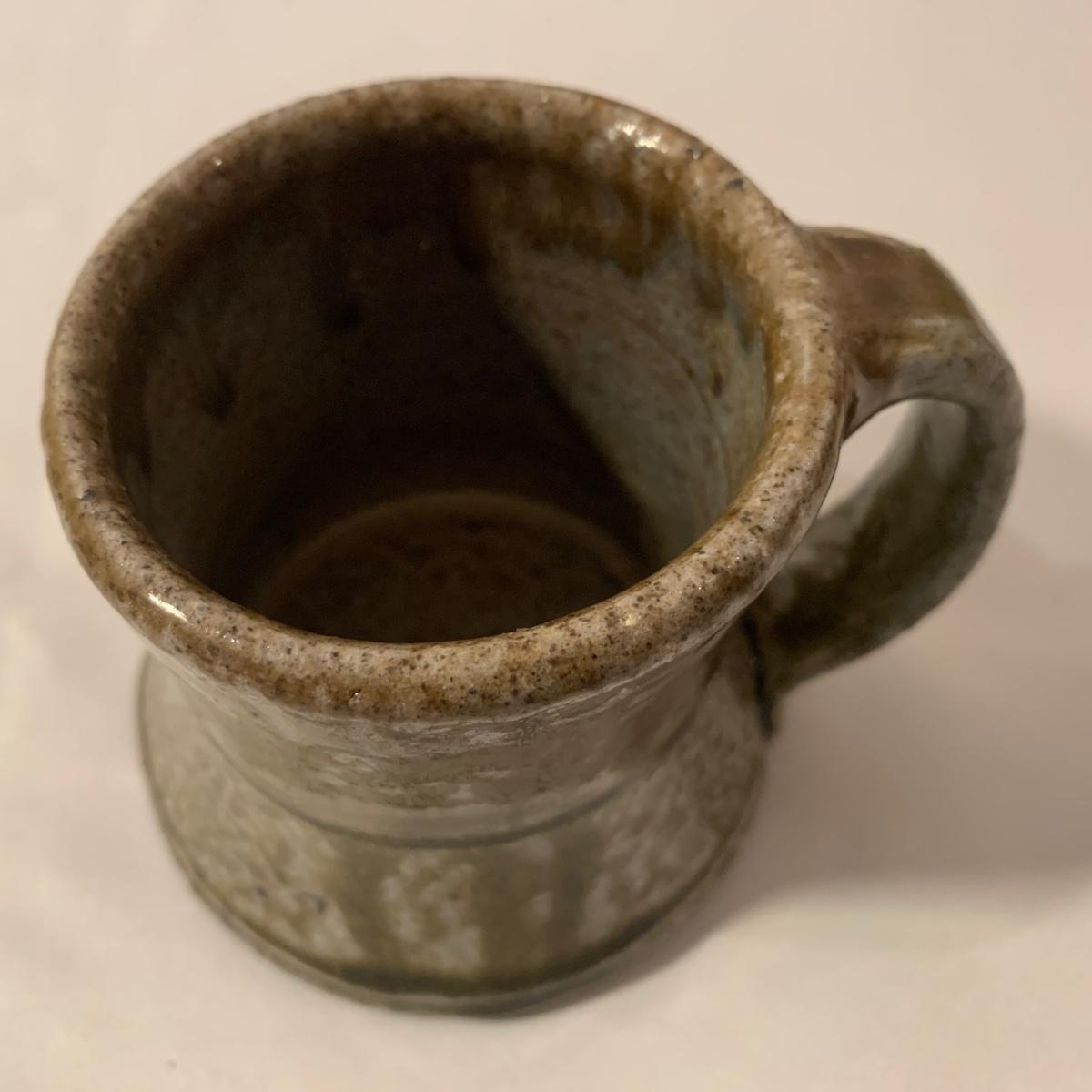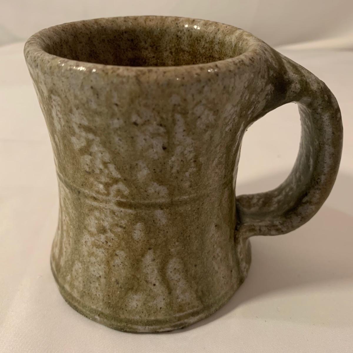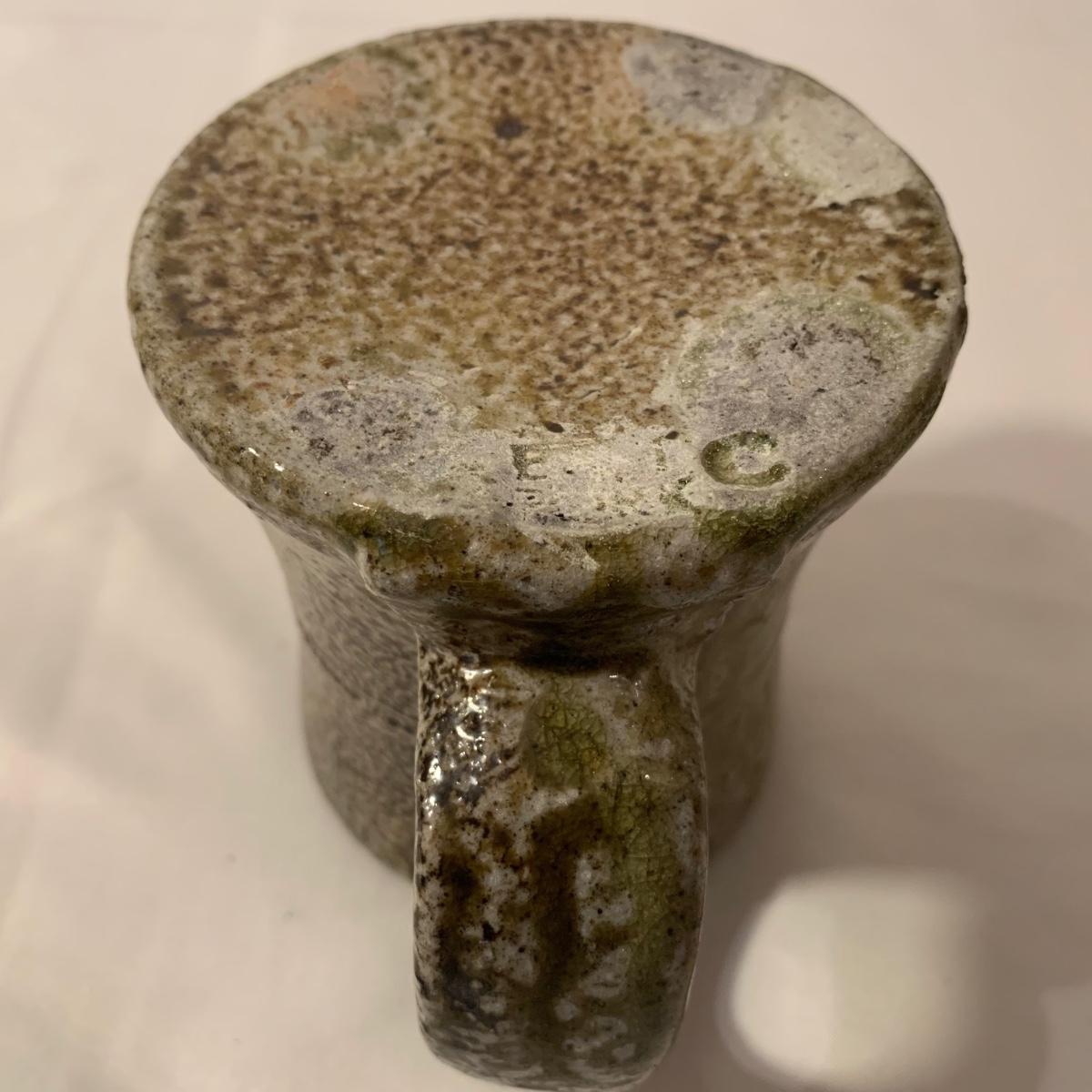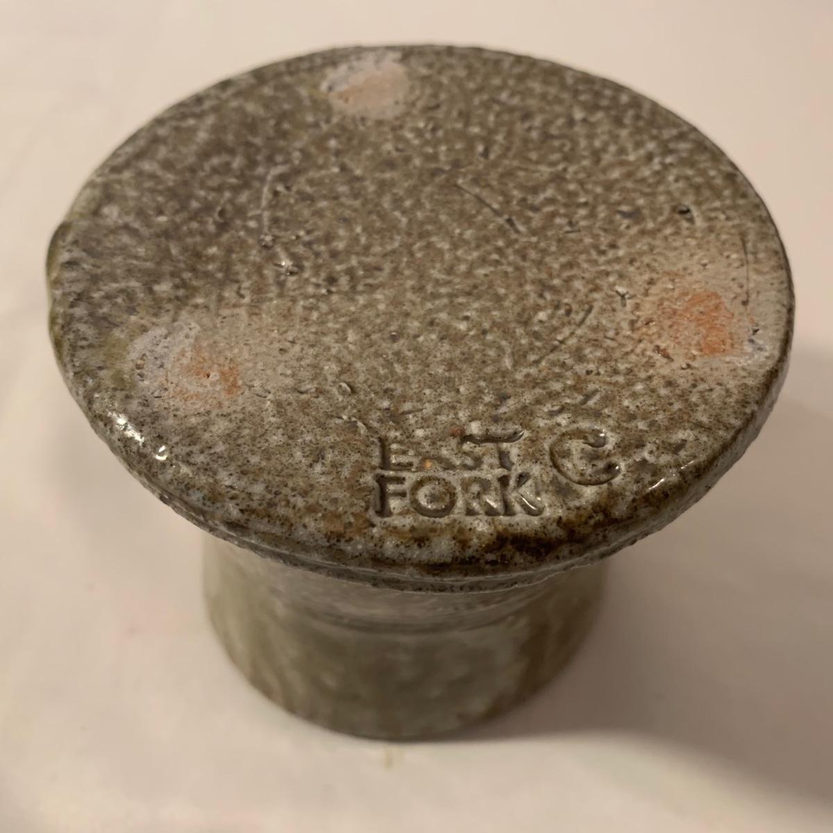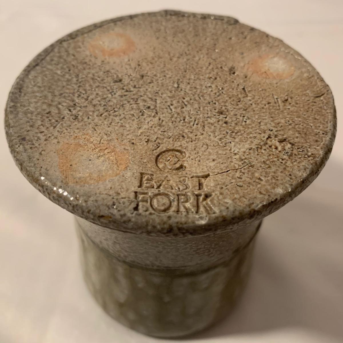 Set of four hand thrown potted mugs from local East Fork Pottery. Glazed in their original ash glaze that was recently reissued. Each mug is stamped by East Fork. Per the potter, Alex Matisse, these bear the stamp of the first ever EF employee circa 2011. As they are handmade, the mugs vary in size, but the largest measures, 3.5”D x 4”H. Shipping available.
