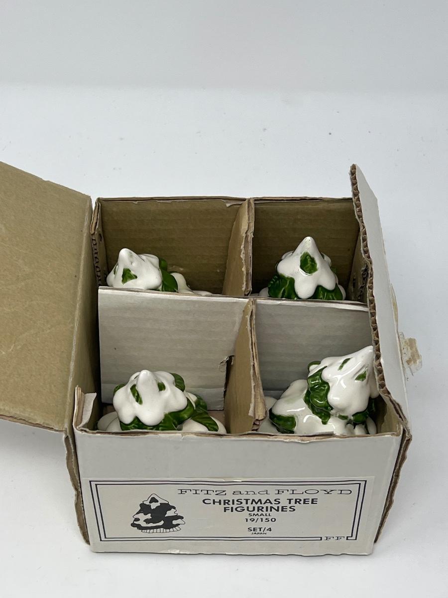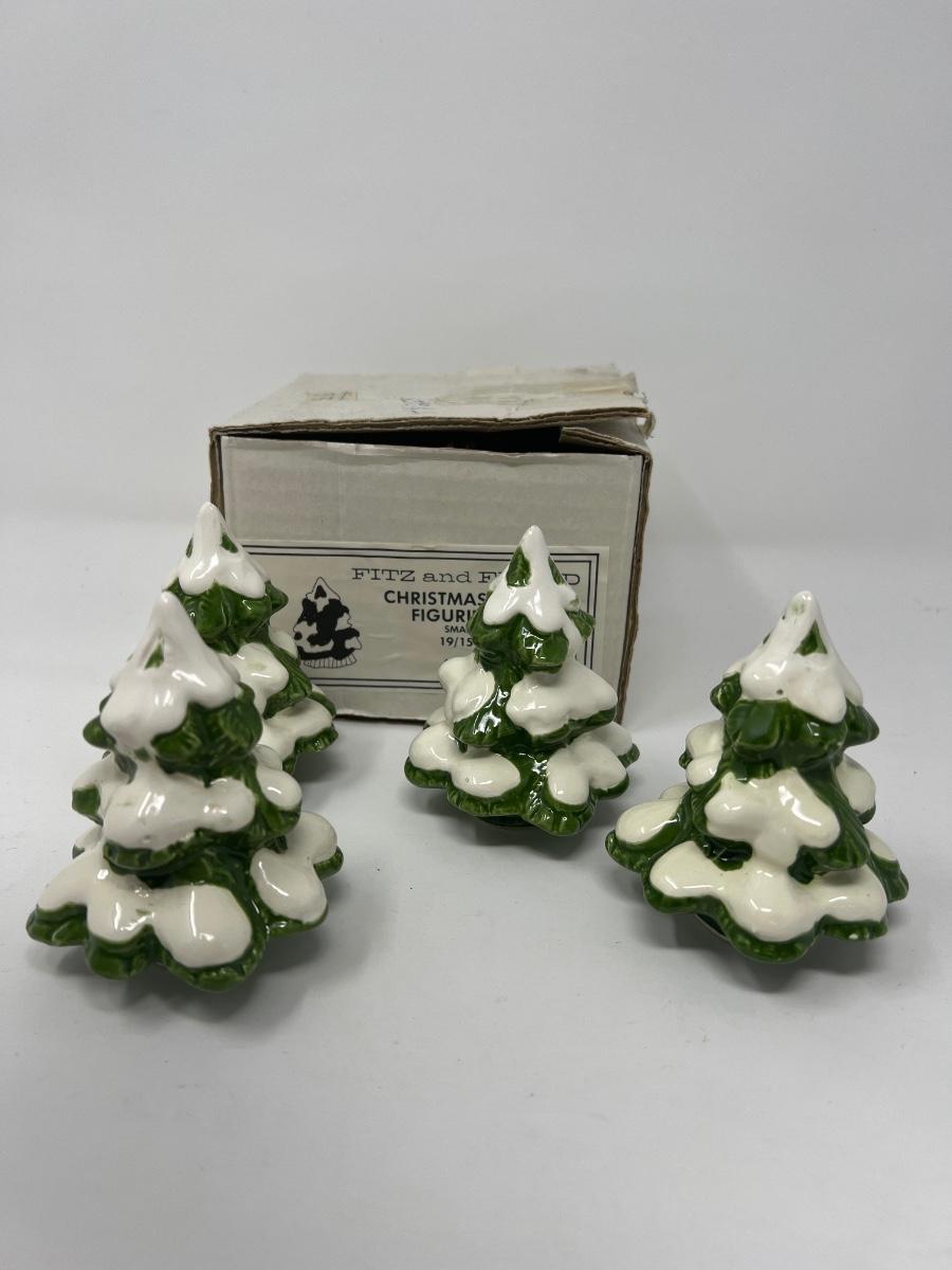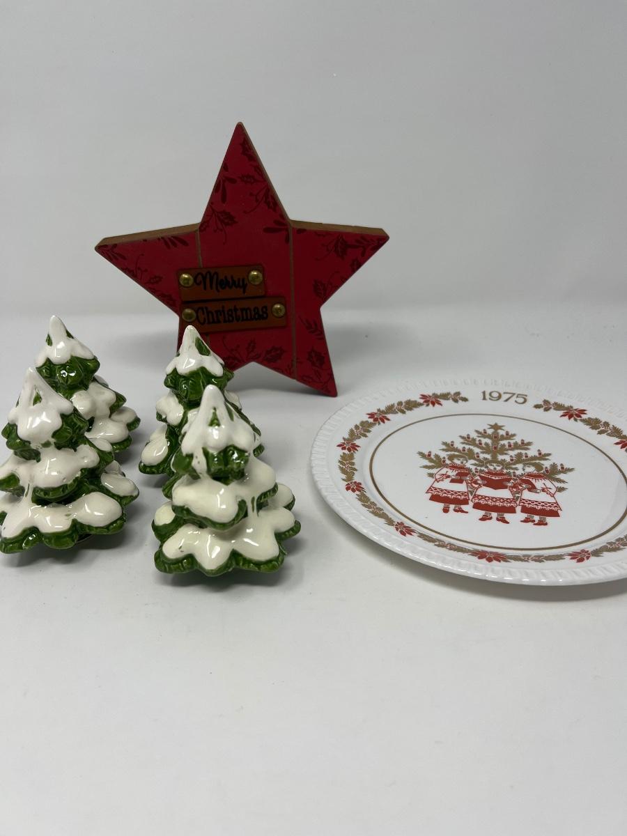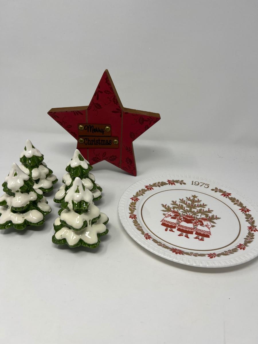 Four vintage Fitz and Floyd 4” tall snow covered ceramic Christmas trees, an 8” round 1975 collector Christmas plate by Spode and 8” tall woodem star decor with studded Merry Christmas plaque.