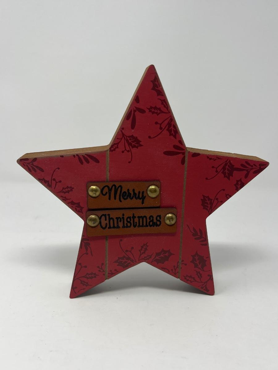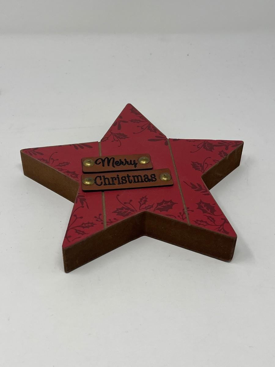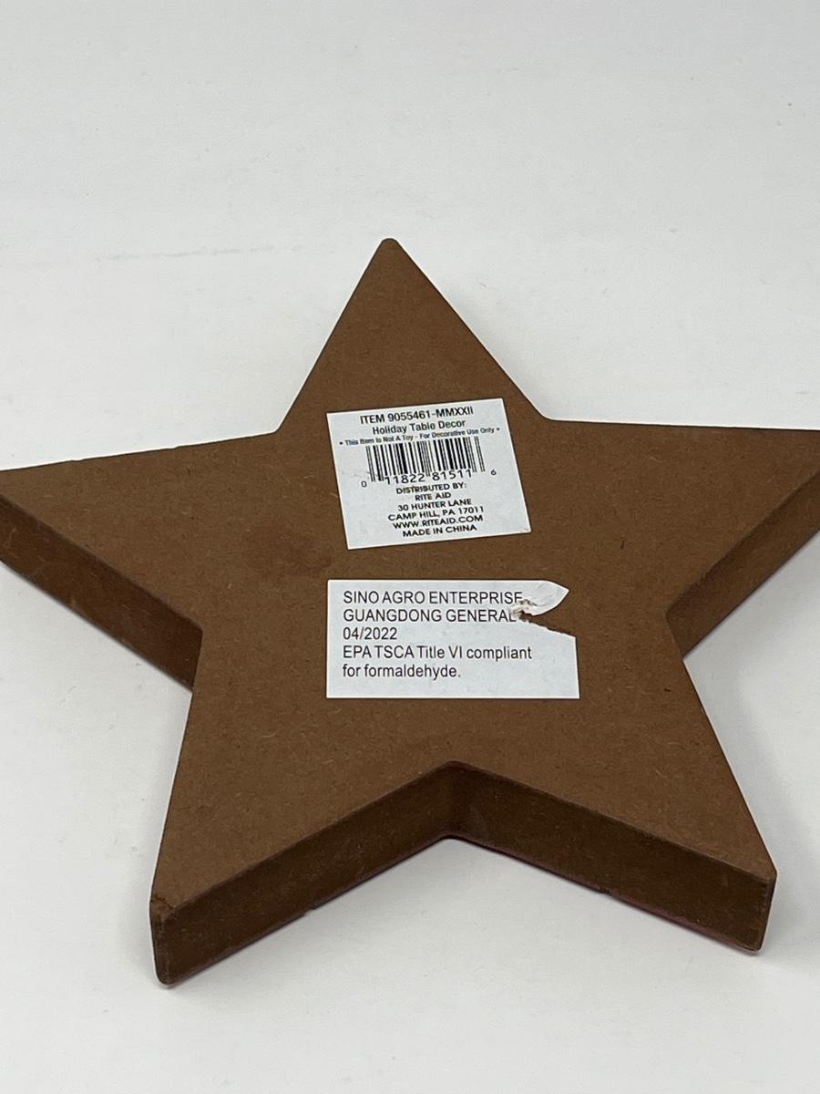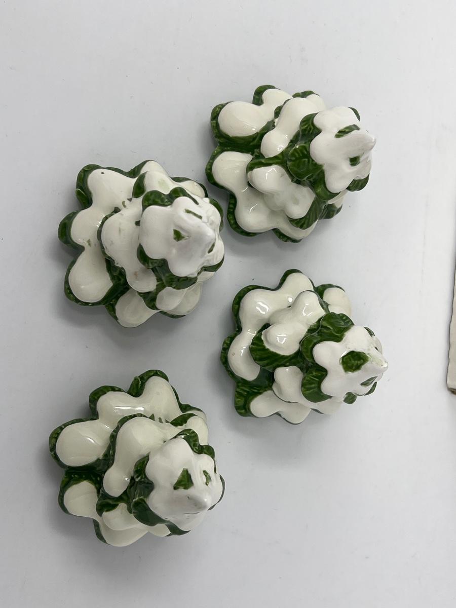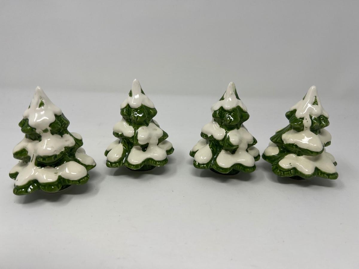 Four vintage Fitz and Floyd 4” tall snow covered ceramic Christmas trees, an 8” round 1975 collector Christmas plate by Spode and 8” tall woodem star decor with studded Merry Christmas plaque.