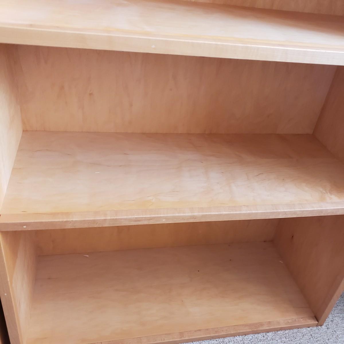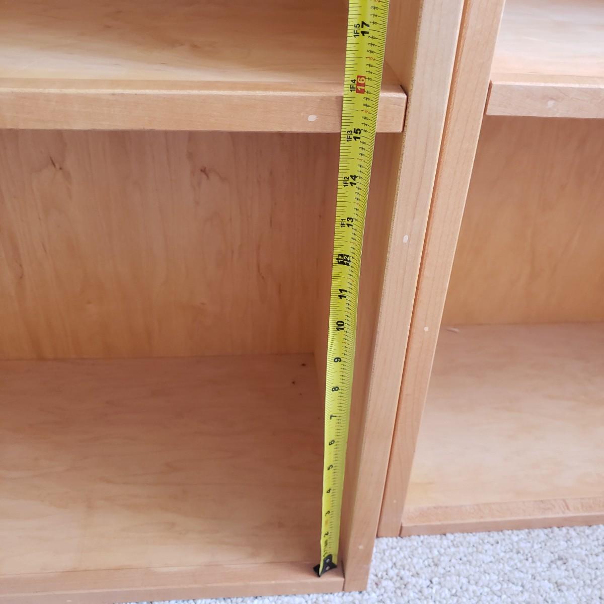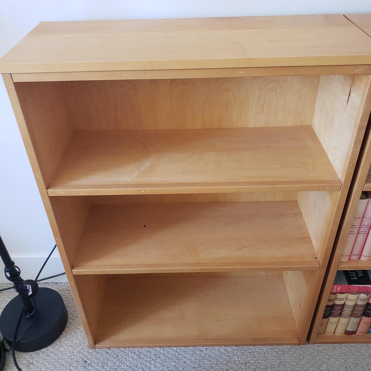 This lot contains four blonde wooden bookcases. The shelves are not adjustable, they are fixed. The fourth bookcase is pictured with books, but they are not included in this lot. They are available for purchase in another lot in this sale!