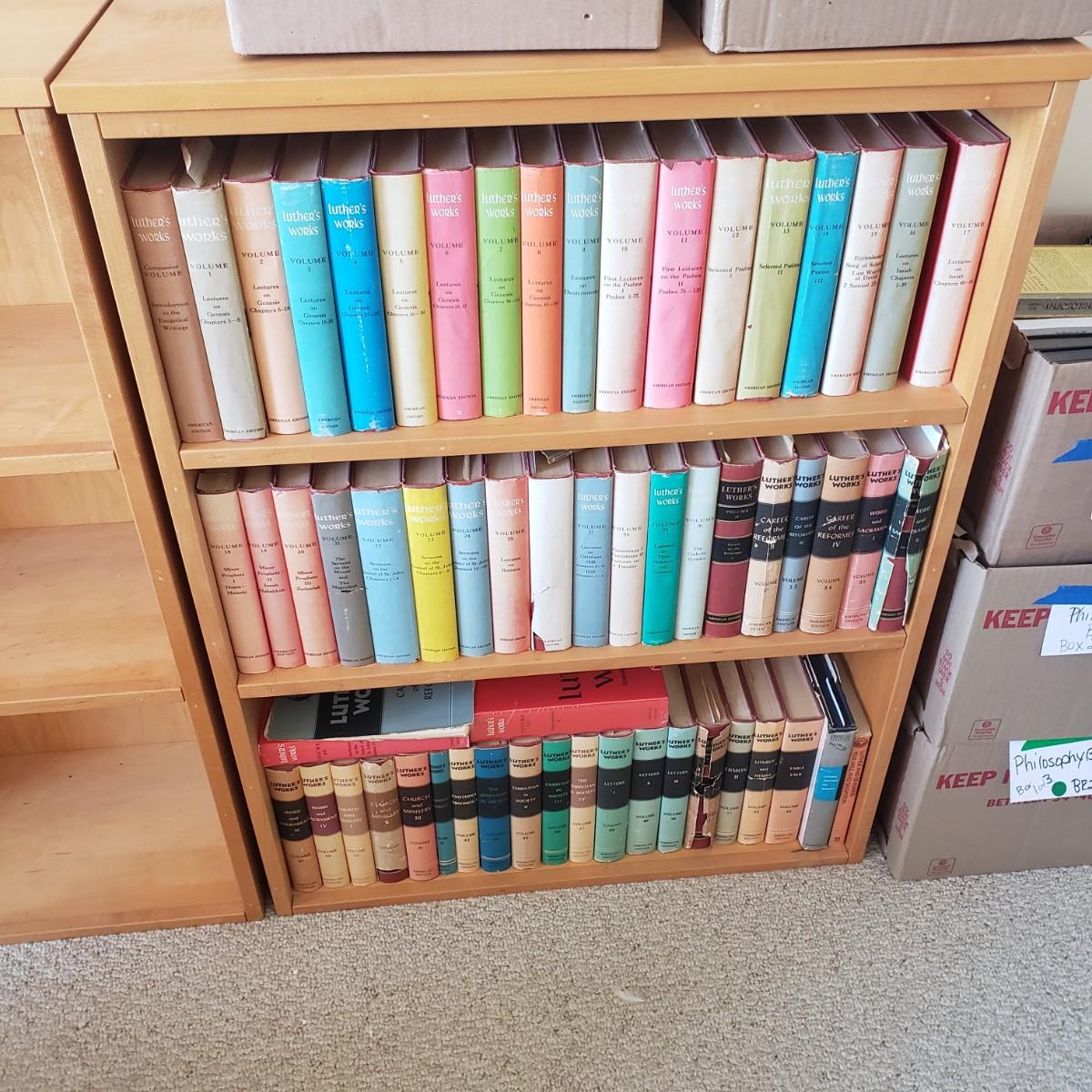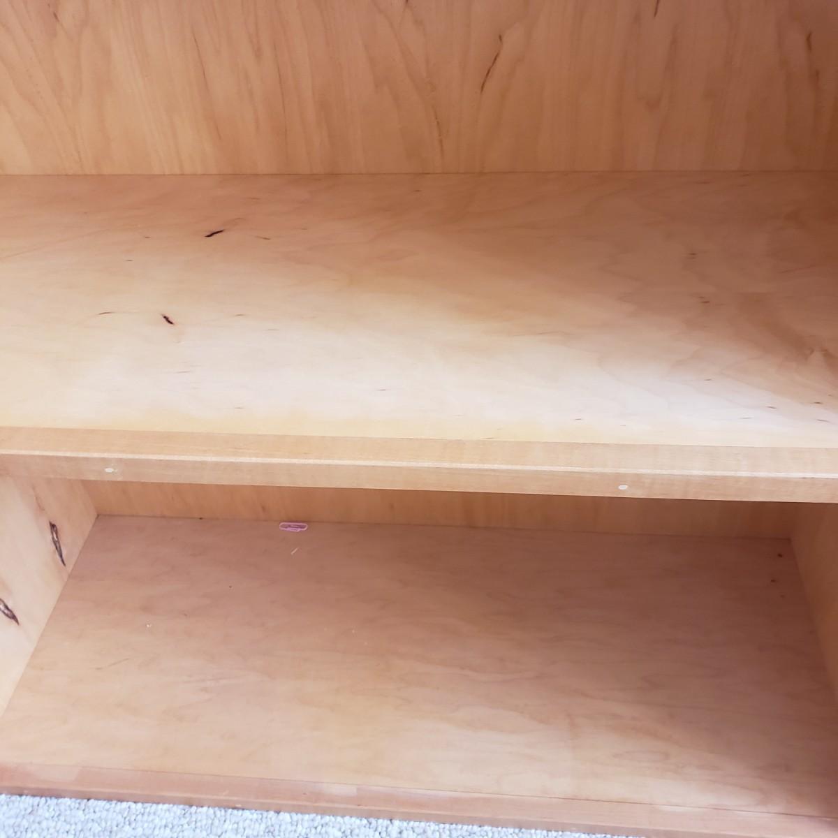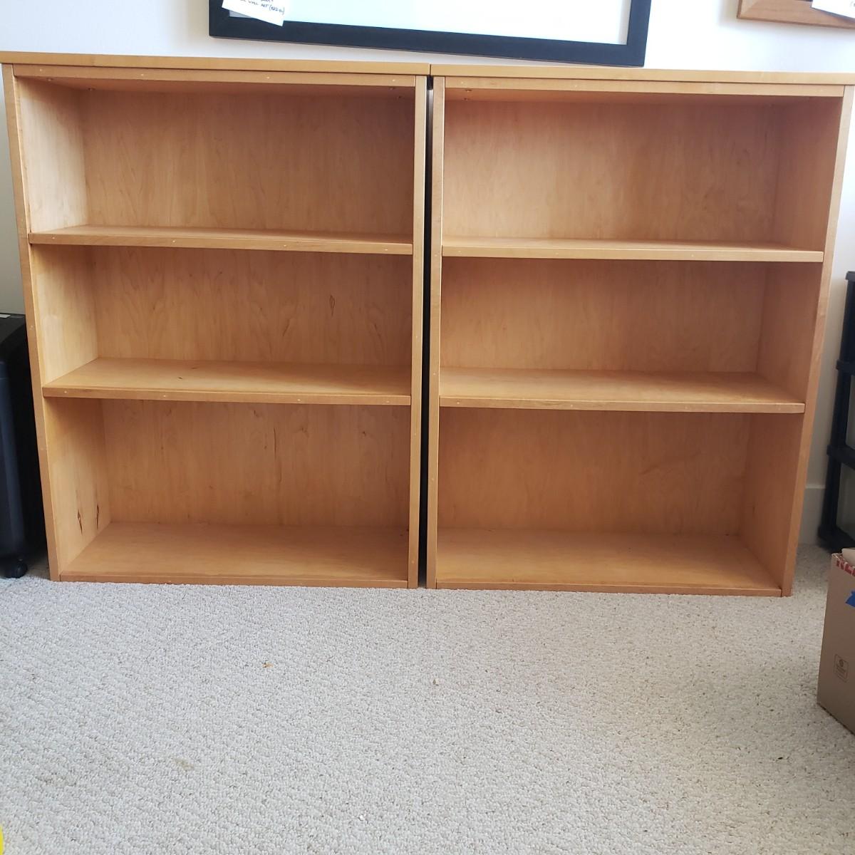 This lot contains four blonde wooden bookcases. The shelves are not adjustable, they are fixed. The fourth bookcase is pictured with books, but they are not included in this lot. They are available for purchase in another lot in this sale!