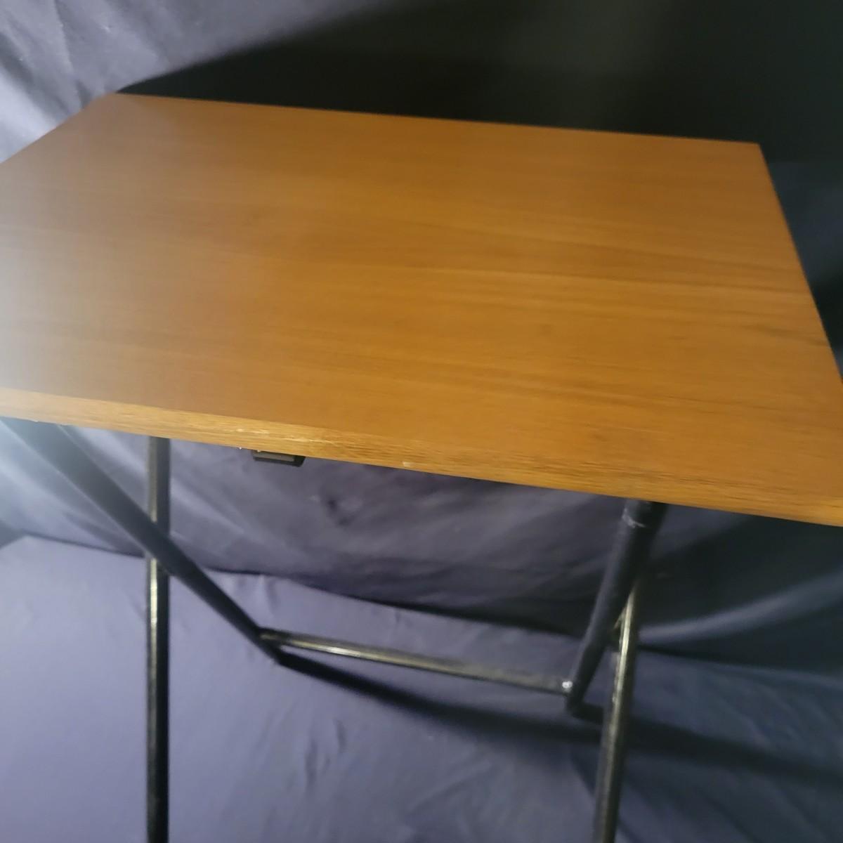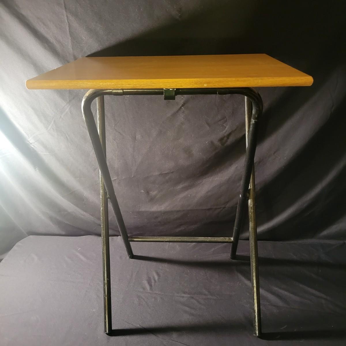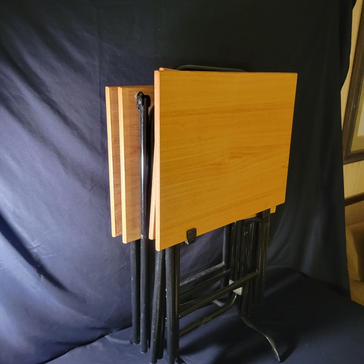 Four folding tables with metal bases and wooden tops. Items are in good condition with some minor scratches from use. Tables measure approximately 19" x 14" x 25". Tables and stand measure approximately 19" x 14" x 31.5" Local pickup only