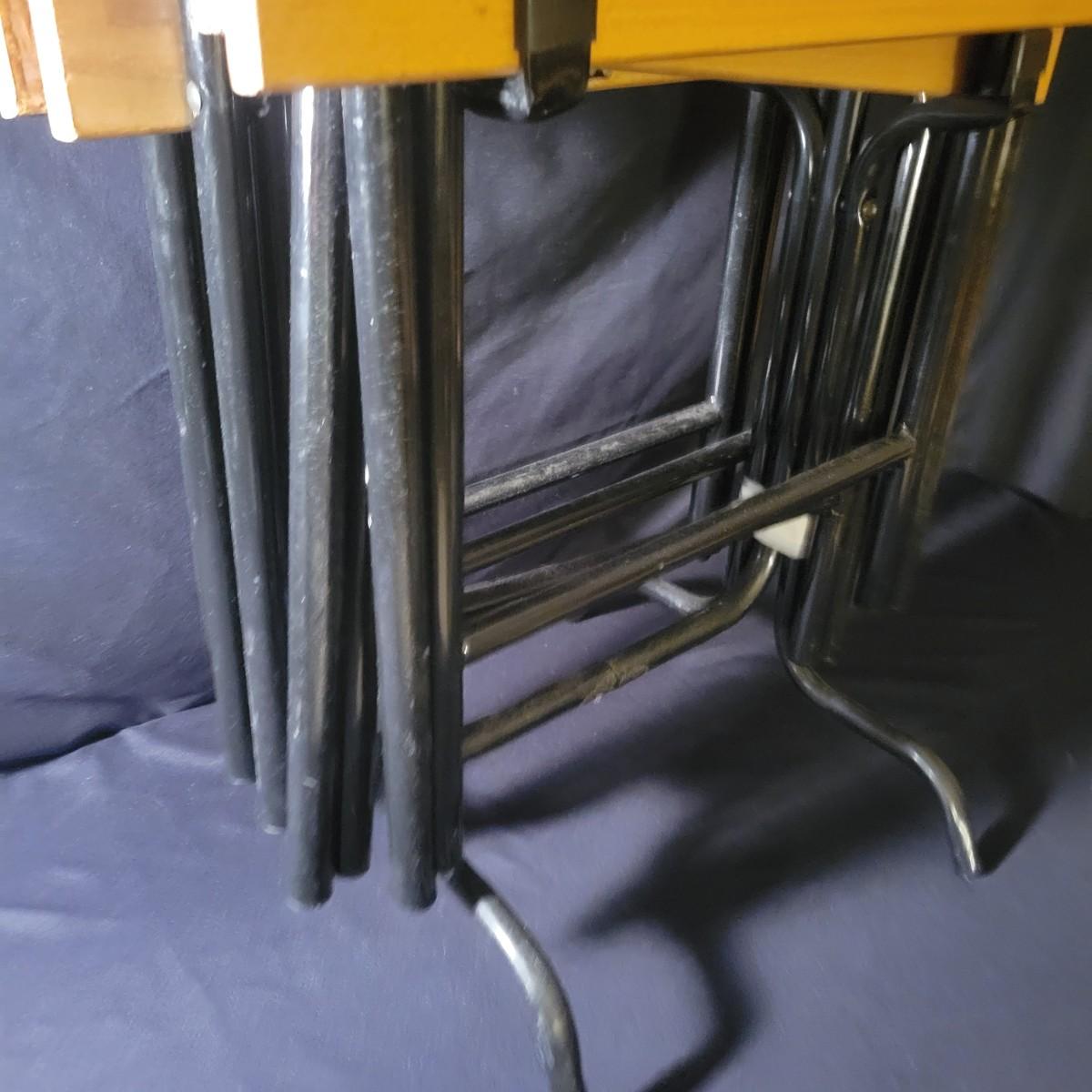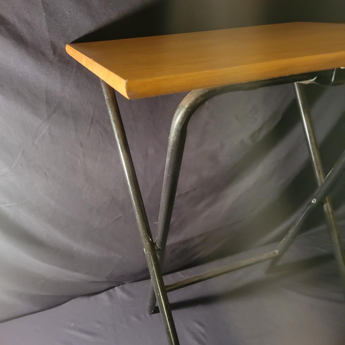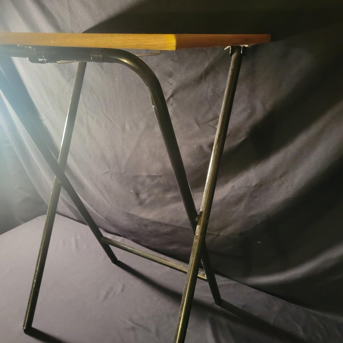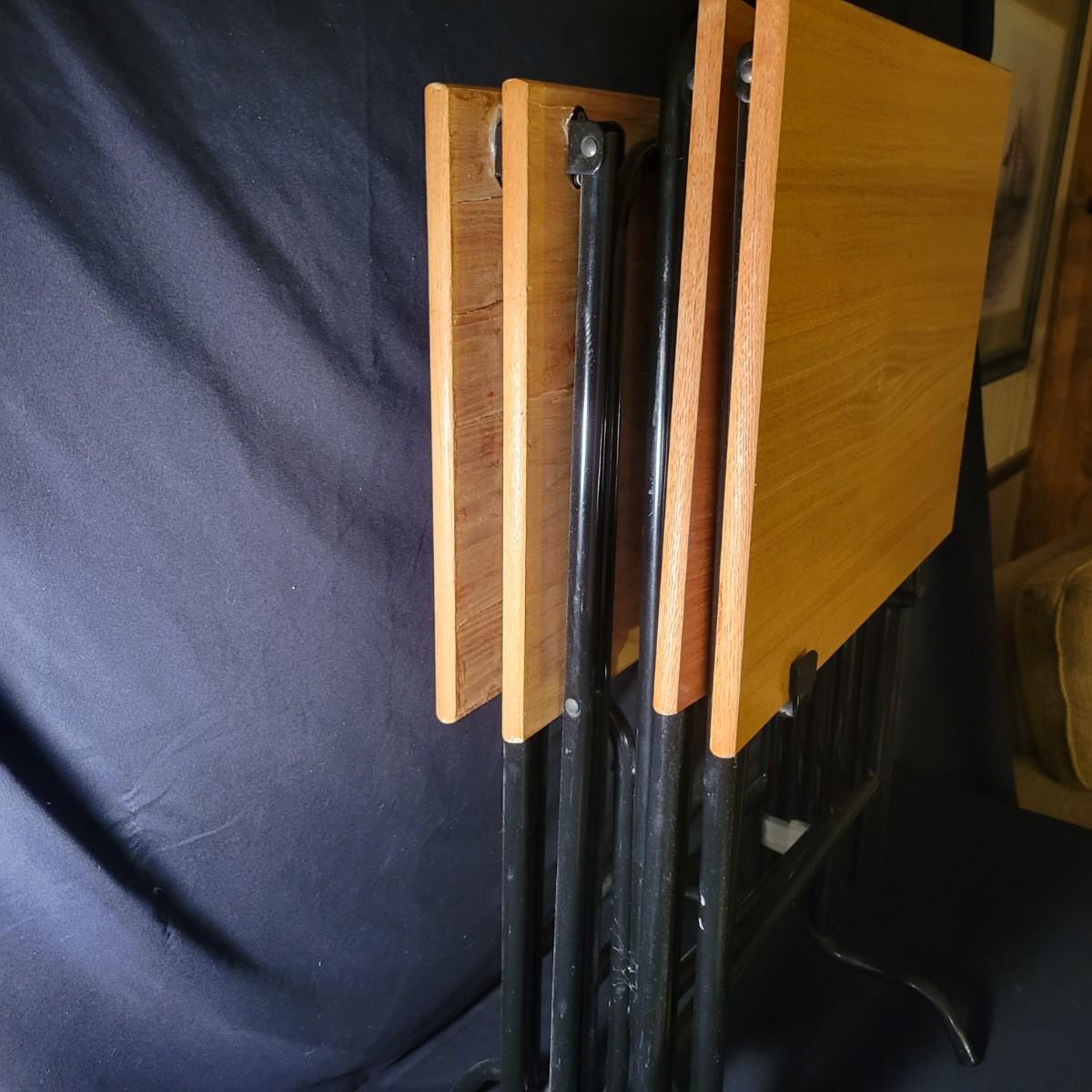 Four folding tables with metal bases and wooden tops. Items are in good condition with some minor scratches from use. Tables measure approximately 19" x 14" x 25". Tables and stand measure approximately 19" x 14" x 31.5" Local pickup only