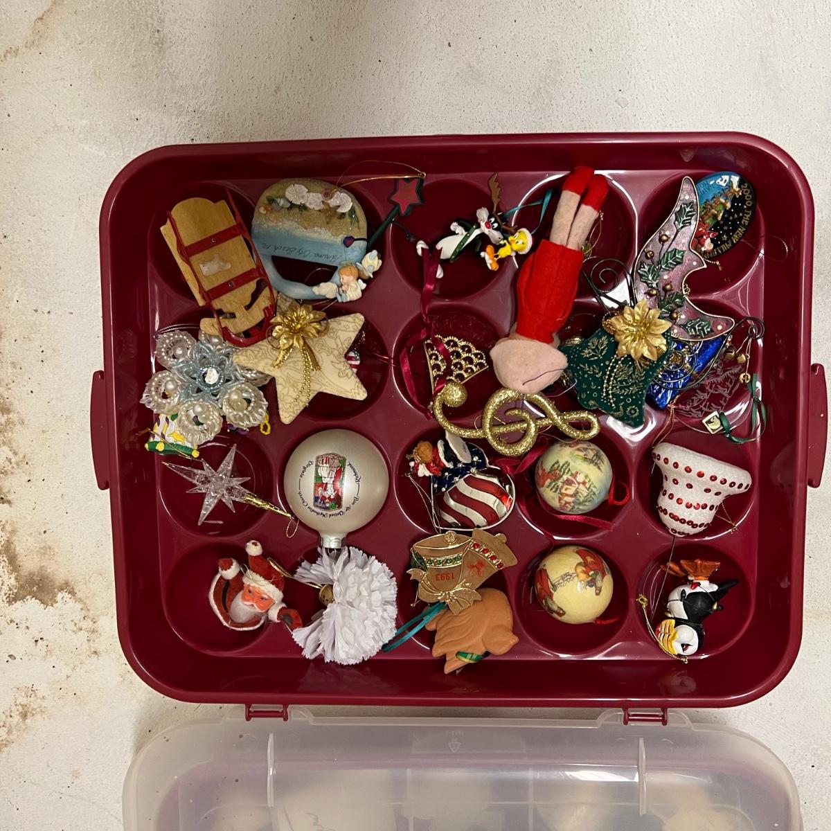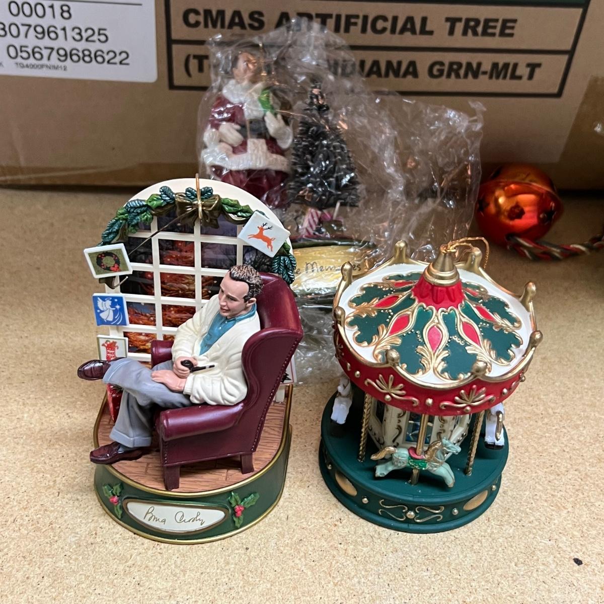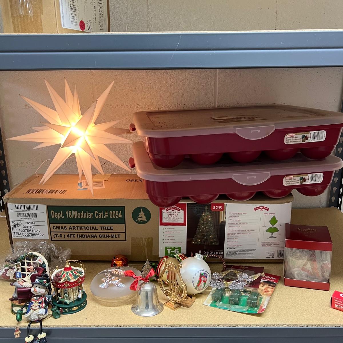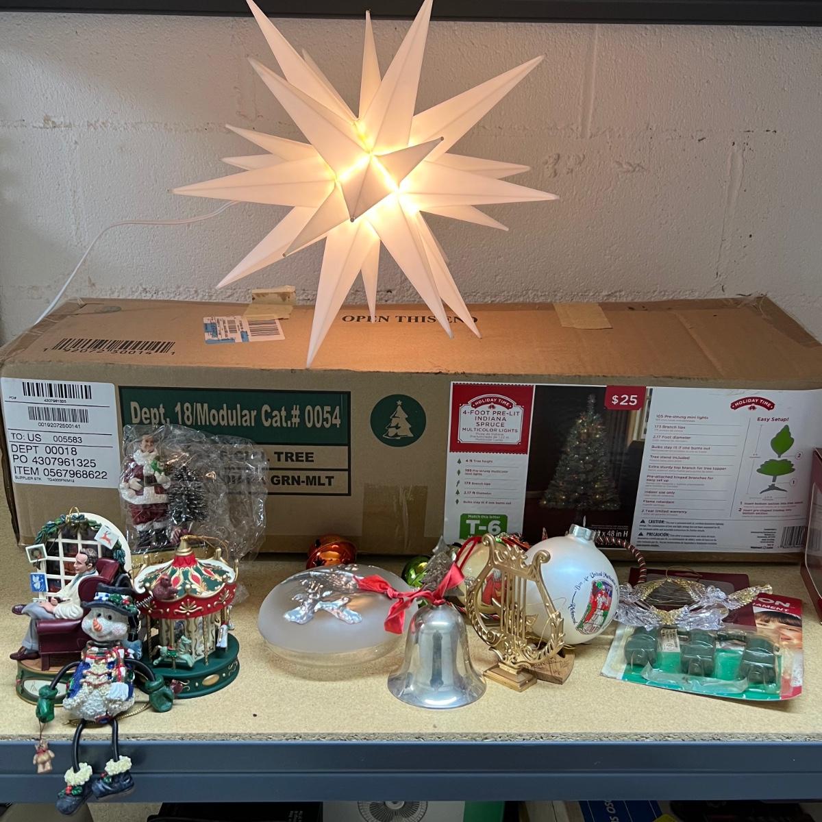 This great assortment of festive items includes a Star of Bethlehem light up star with box, a four foot tree plus two ornament holder tubs full of ornaments and a lot more items. Note there are two ornaments that play music but currently have no batteries so have not been tested.