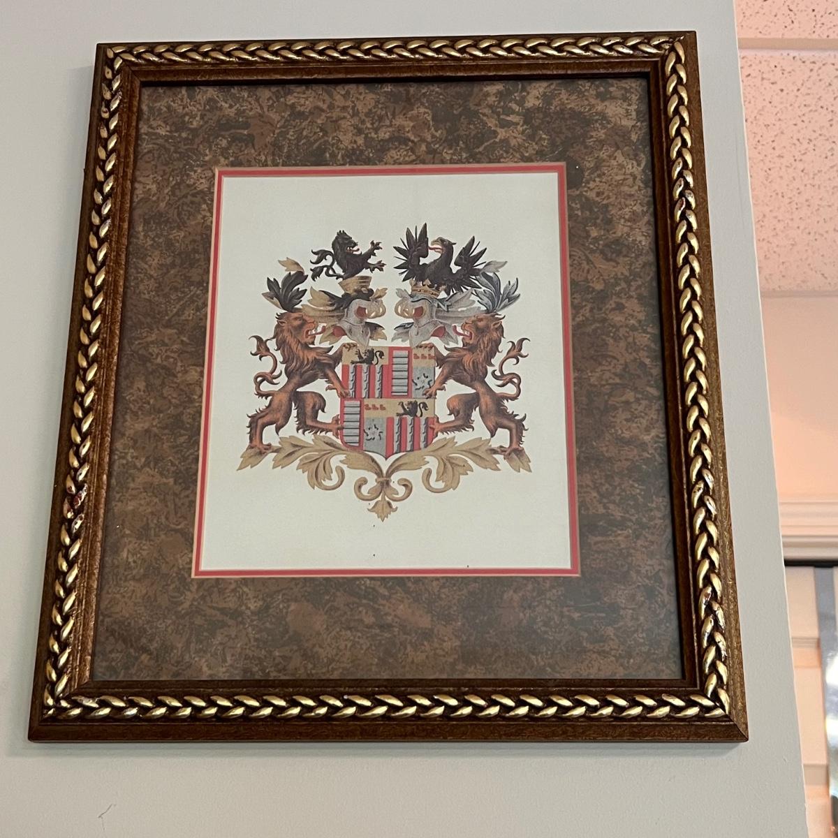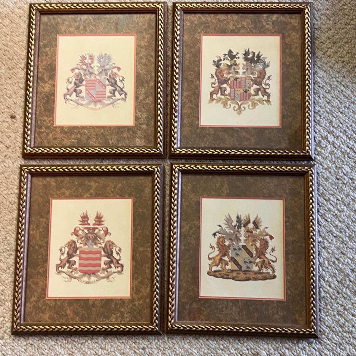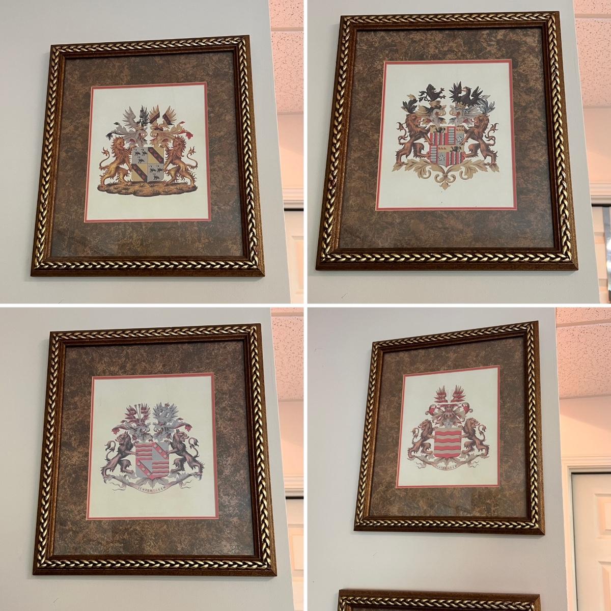 These four family shields are housed in matching wooden frames with gilded accents over a bronze finish. Under glass and matted, these frames measure 14” x 16”H. One print (Semper Idem) is slightly lighter in color than the rest, see pic.