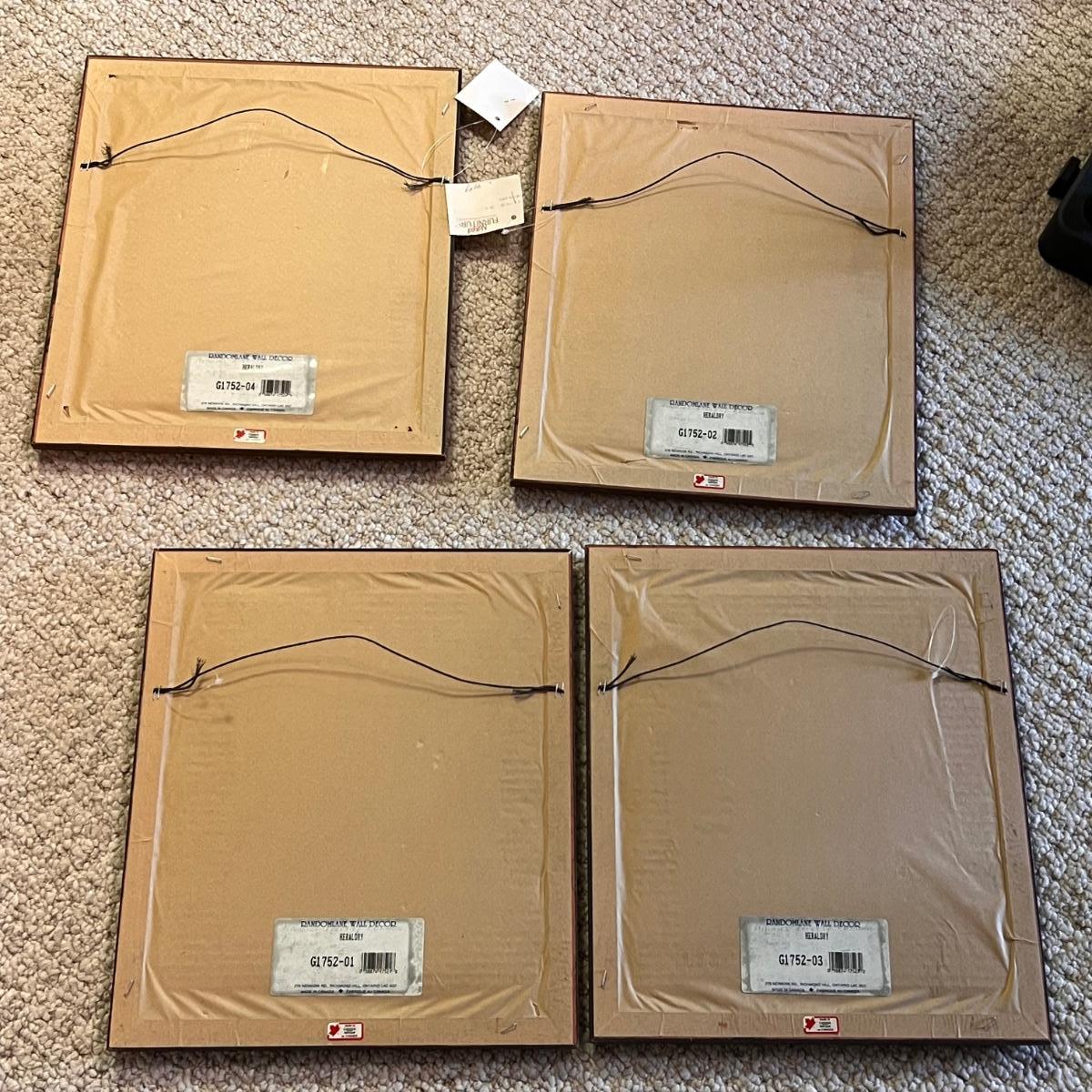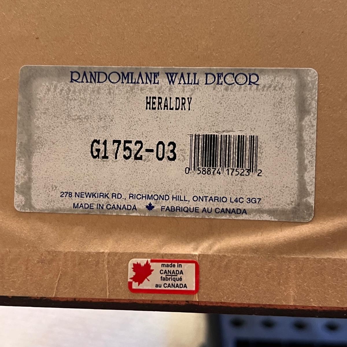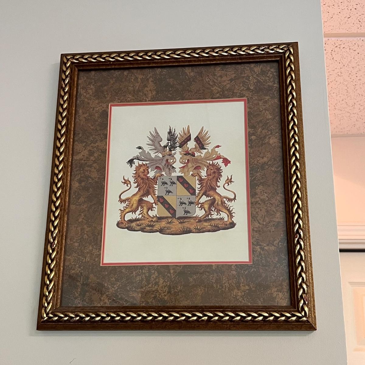These four family shields are housed in matching wooden frames with gilded accents over a bronze finish. Under glass and matted, these frames measure 14” x 16”H. One print (Semper Idem) is slightly lighter in color than the rest, see pic.
