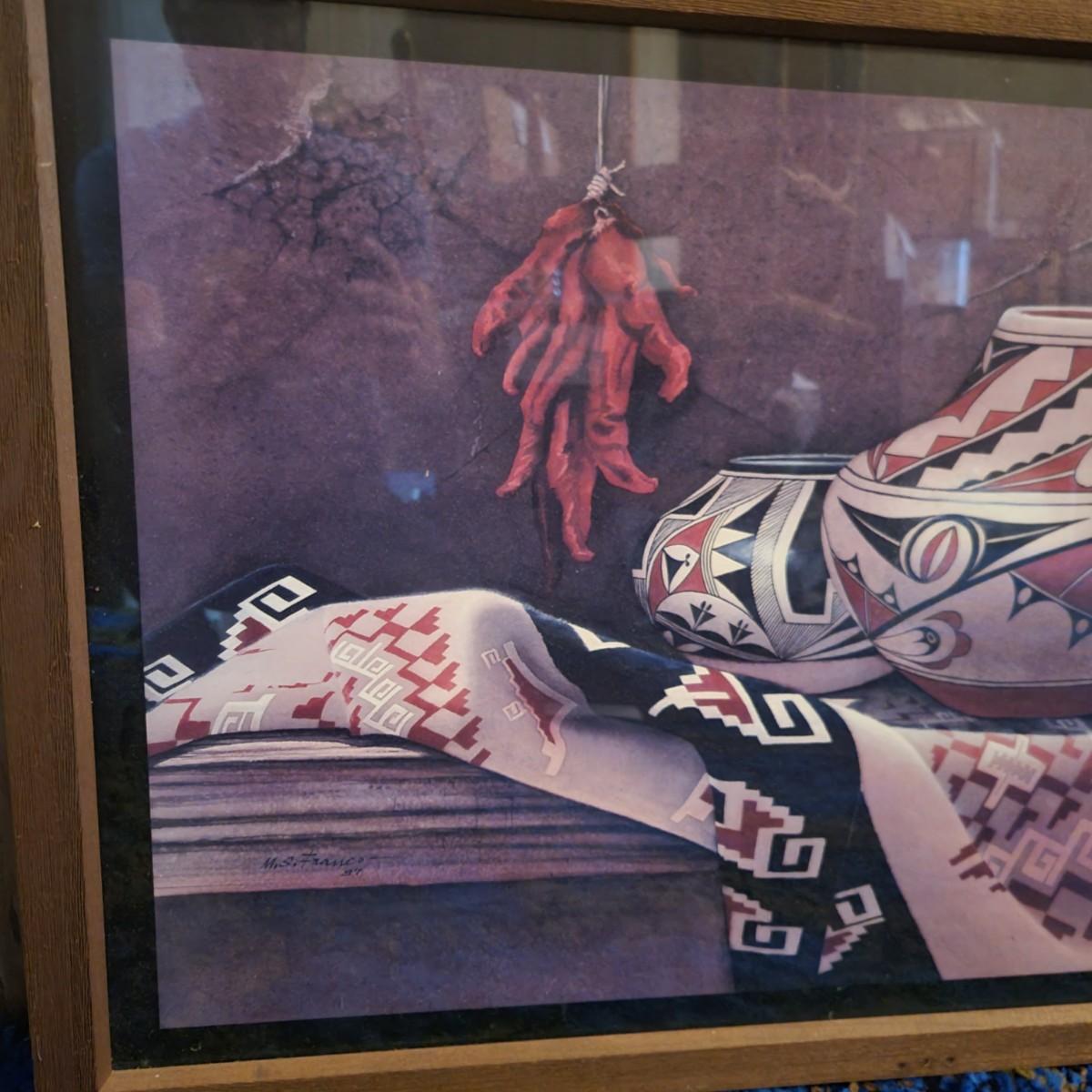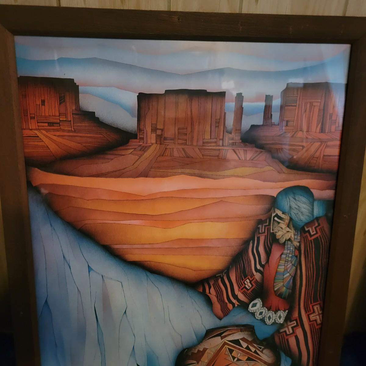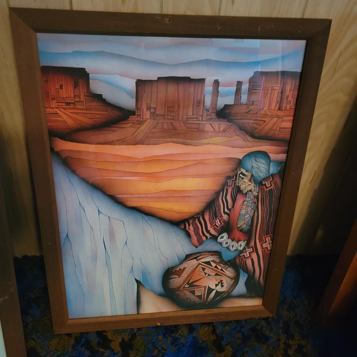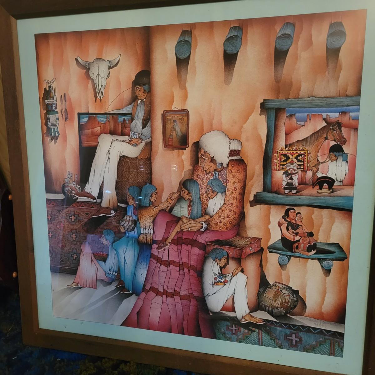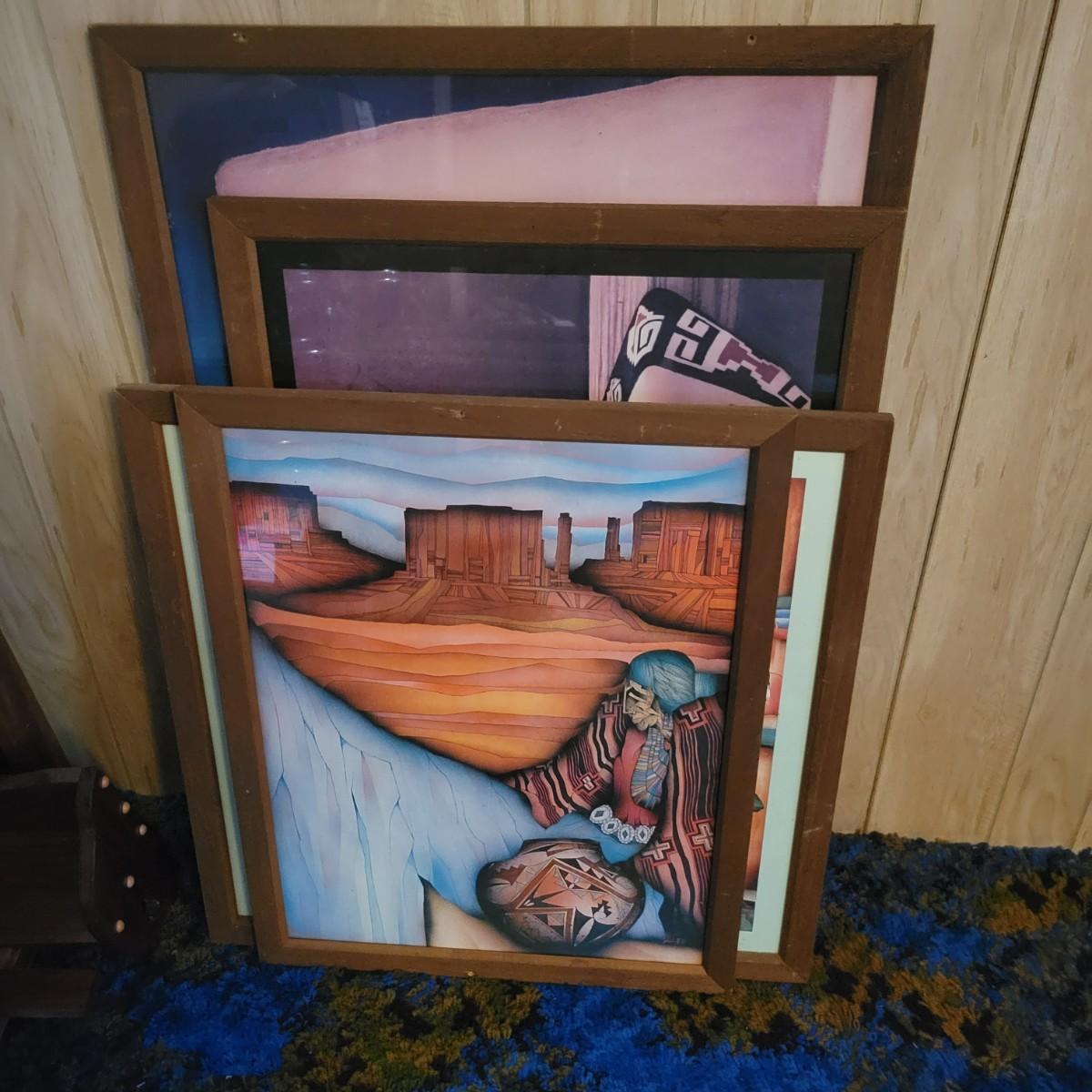 Four prints with a native American theme in matching rustic wooden frames. Each print depicts a different style and artist. Some pieces appear to be pencil signed, bit could not be confirmed. The largest piece measures approximately 26.5" x 39"H. The frames do have holes in them from where they were previously mounted. Shipping available. Shipping can be costly. We suggest contacting our preferred local shipping provider, Postage Express, with dimensions and getting an estimate before bidding: (828) 670-5501 or postageexpress@yahoo.com.