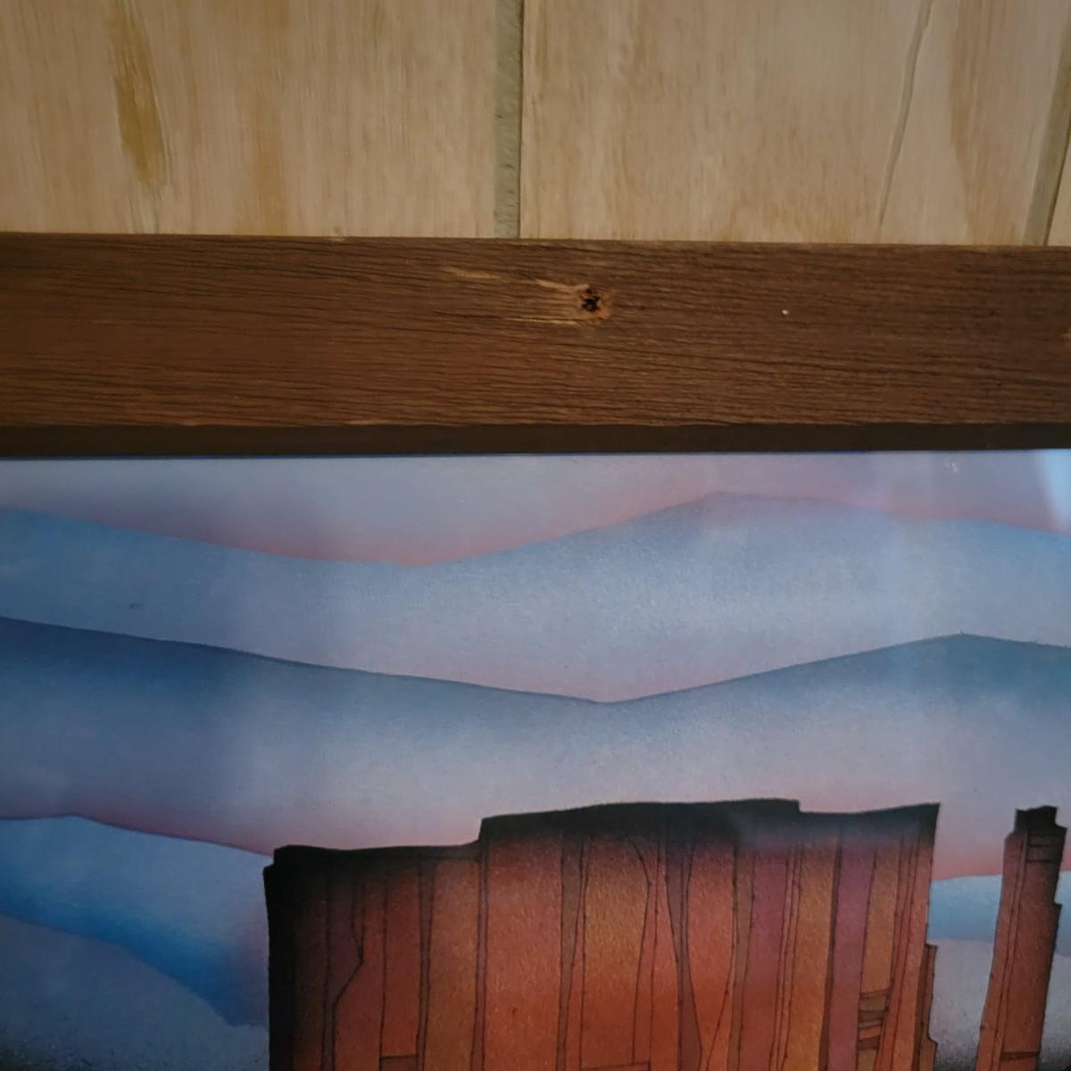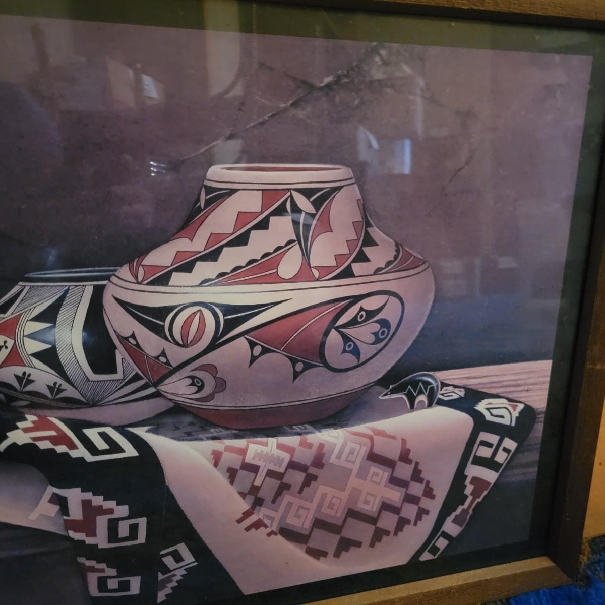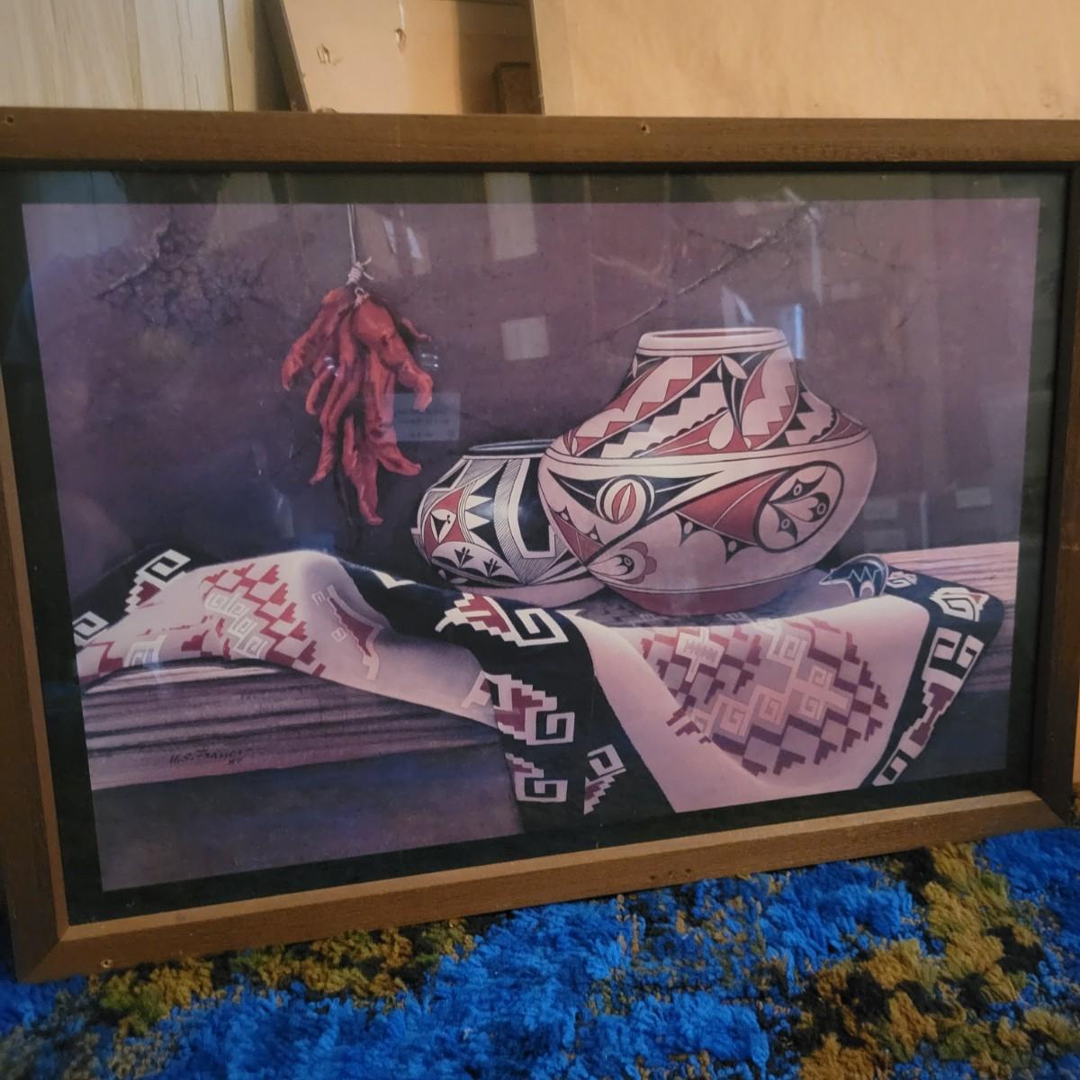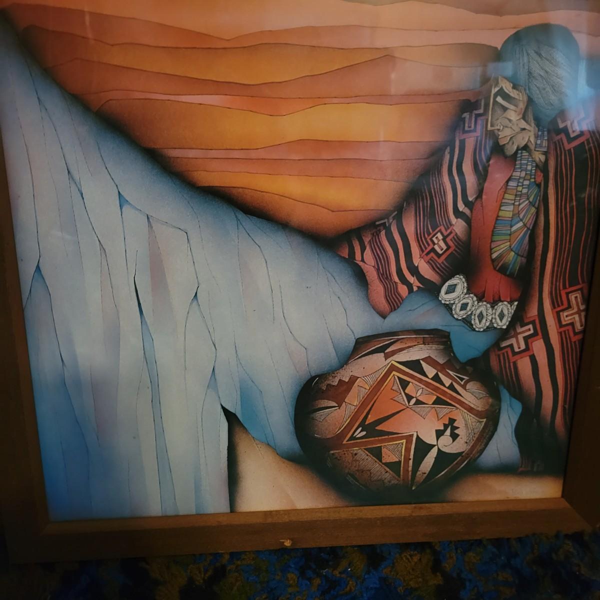 Four prints with a native American theme in matching rustic wooden frames. Each print depicts a different style and artist. Some pieces appear to be pencil signed, bit could not be confirmed. The largest piece measures approximately 26.5" x 39"H. The frames do have holes in them from where they were previously mounted. Shipping available. Shipping can be costly. We suggest contacting our preferred local shipping provider, Postage Express, with dimensions and getting an estimate before bidding: (828) 670-5501 or postageexpress@yahoo.com.