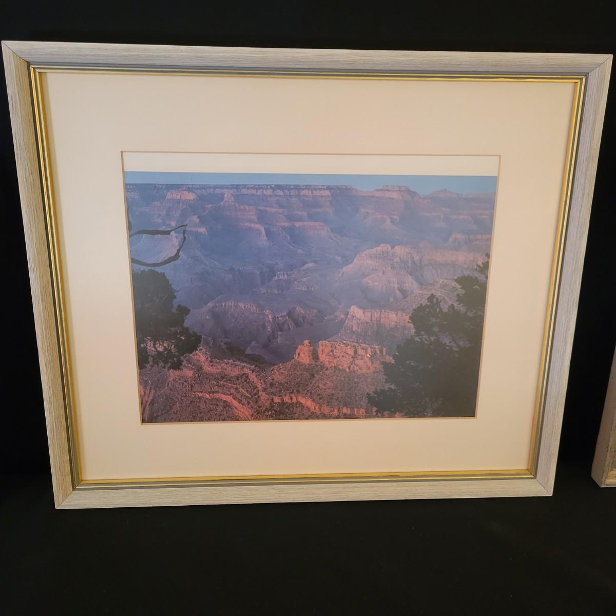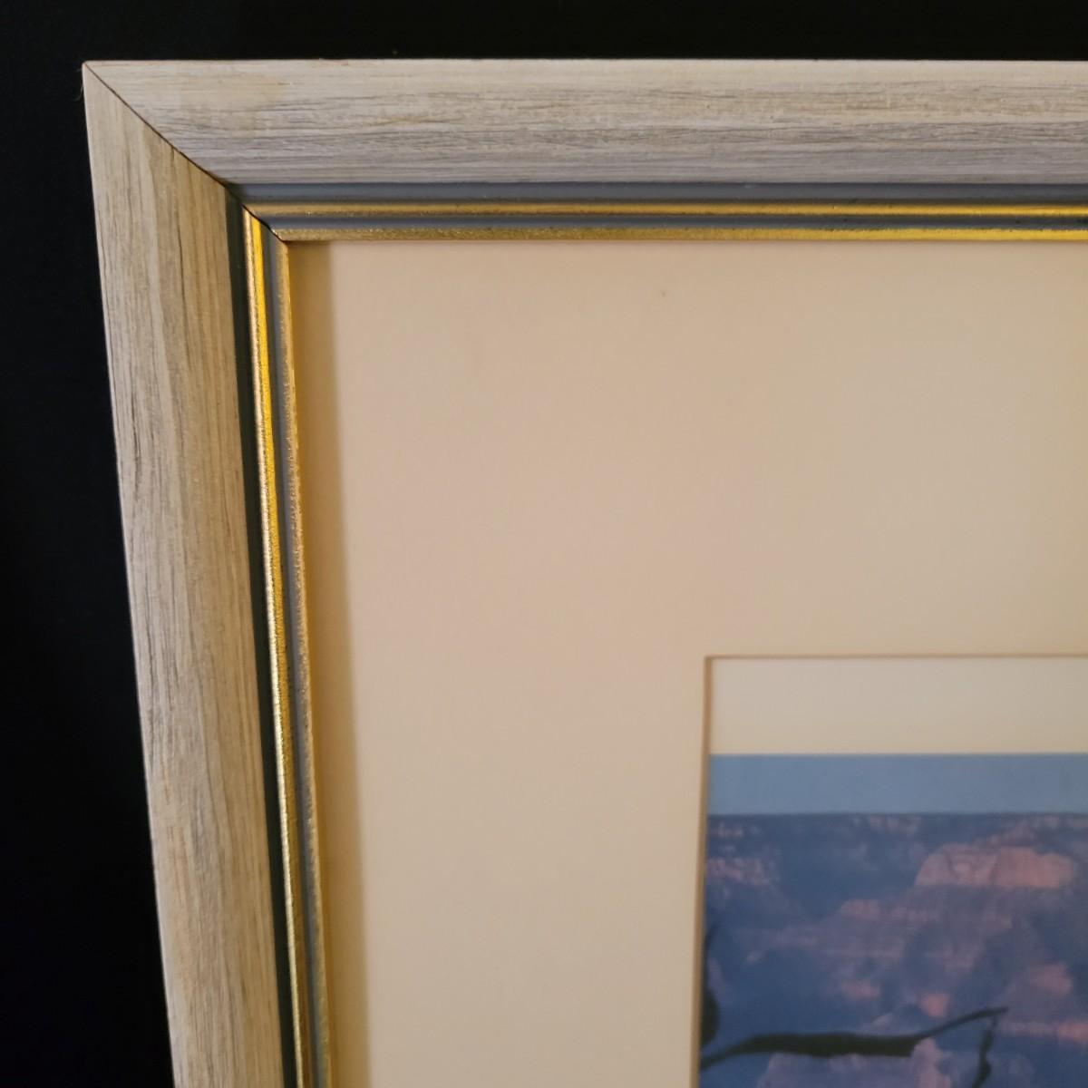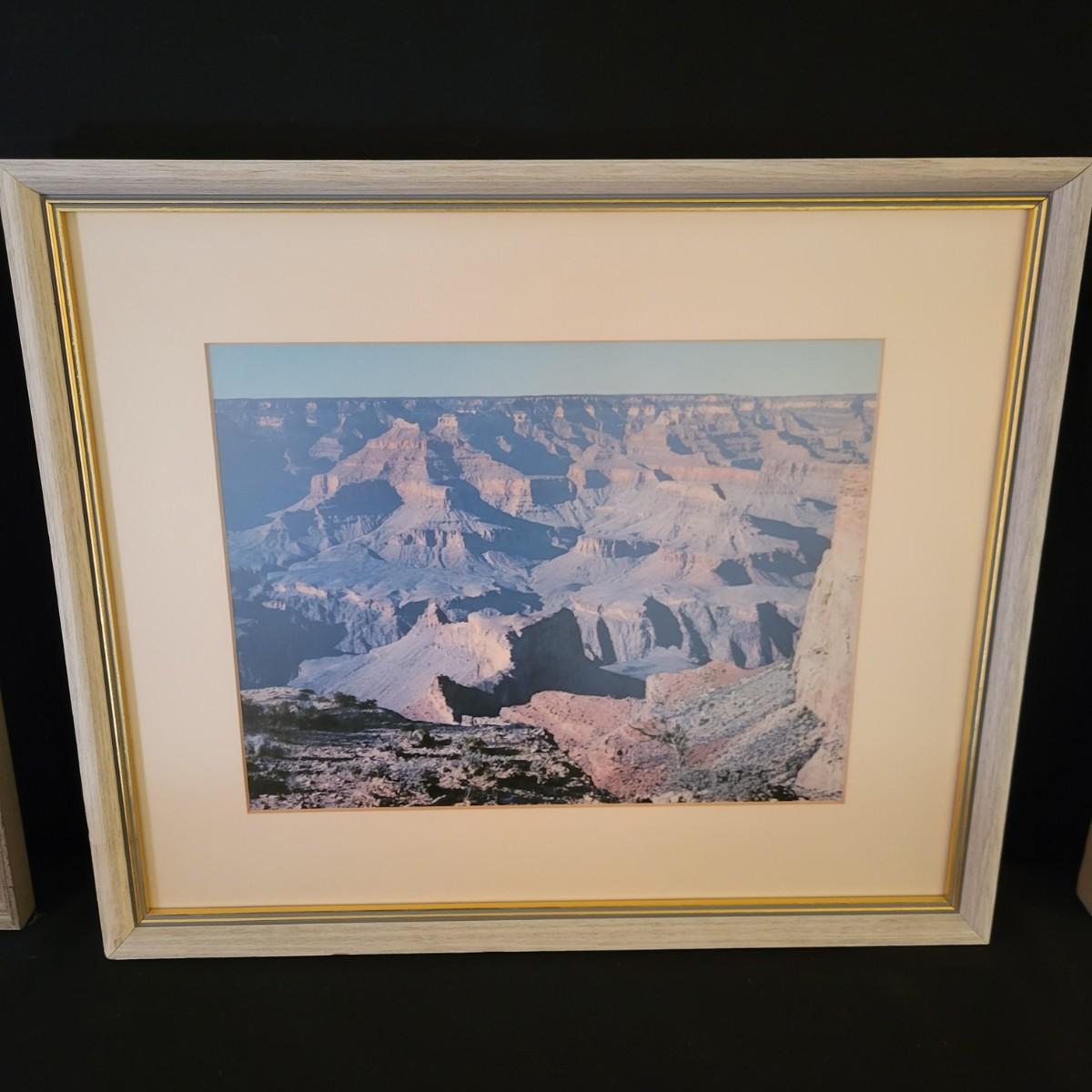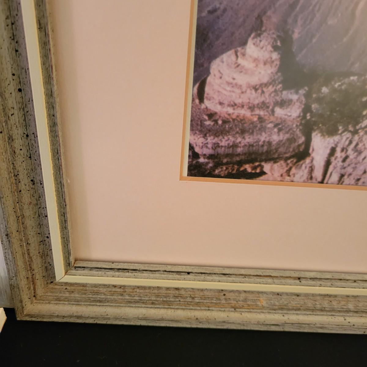 Four framed photographs of the Grand Canyon. Two are verticals with a single mat and a rustic wood frame that is gray. The other two pieces are horizontal with a single mat and distressed wood frame with a gold lip. Each piece has non glare glass. Two pieces have slipped in their mats; see photos. Shipping available. Shipping can be costly. We suggest contacting our preferred local shipping provider, Postage Express, with dimensions and getting an estimate before bidding: (828) 670-5501 or postageexpress@yahoo.com.