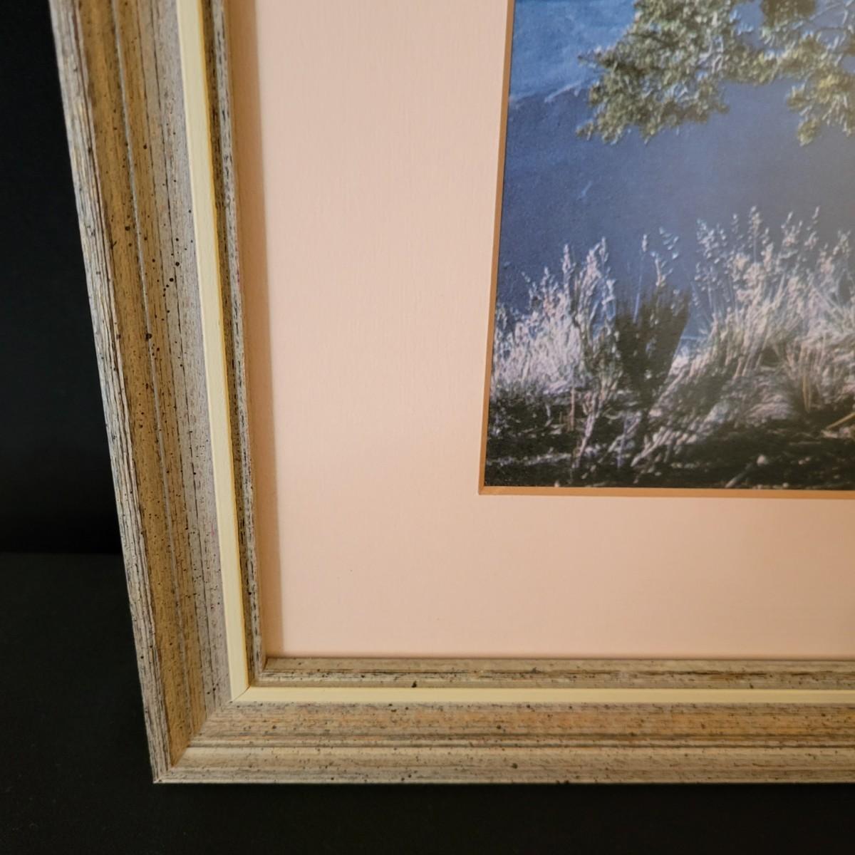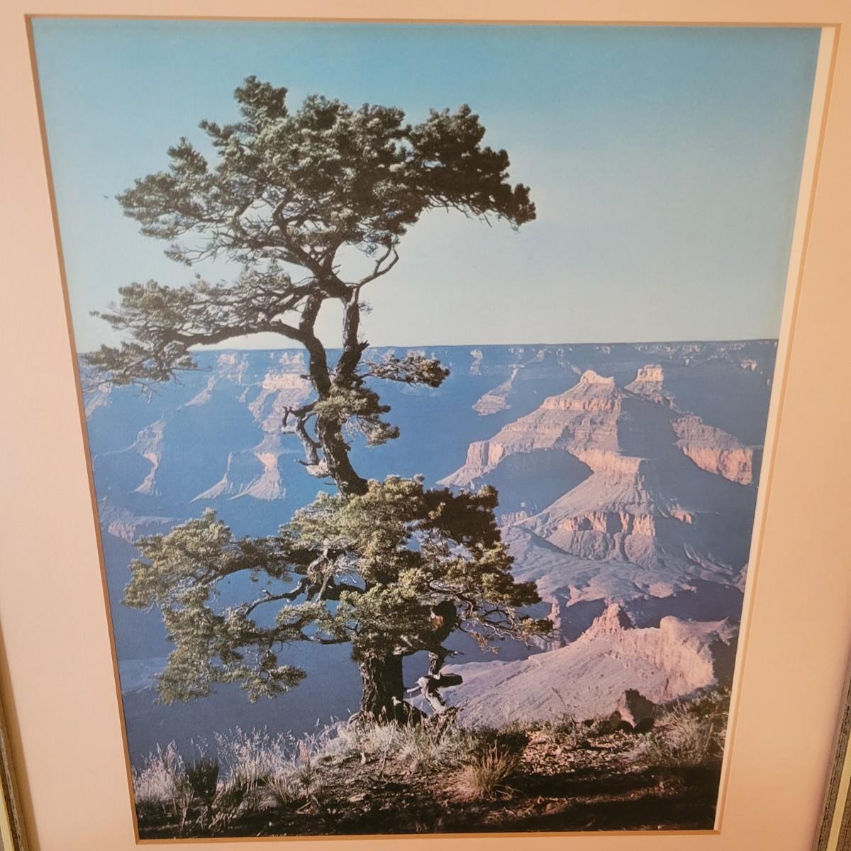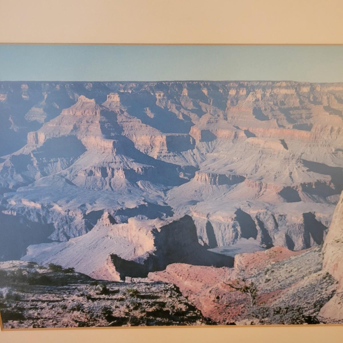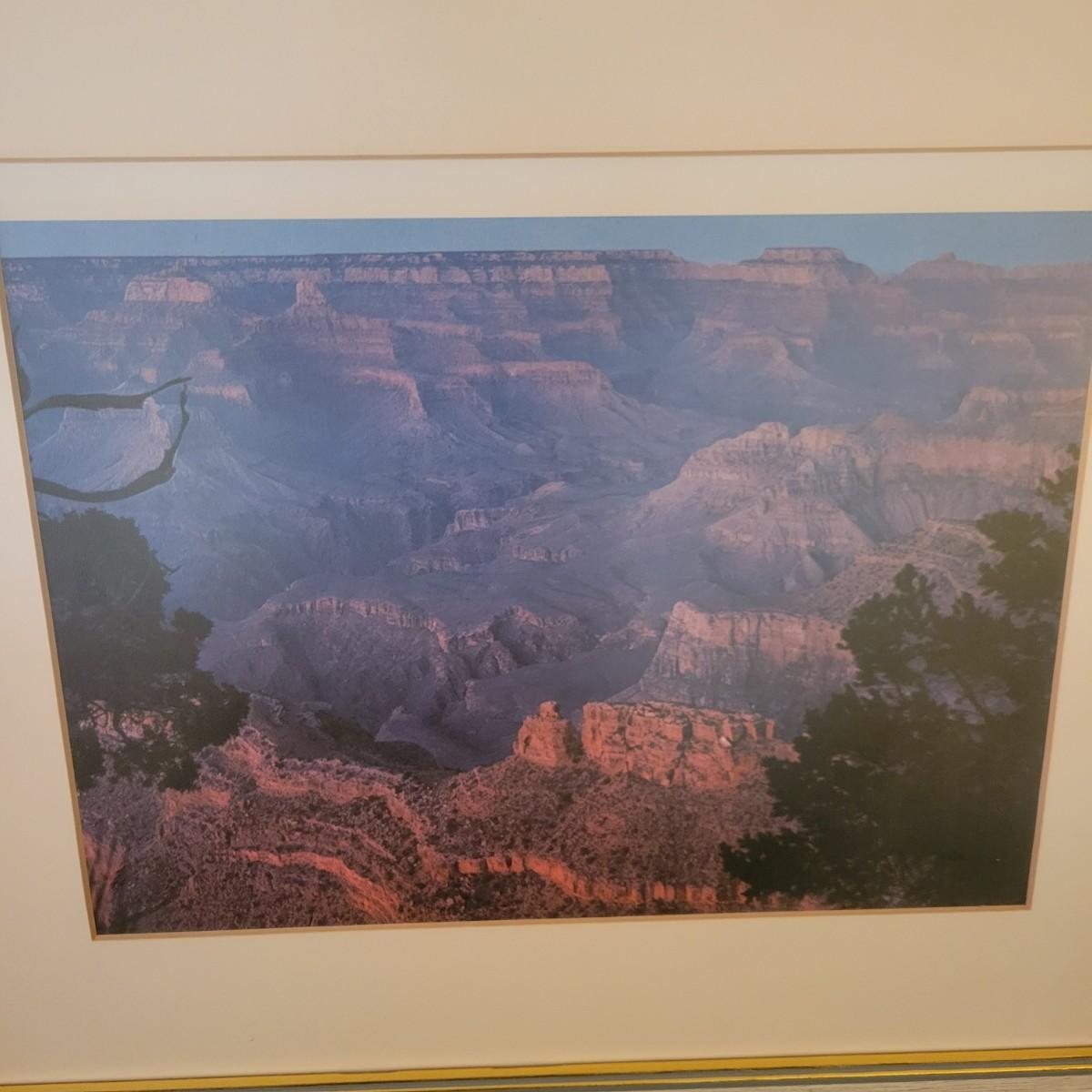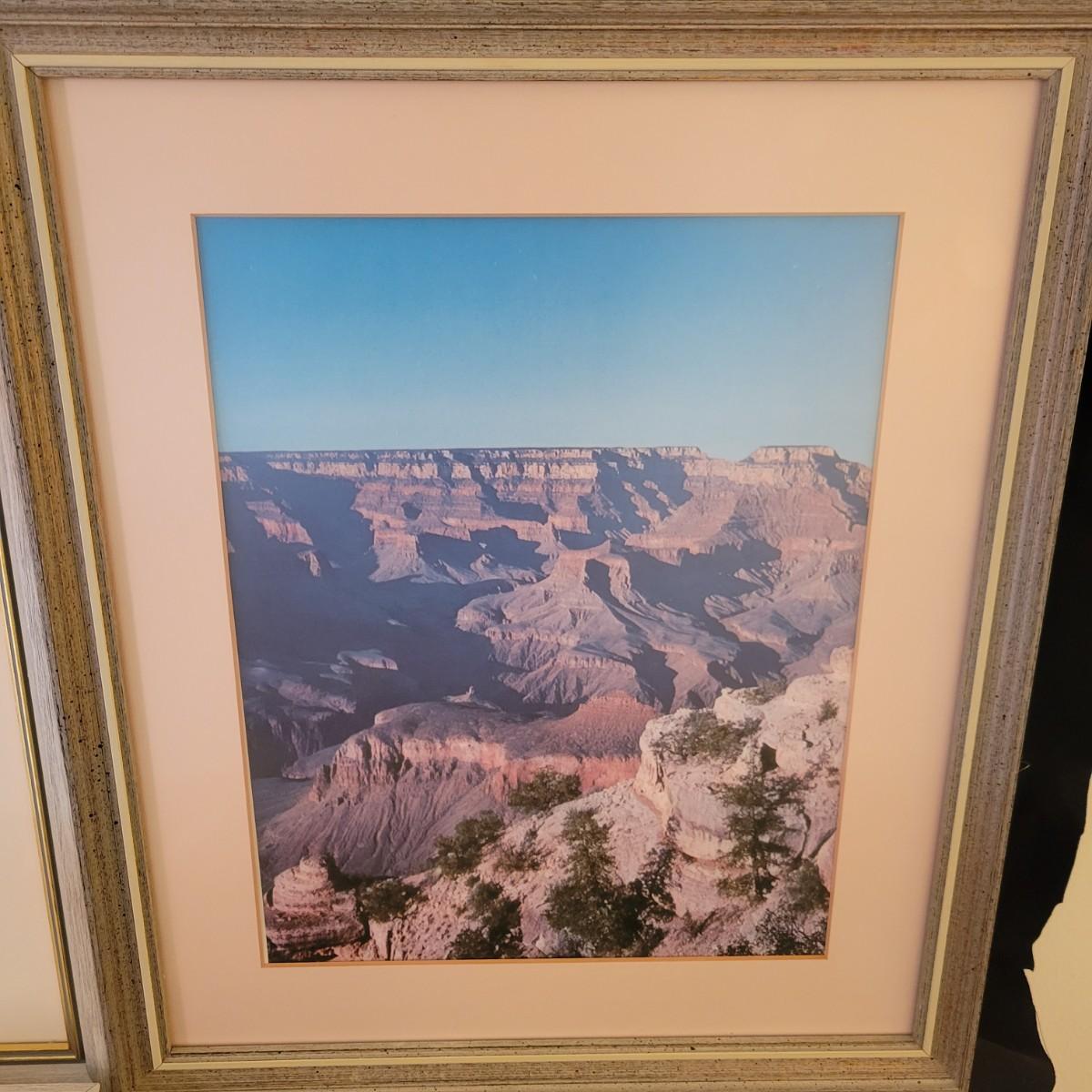 Four framed photographs of the Grand Canyon. Two are verticals with a single mat and a rustic wood frame that is gray. The other two pieces are horizontal with a single mat and distressed wood frame with a gold lip. Each piece has non glare glass. Two pieces have slipped in their mats; see photos. Shipping available. Shipping can be costly. We suggest contacting our preferred local shipping provider, Postage Express, with dimensions and getting an estimate before bidding: (828) 670-5501 or postageexpress@yahoo.com.