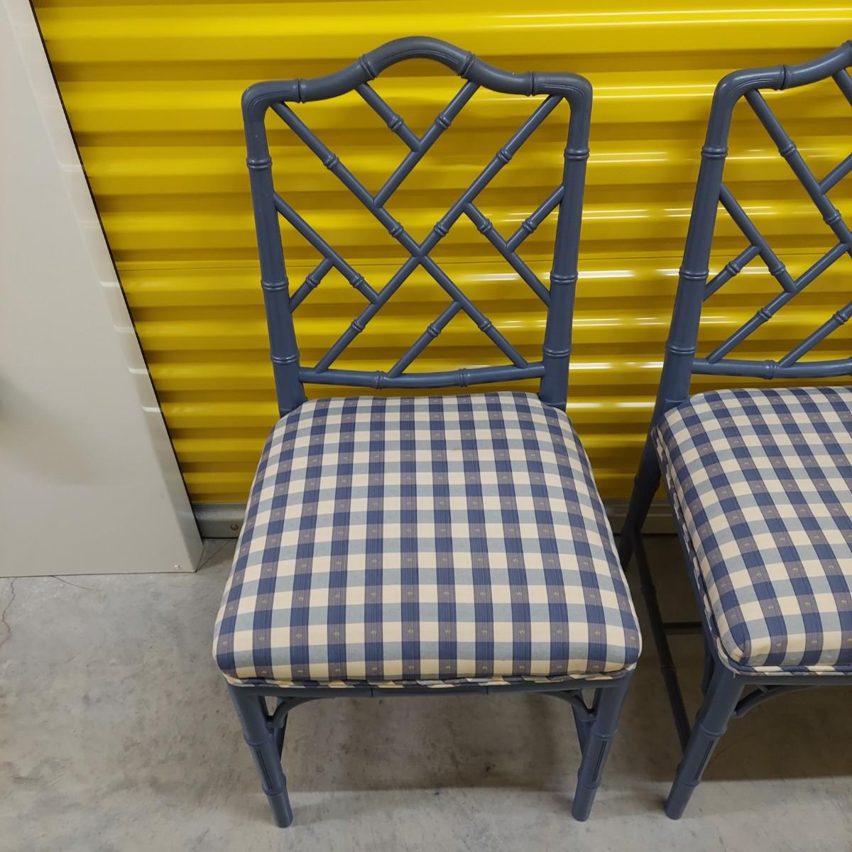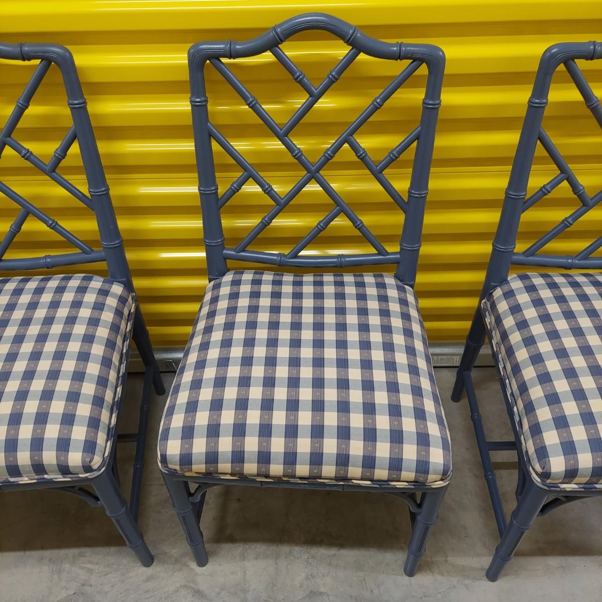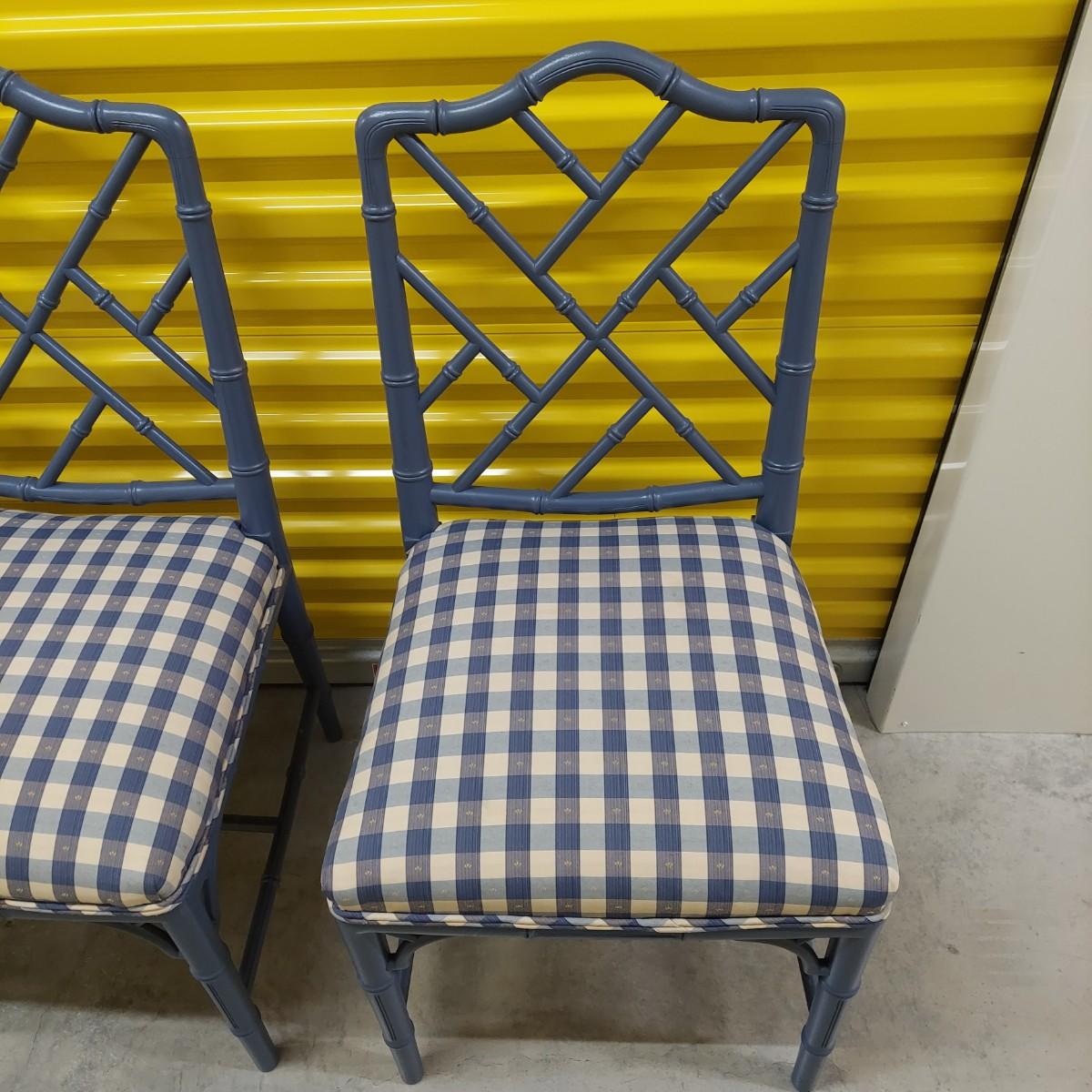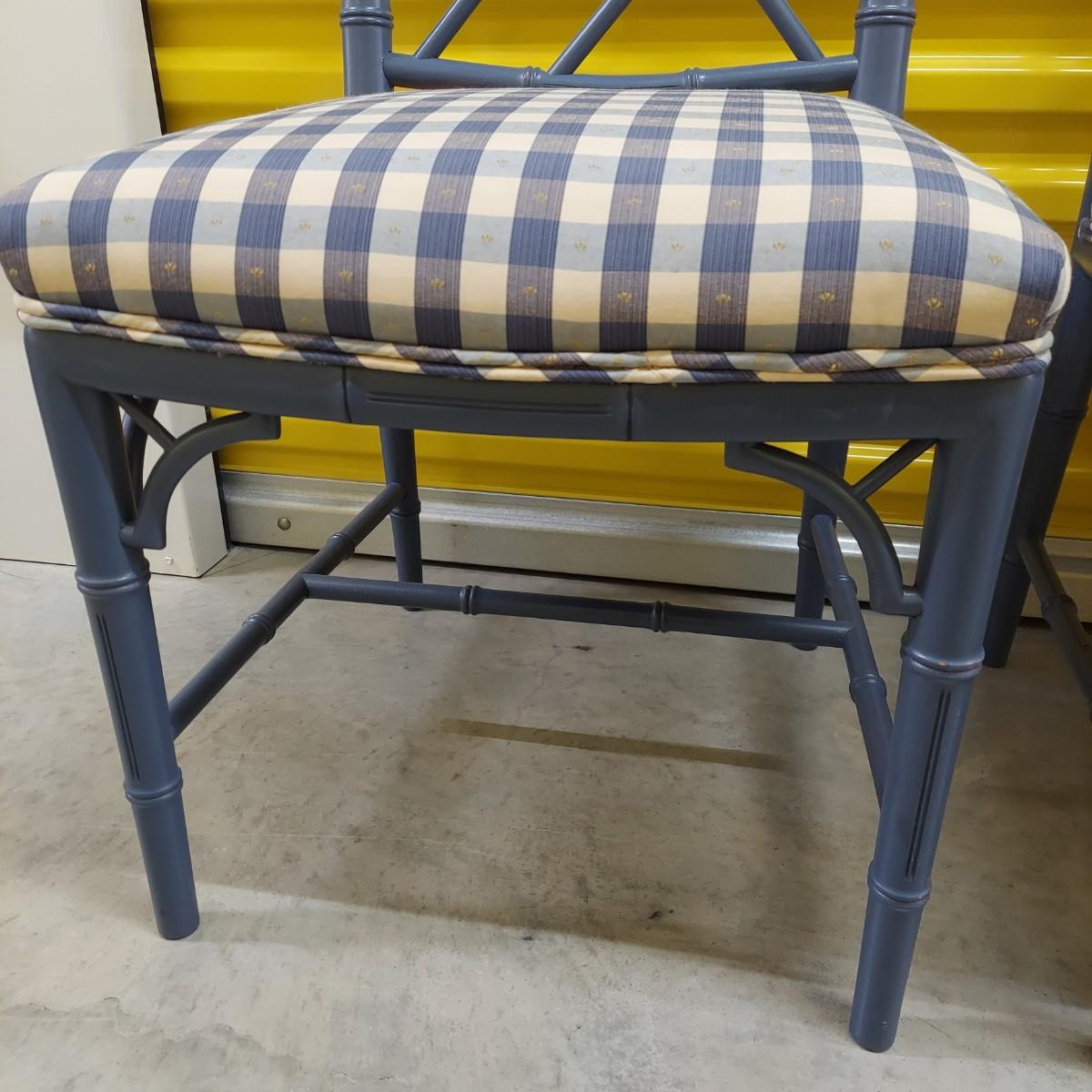 Four French country style dining chairs. Faux bamboo wood that's been painted blue with gingham upholstered seats. Each measures approximately 19” x 18” x 36"H with a 19” seat height. Some scratches. Please see photos for details. Local Pickup Only