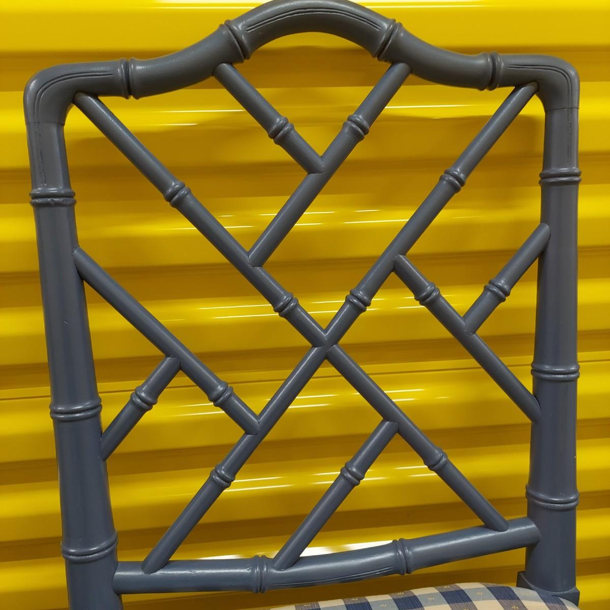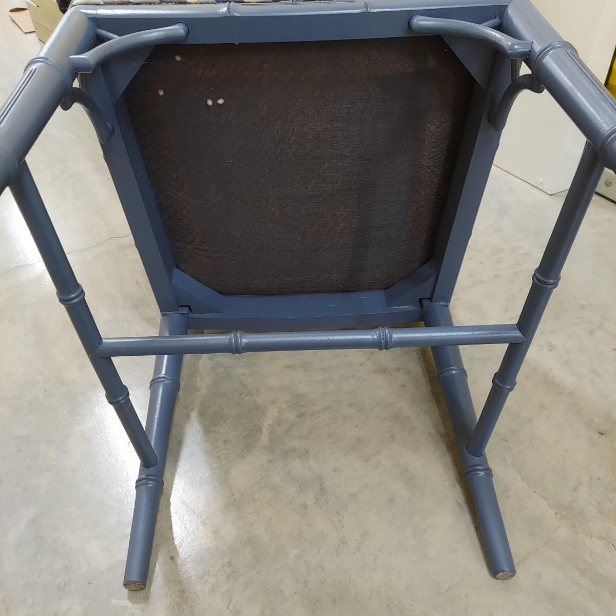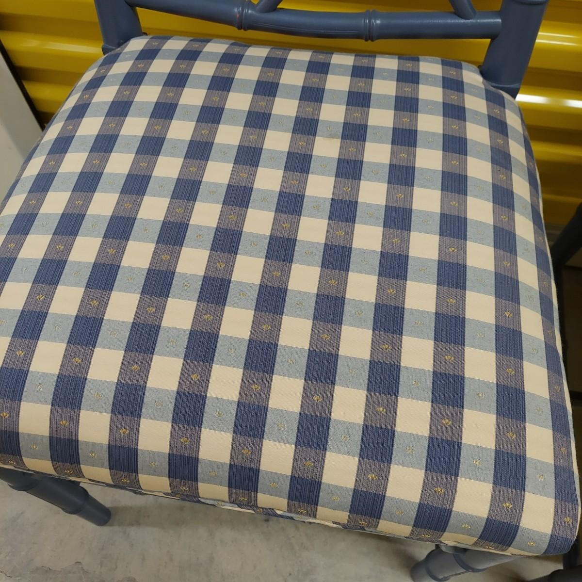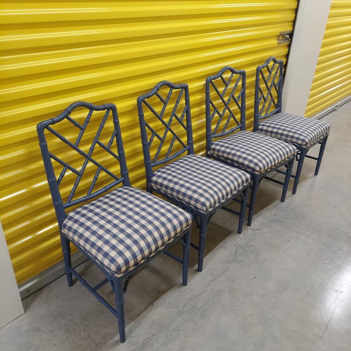 Four French country style dining chairs. Faux bamboo wood that's been painted blue with gingham upholstered seats. Each measures approximately 19” x 18” x 36"H with a 19” seat height. Some scratches. Please see photos for details. Local Pickup Only