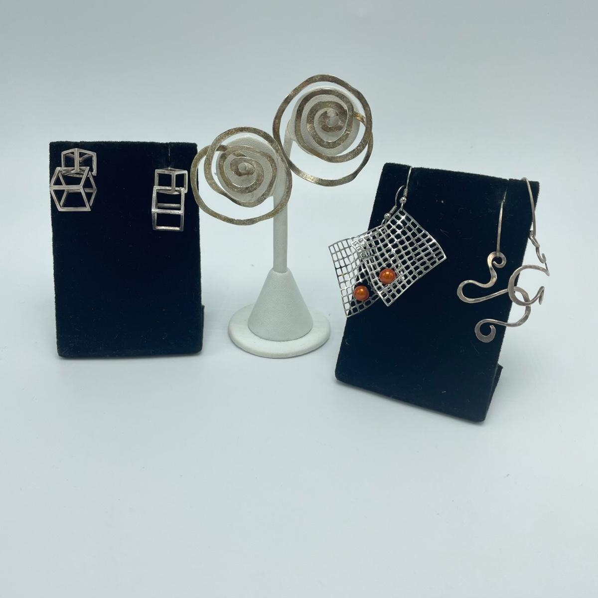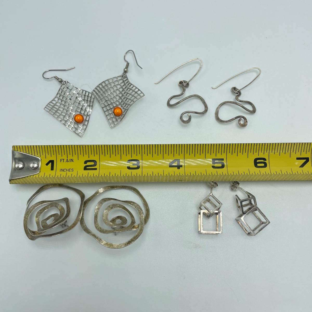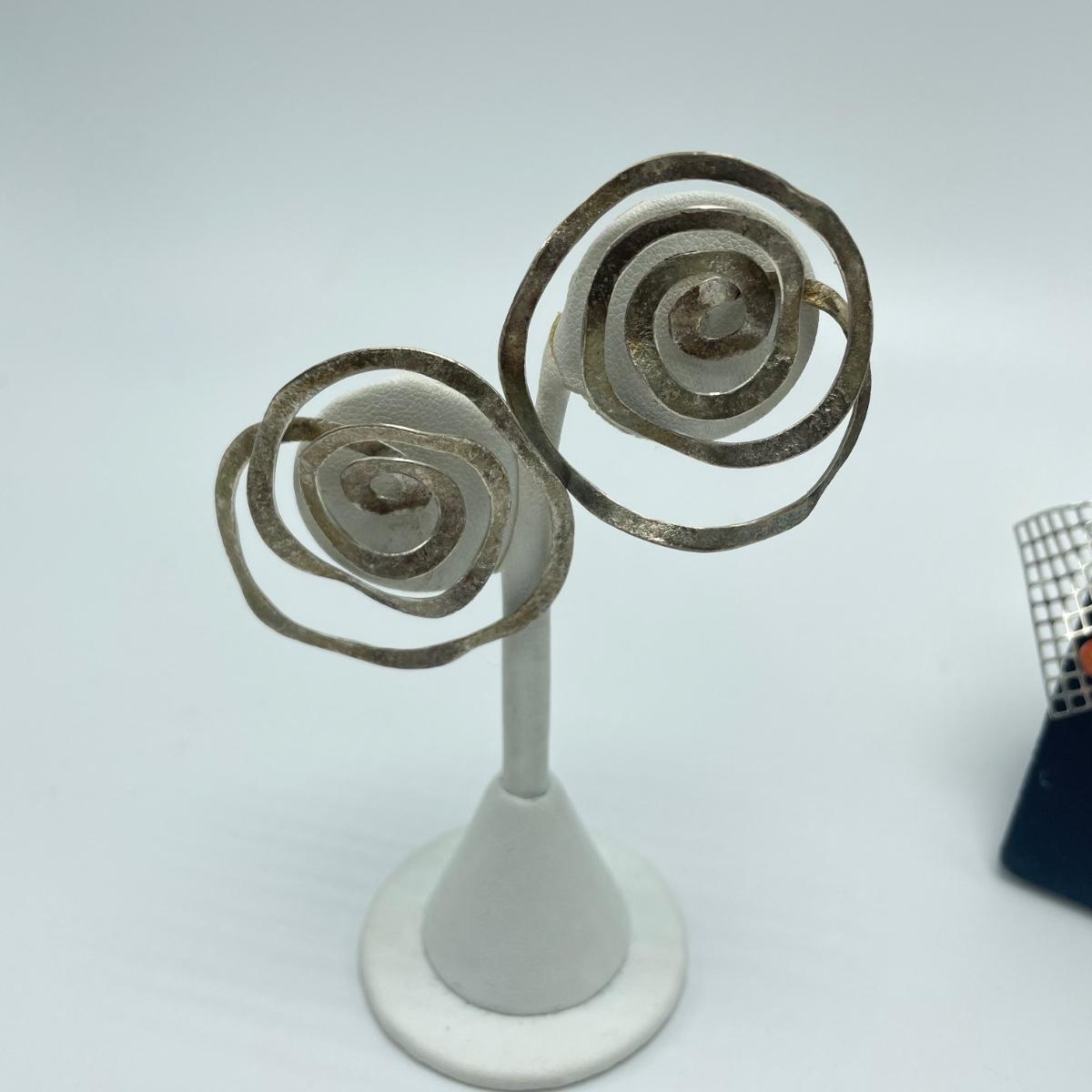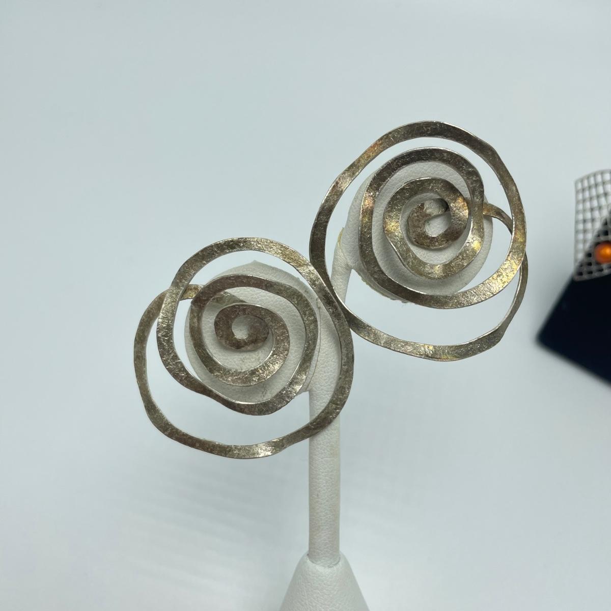 Four fun and funky pairs of earrings. All appear to be hand crafted and unique. The large spiral pair are marked Sterling. See images. Shipping available.