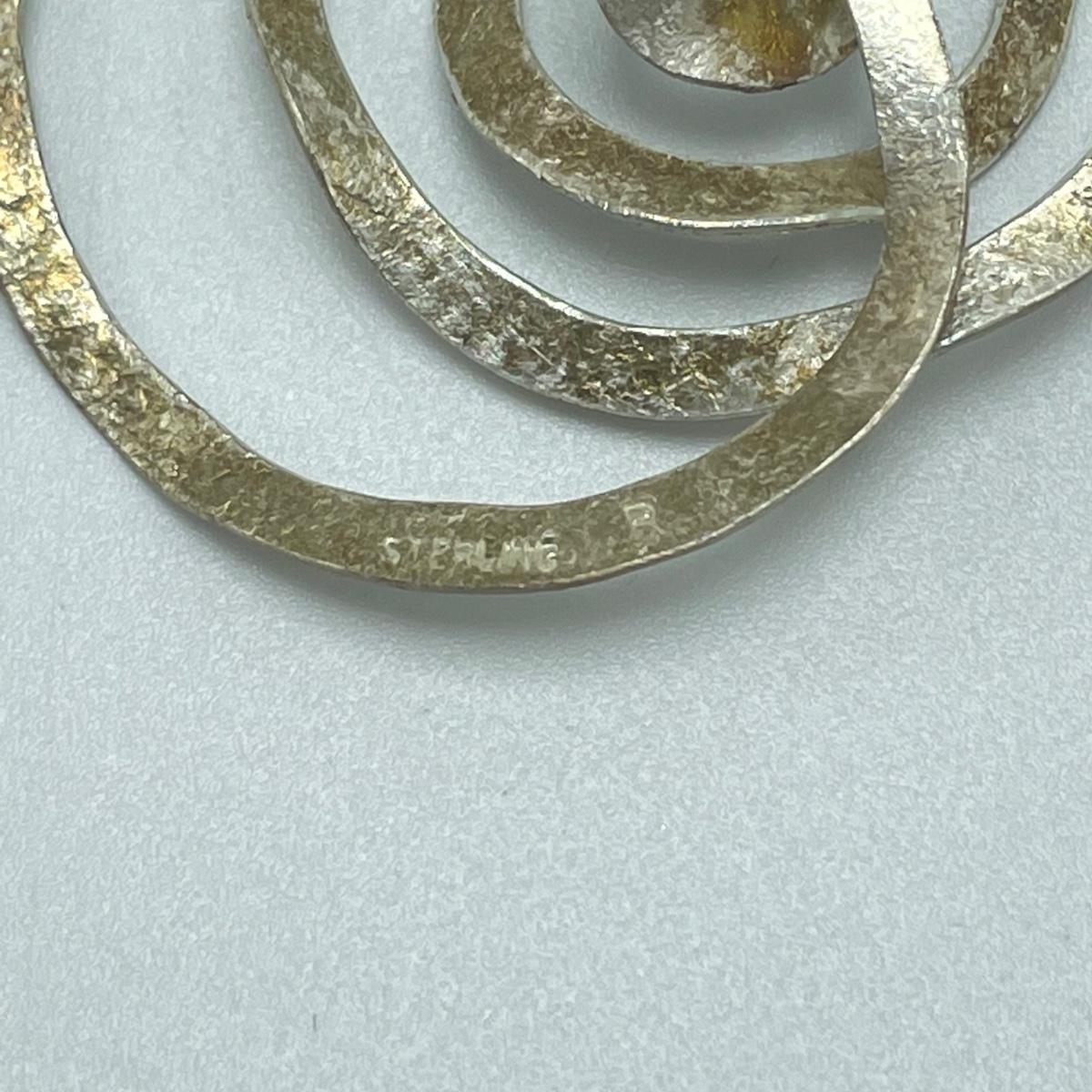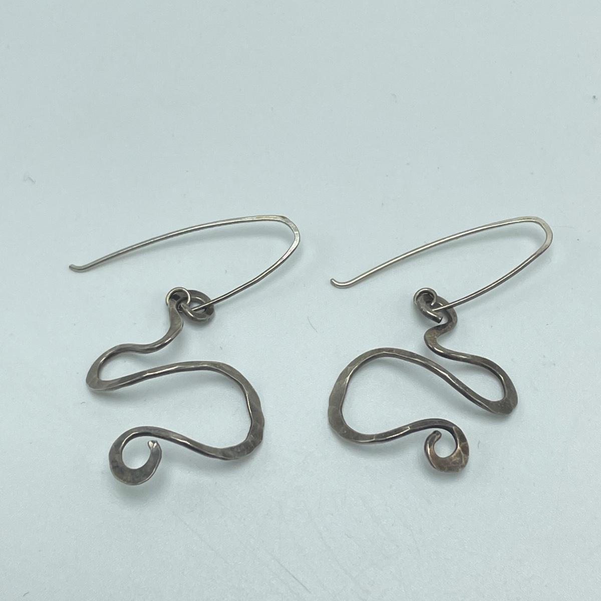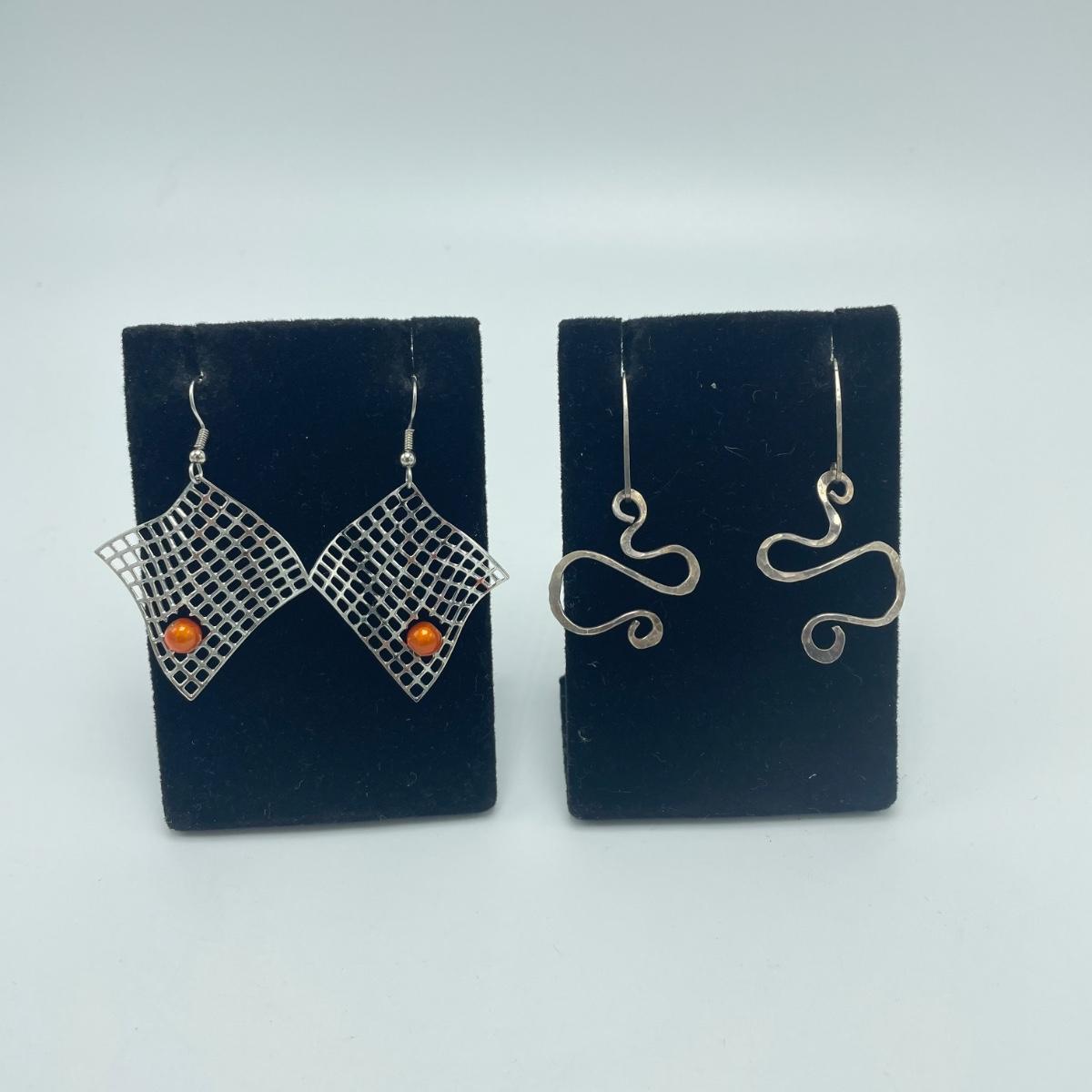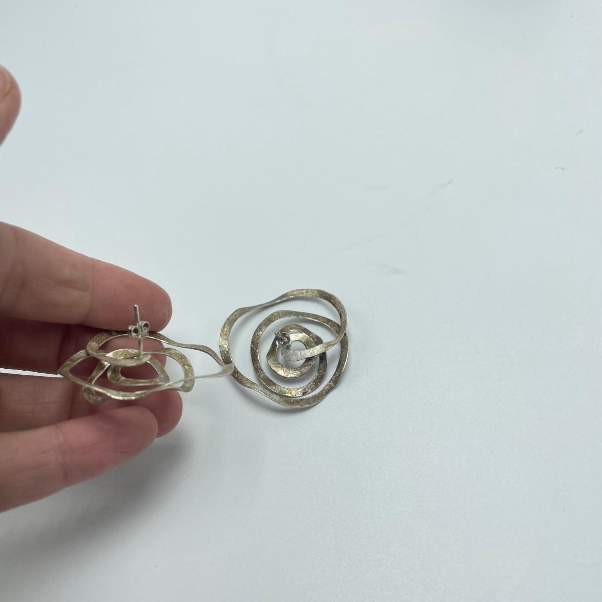 Four fun and funky pairs of earrings. All appear to be hand crafted and unique. The large spiral pair are marked Sterling. See images. Shipping available.