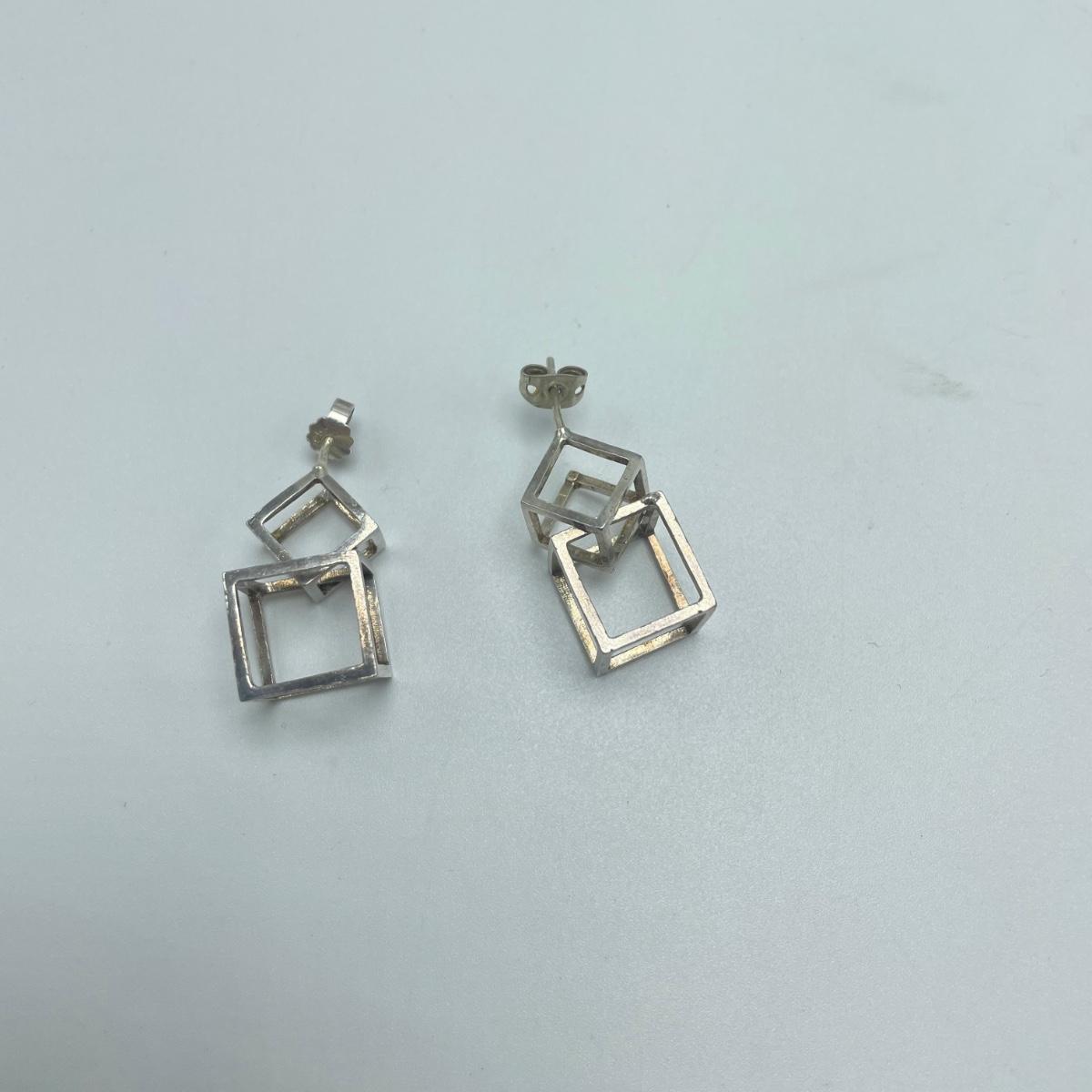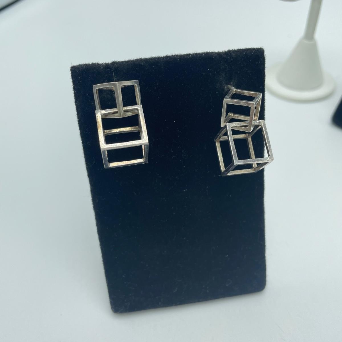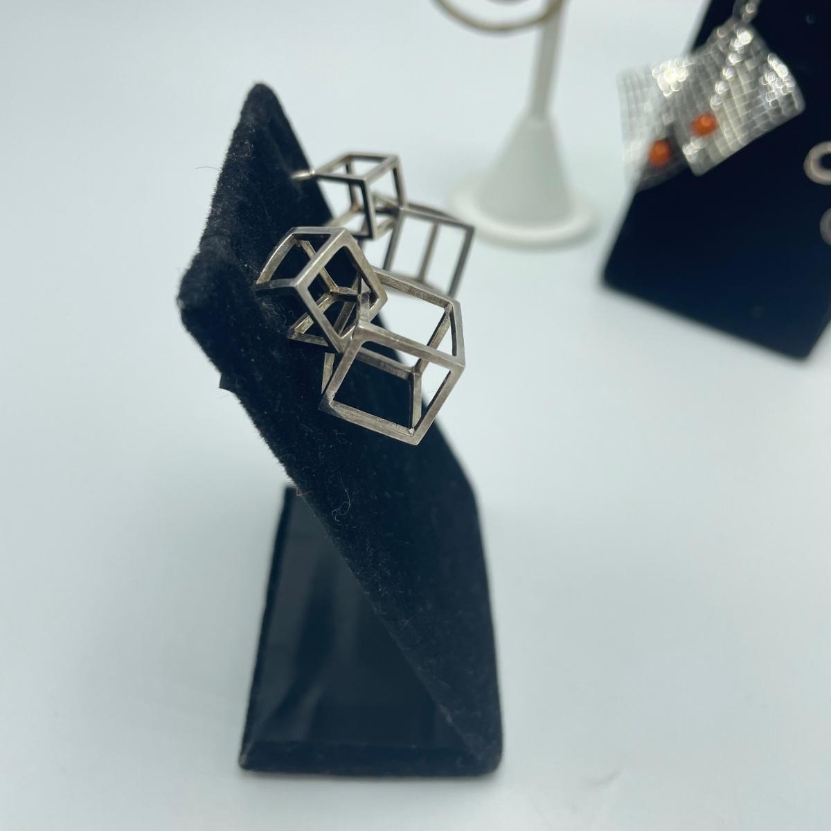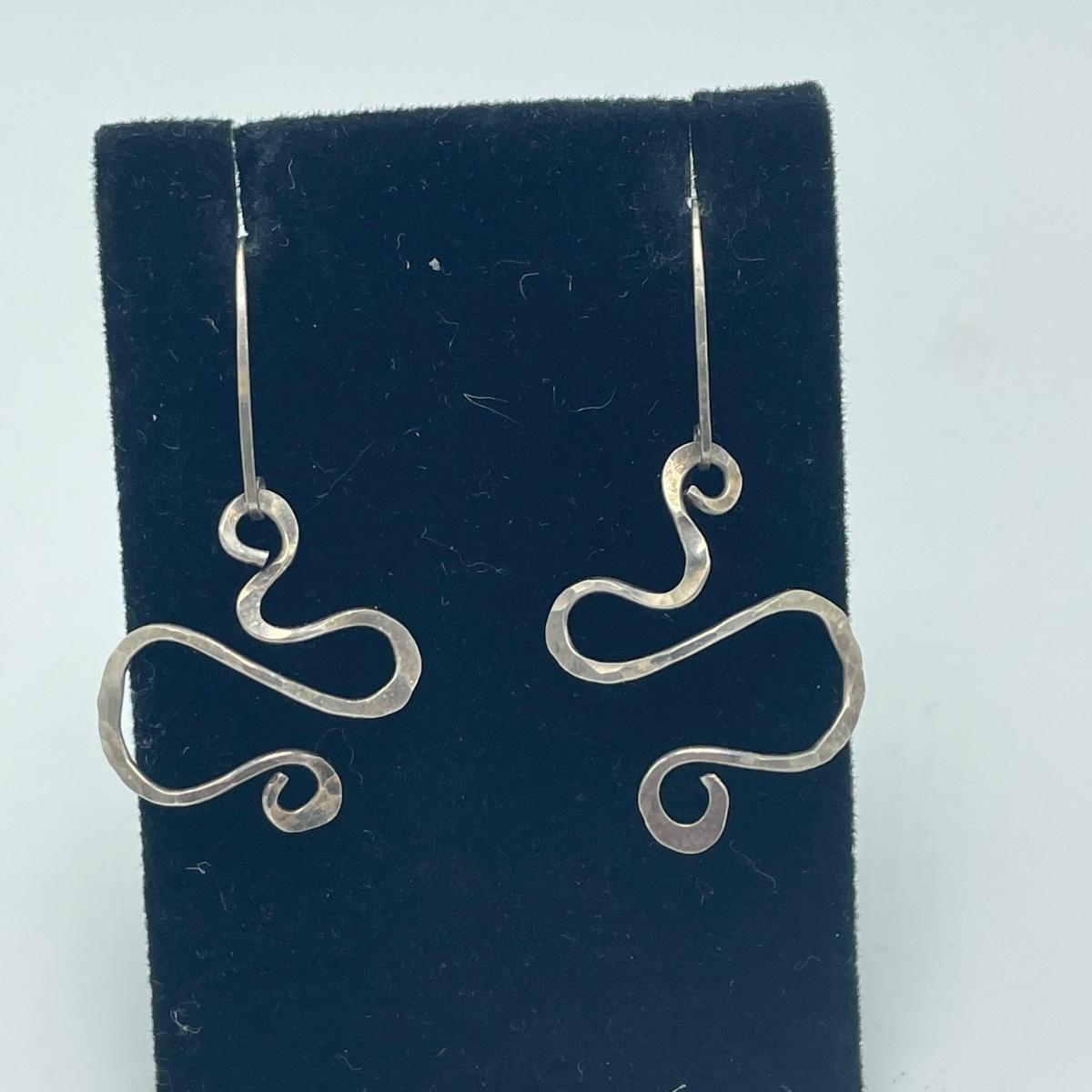 Four fun and funky pairs of earrings. All appear to be hand crafted and unique. The large spiral pair are marked Sterling. See images. Shipping available.