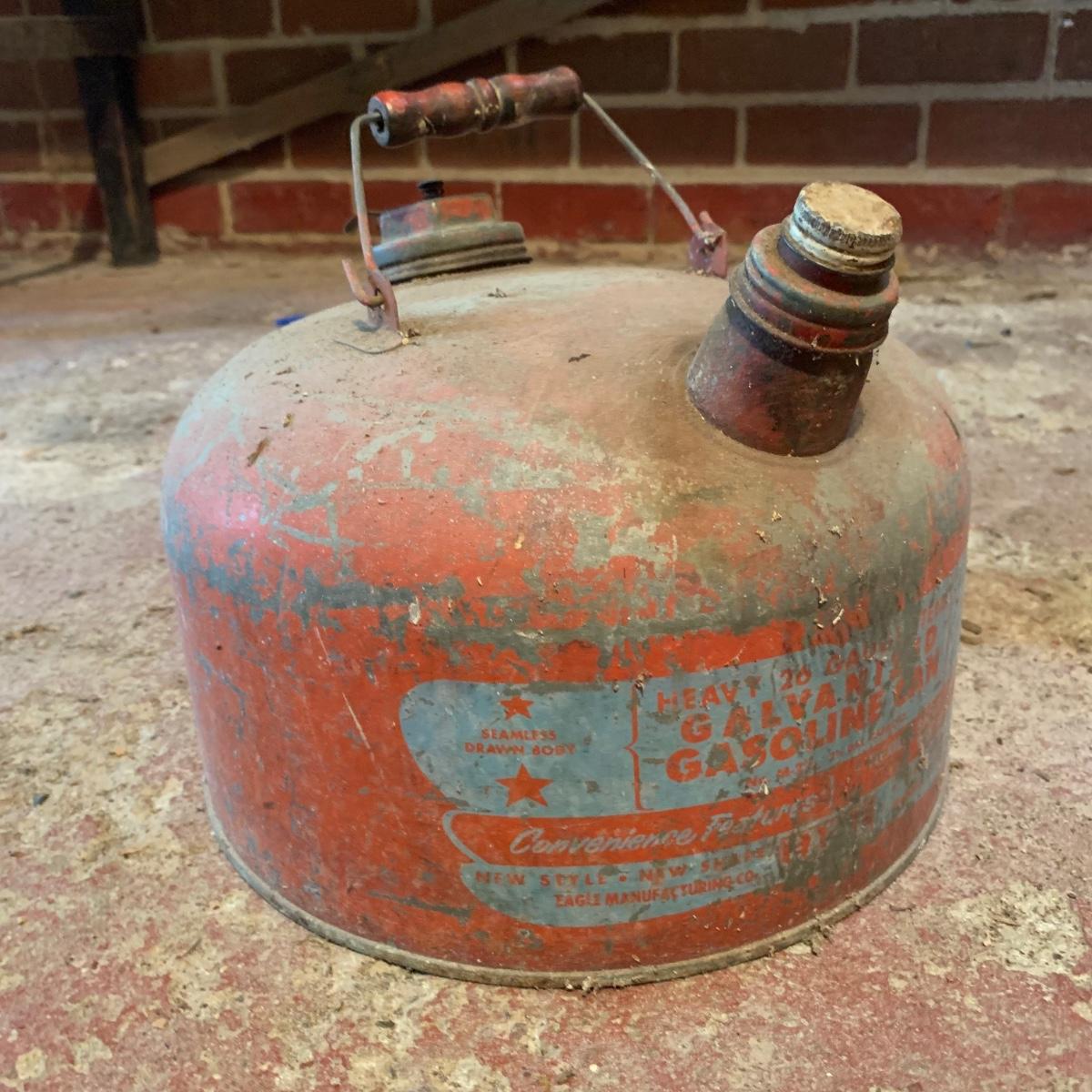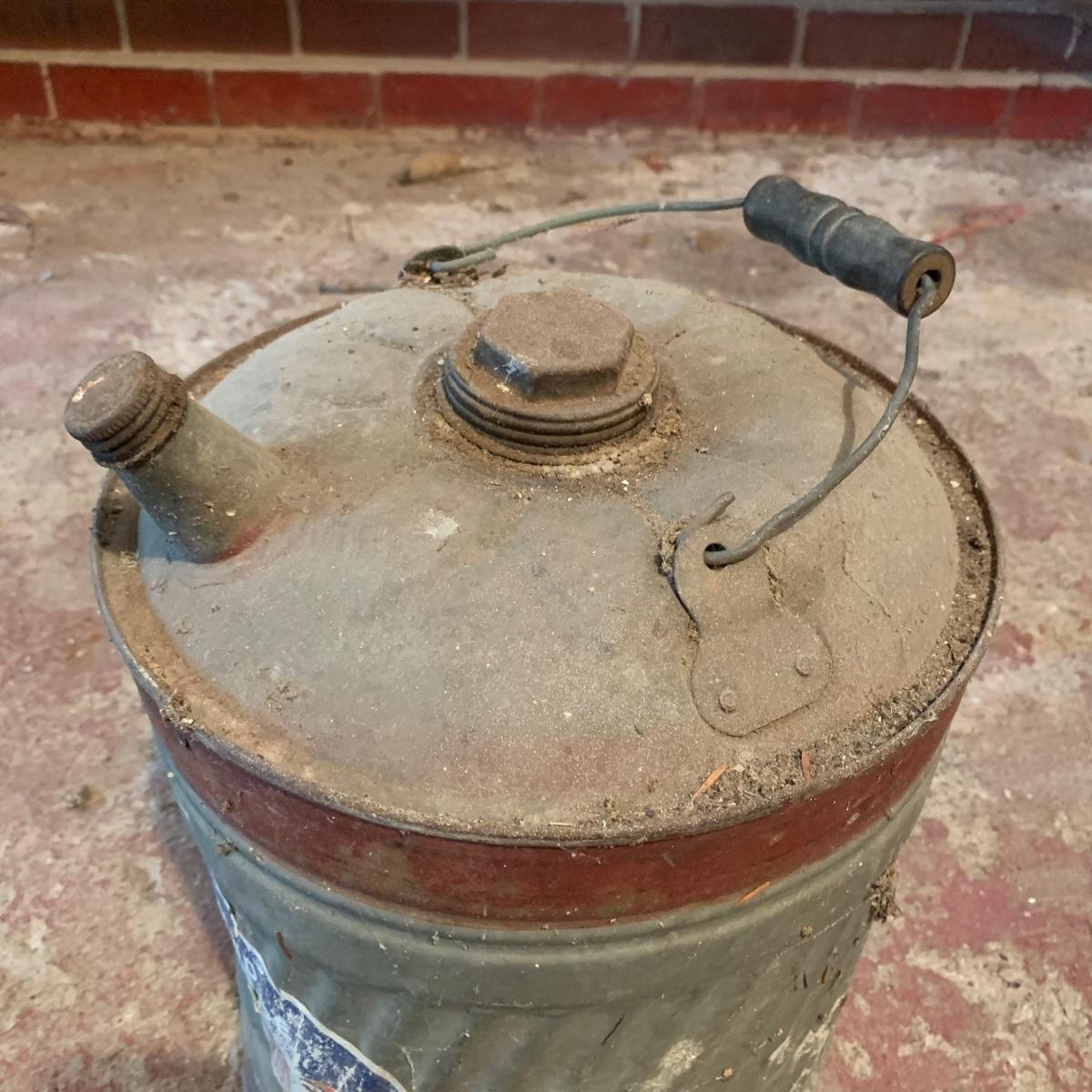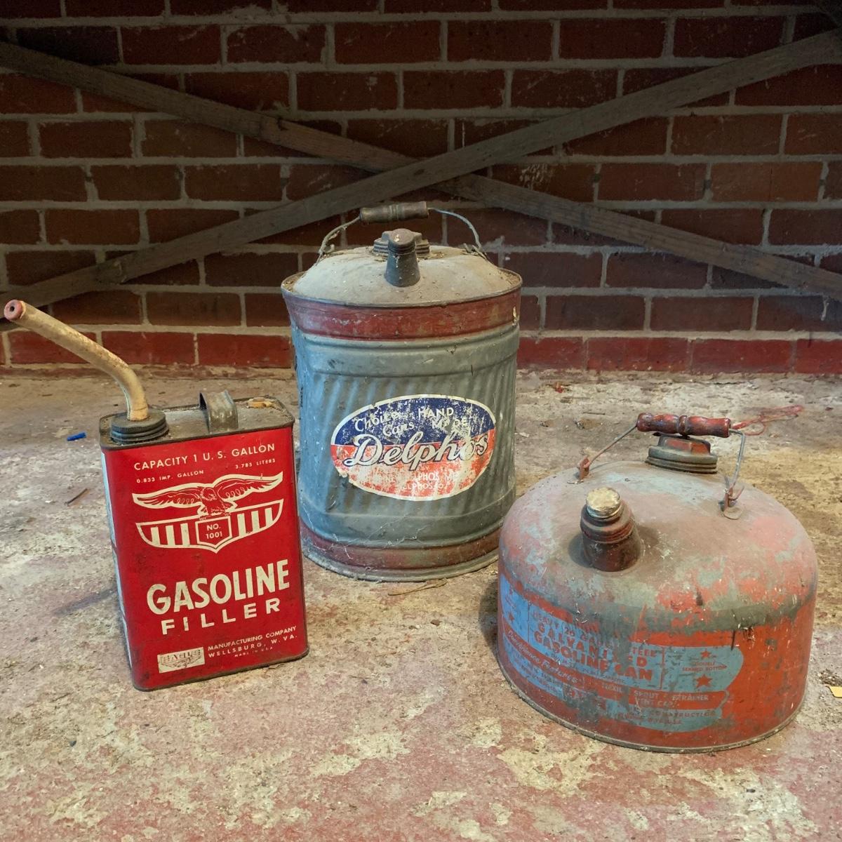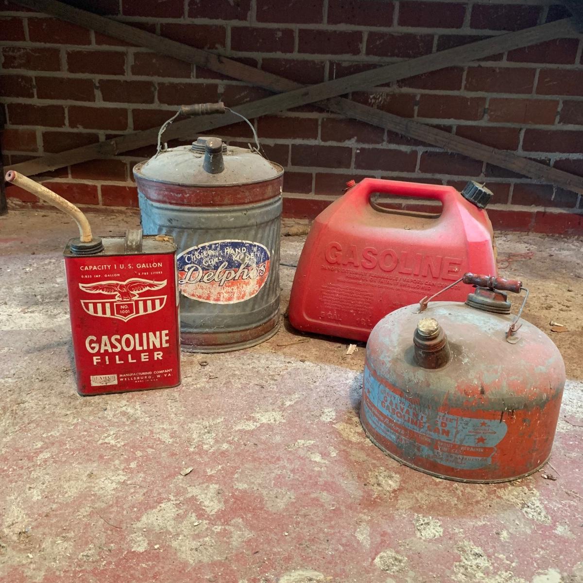 This lot contains three vintage metal gas cans and one modern plastic Rubbermaid “Can-Tainer”. They range from one-gallon to five-gallon containers. They have all gathered quite a bit of dust from being stored in the garage. The largest metal container has some denting. There is some liquid in each container, but we cannot verify the contents. A layer of plastic or towels for your car is recommended to the winning bidder for transport. Local pickup only.