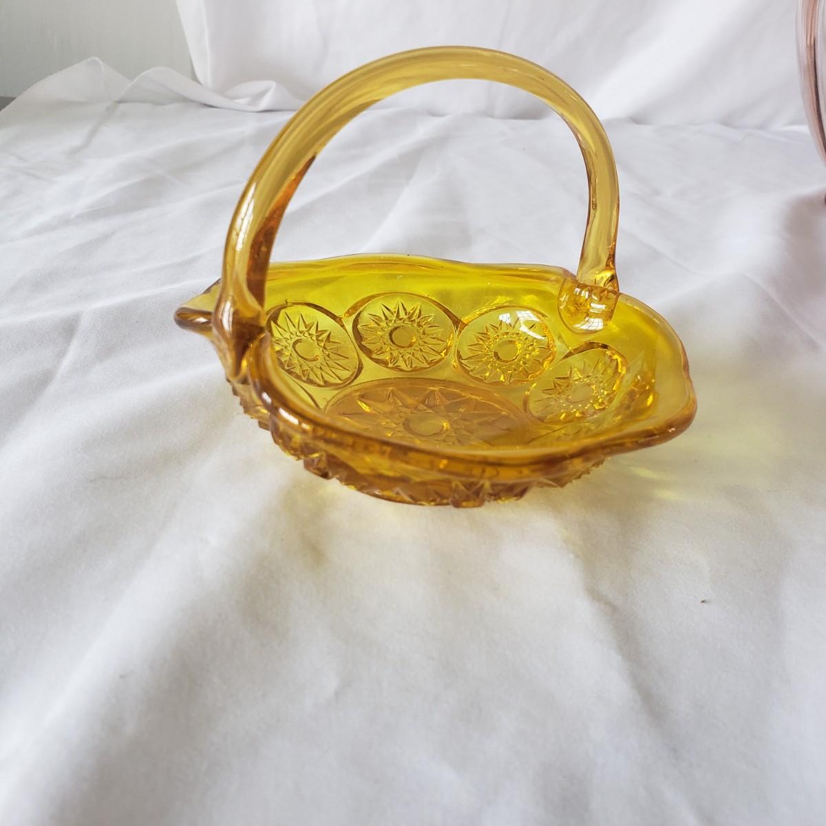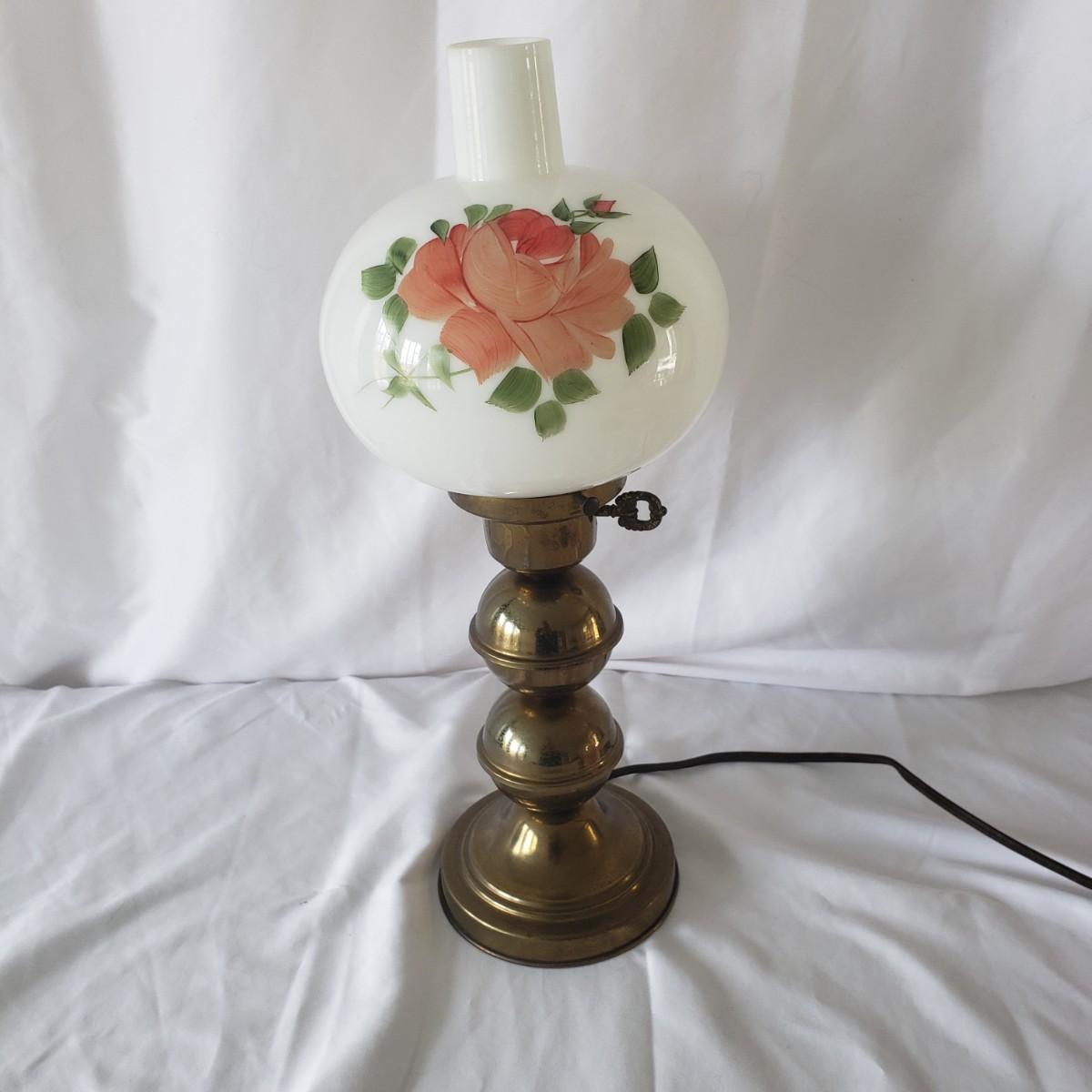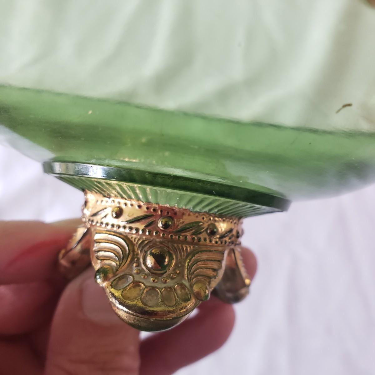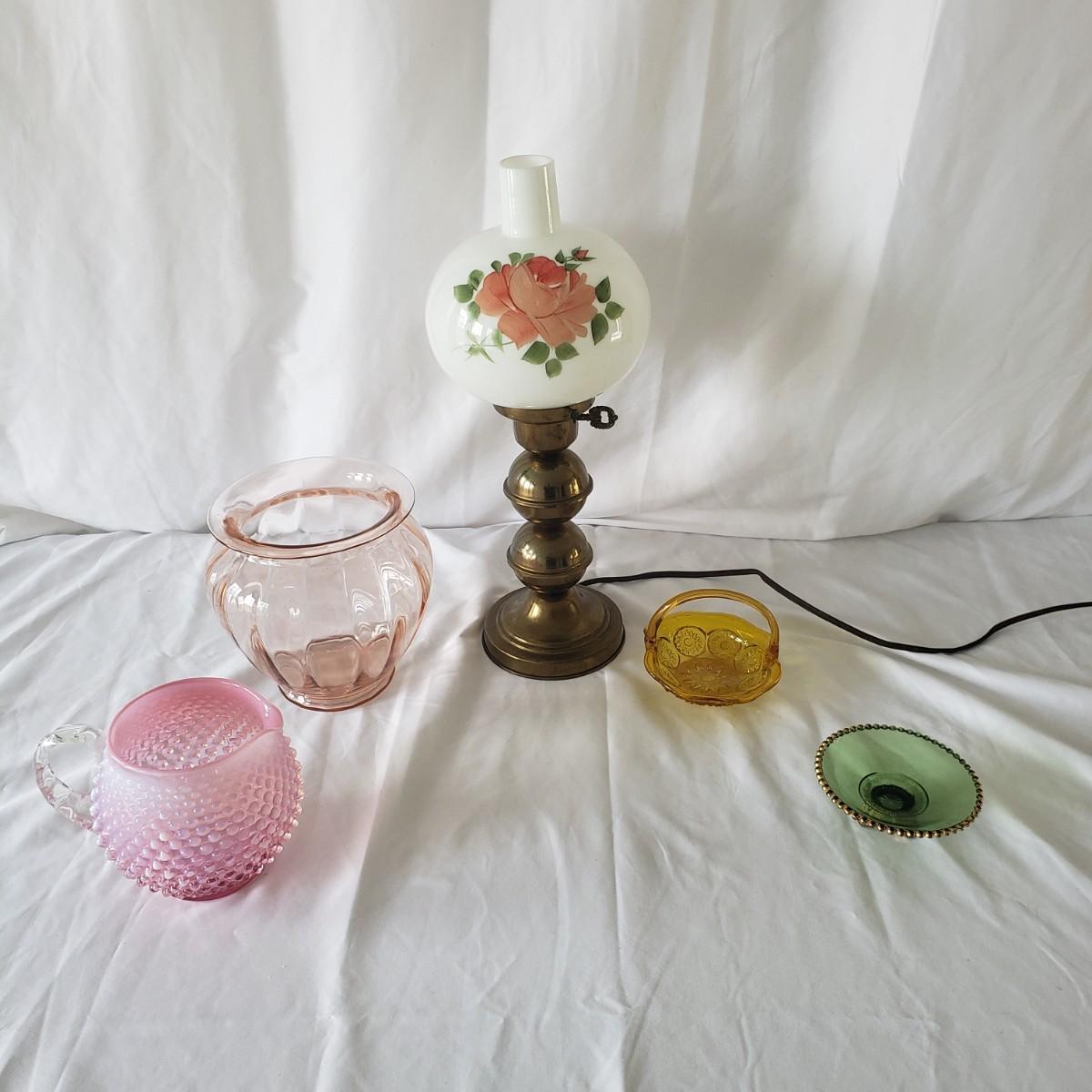 This lot contains four decorative glass items and a hand painted glass and brass lamp. The green bowl has gold edging and feet. The golden yellow bowl with handle is rough cut glass on the bottom. The hobnail pitcher is in pinks, clear and white tones and measures 7" x 5"H. The largest vase appears to be depression glass. The brass lamp with white glass lampshade is hand painted and measures 5" x 18"H. We cannot verify the lamp works.