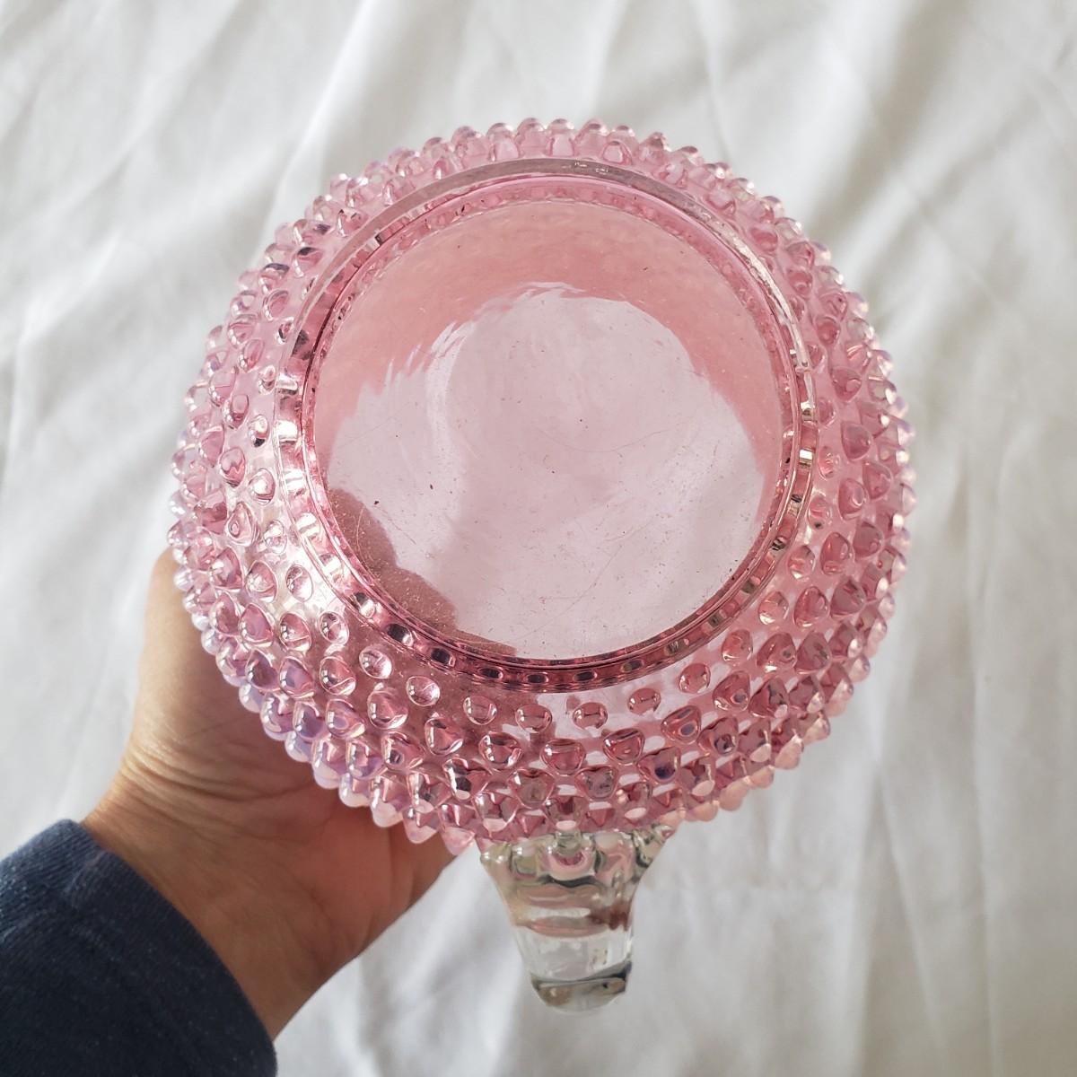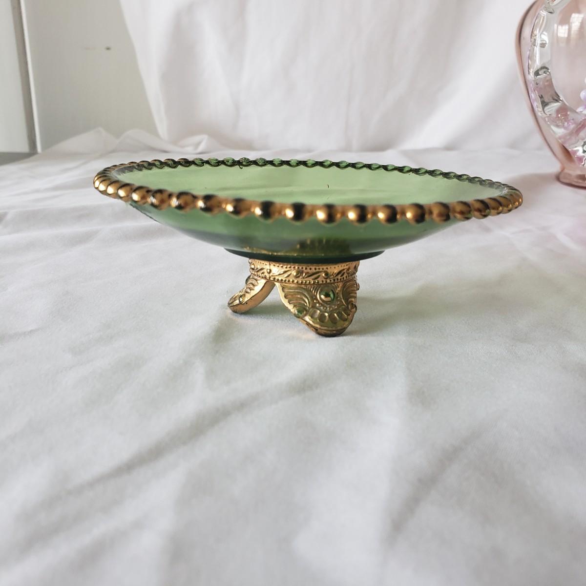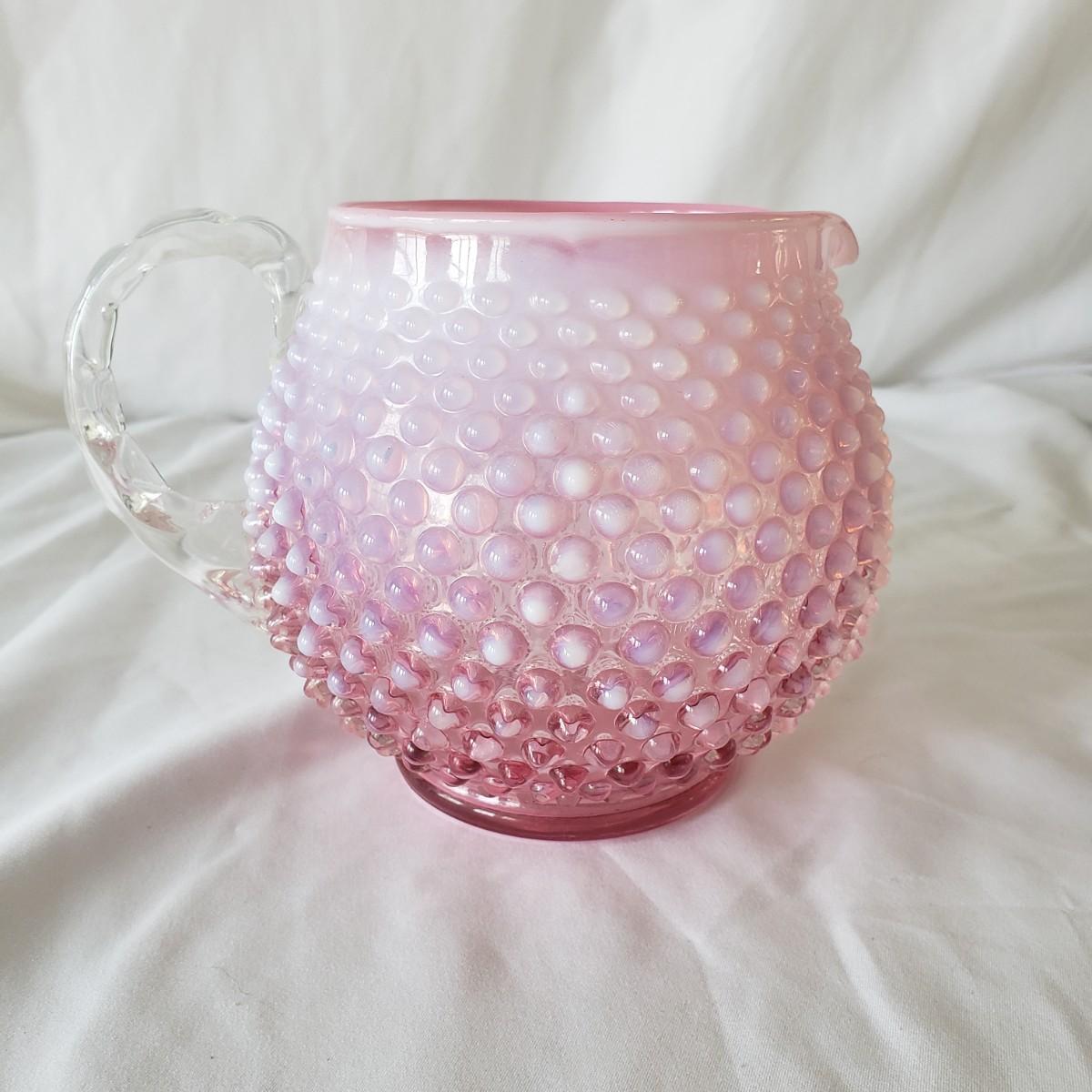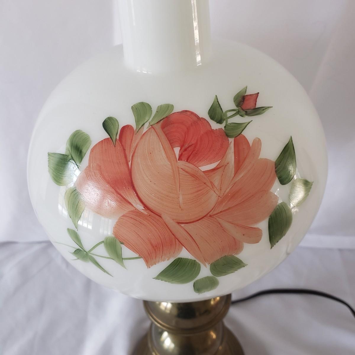 This lot contains four decorative glass items and a hand painted glass and brass lamp. The green bowl has gold edging and feet. The golden yellow bowl with handle is rough cut glass on the bottom. The hobnail pitcher is in pinks, clear and white tones and measures 7" x 5"H. The largest vase appears to be depression glass. The brass lamp with white glass lampshade is hand painted and measures 5" x 18"H. We cannot verify the lamp works.