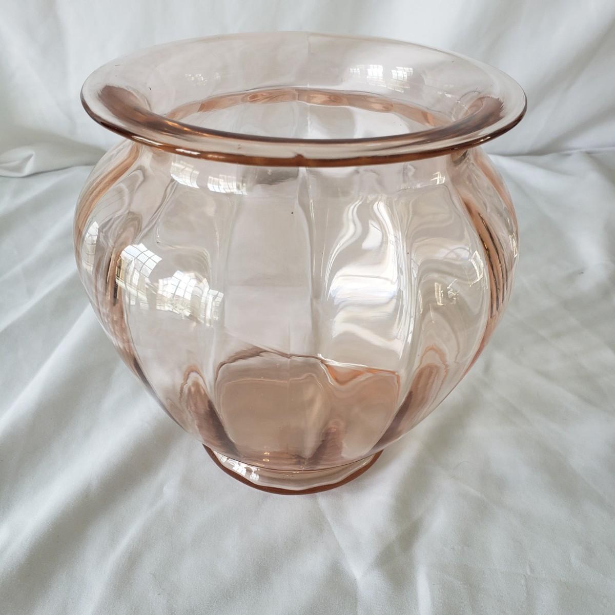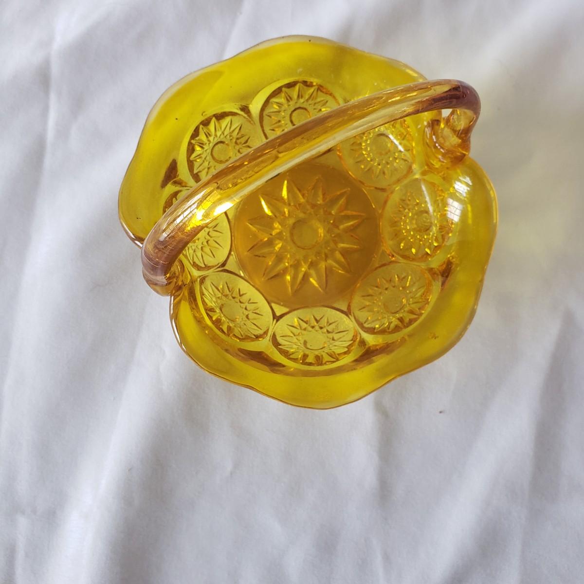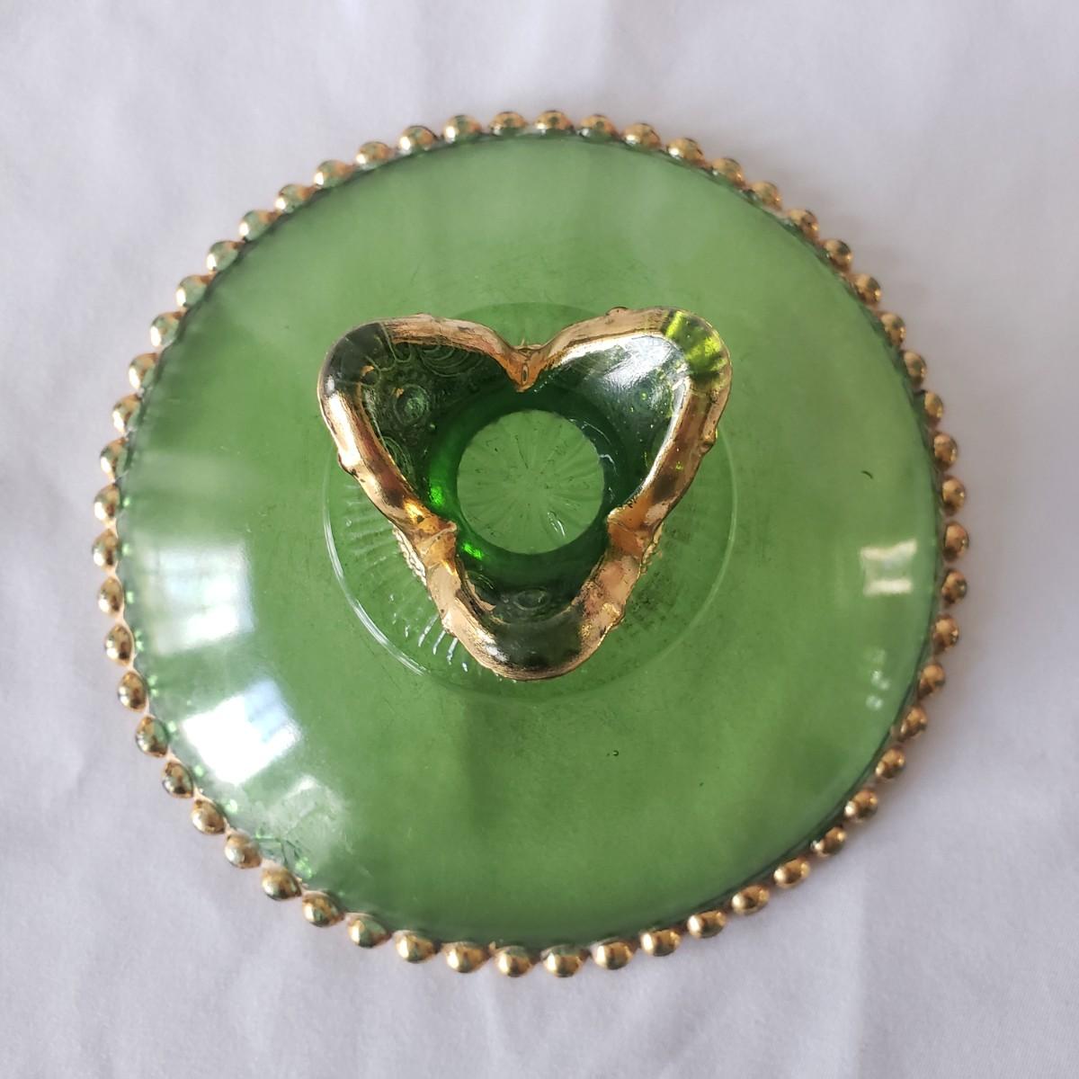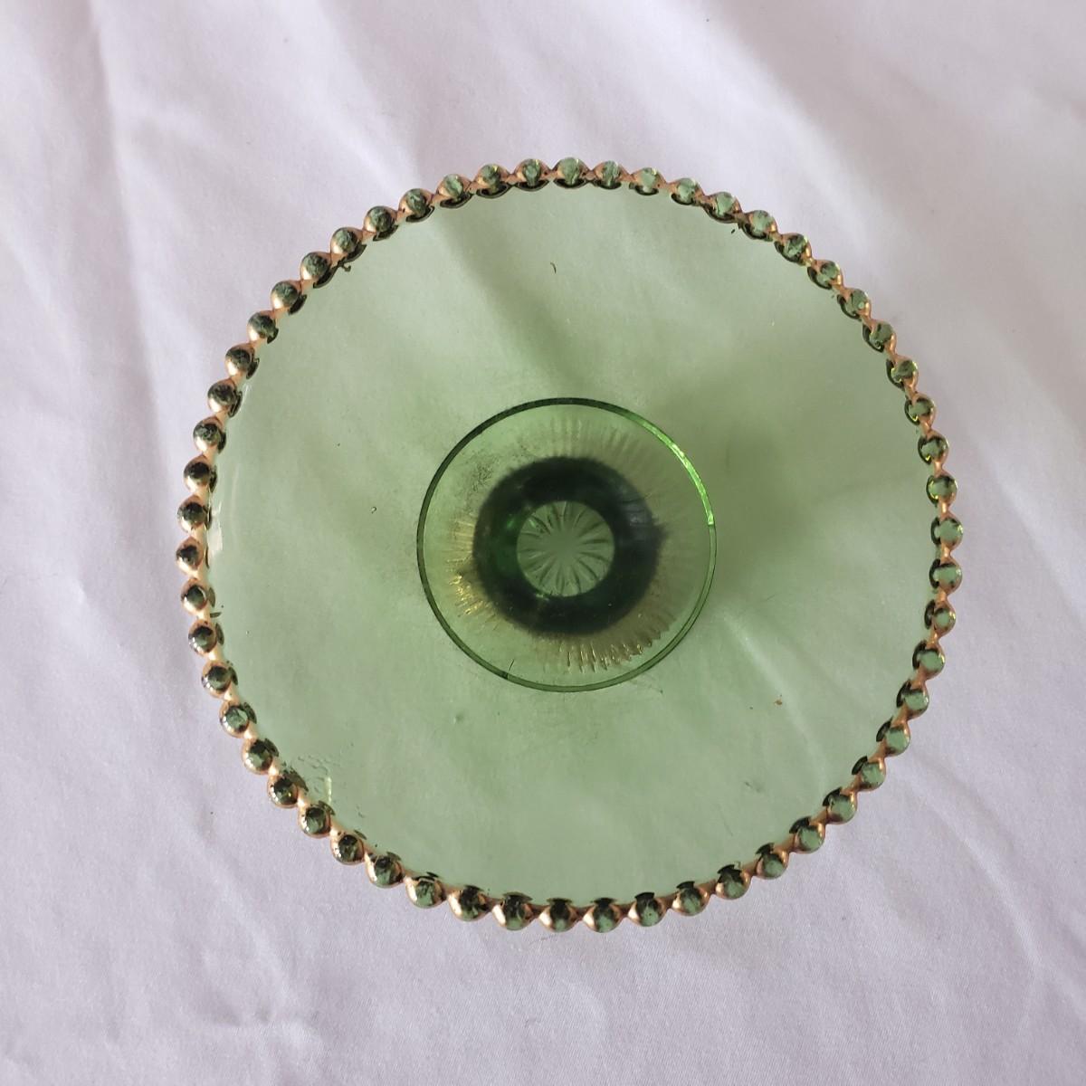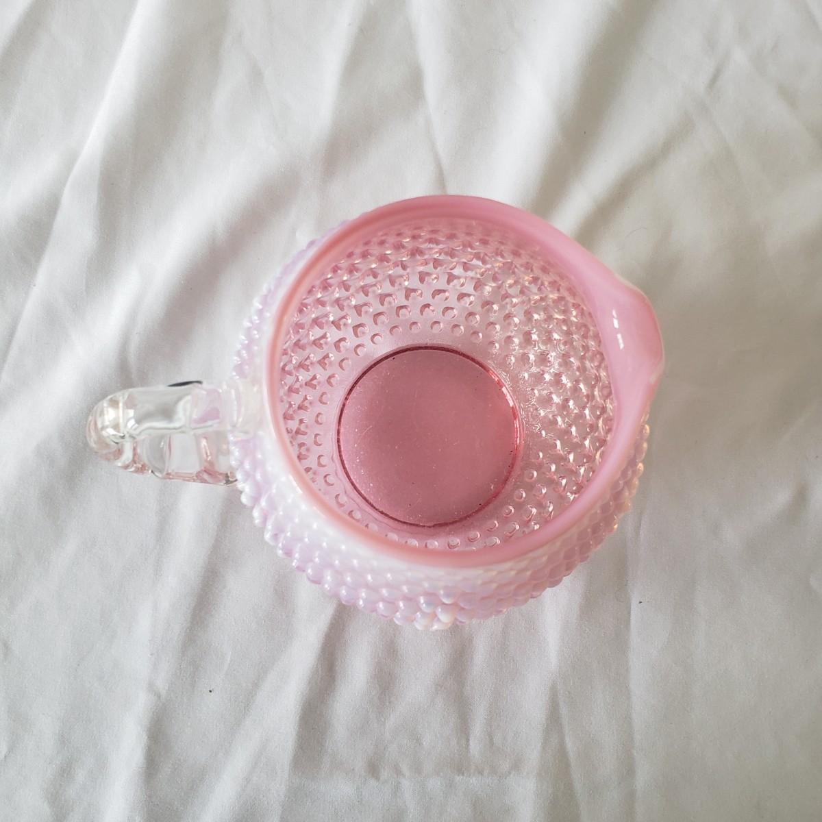 This lot contains four decorative glass items and a hand painted glass and brass lamp. The green bowl has gold edging and feet. The golden yellow bowl with handle is rough cut glass on the bottom. The hobnail pitcher is in pinks, clear and white tones and measures 7" x 5"H. The largest vase appears to be depression glass. The brass lamp with white glass lampshade is hand painted and measures 5" x 18"H. We cannot verify the lamp works.