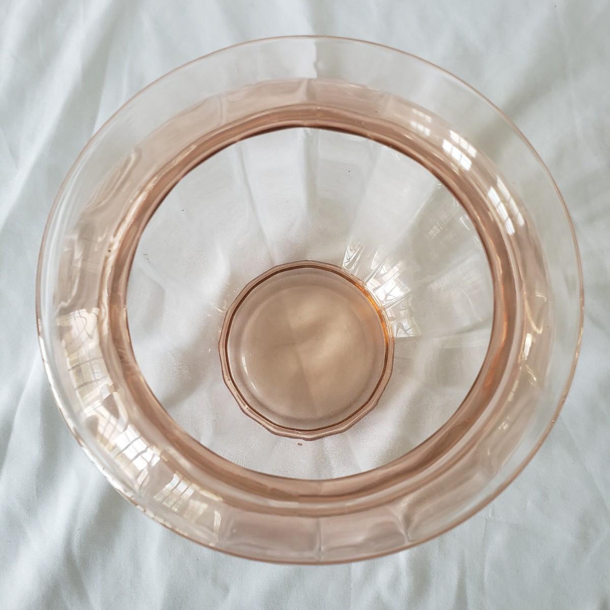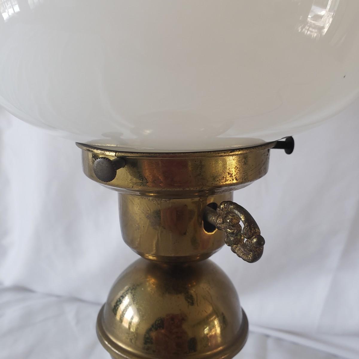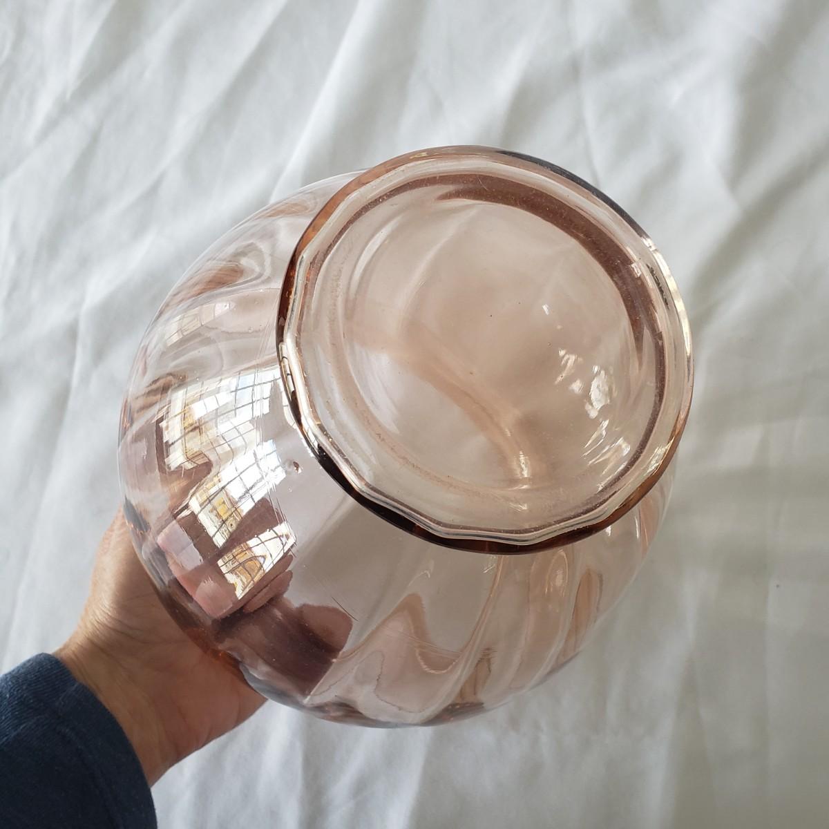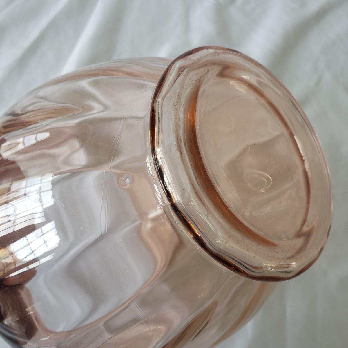 This lot contains four decorative glass items and a hand painted glass and brass lamp. The green bowl has gold edging and feet. The golden yellow bowl with handle is rough cut glass on the bottom. The hobnail pitcher is in pinks, clear and white tones and measures 7" x 5"H. The largest vase appears to be depression glass. The brass lamp with white glass lampshade is hand painted and measures 5" x 18"H. We cannot verify the lamp works.