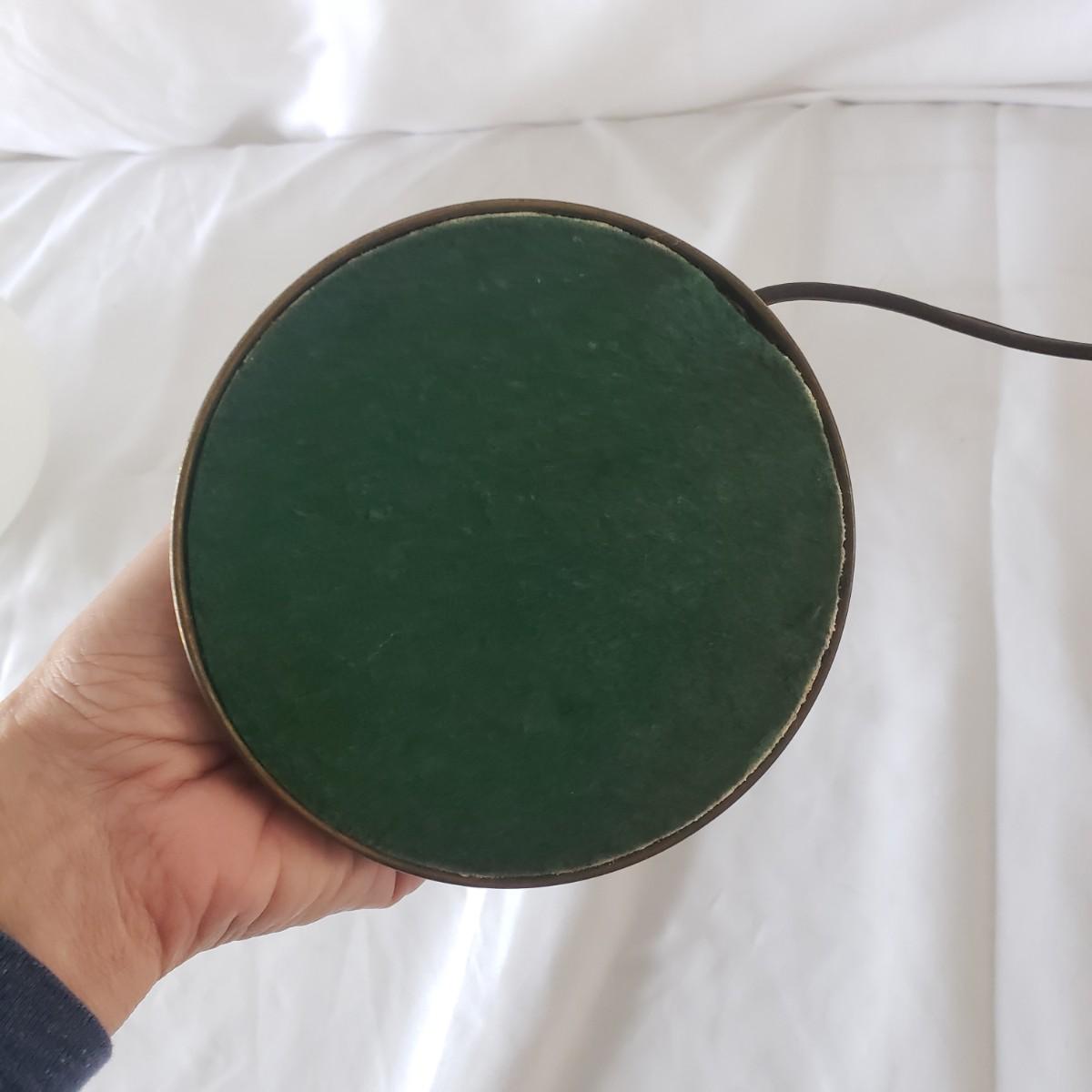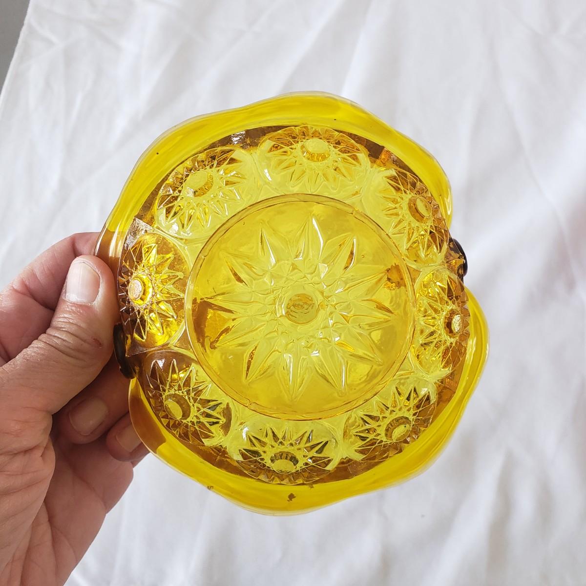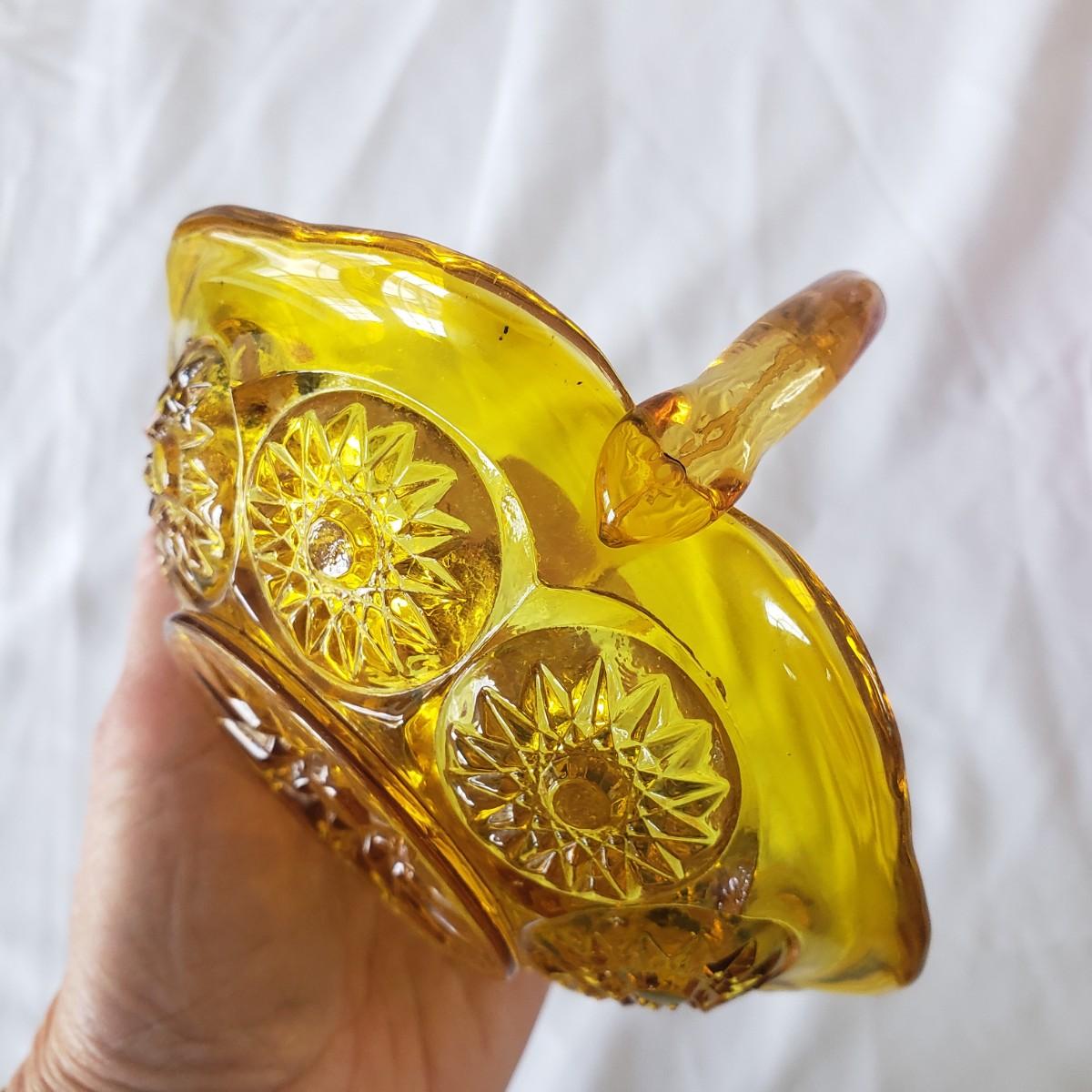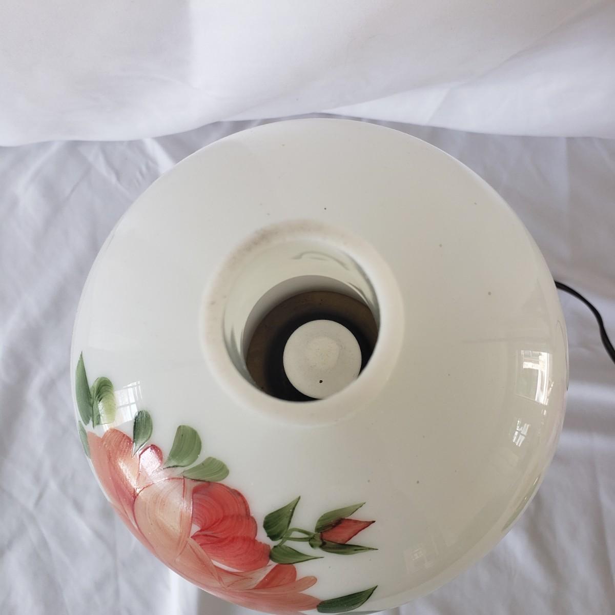 This lot contains four decorative glass items and a hand painted glass and brass lamp. The green bowl has gold edging and feet. The golden yellow bowl with handle is rough cut glass on the bottom. The hobnail pitcher is in pinks, clear and white tones and measures 7" x 5"H. The largest vase appears to be depression glass. The brass lamp with white glass lampshade is hand painted and measures 5" x 18"H. We cannot verify the lamp works.