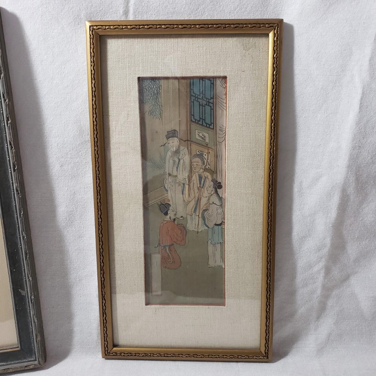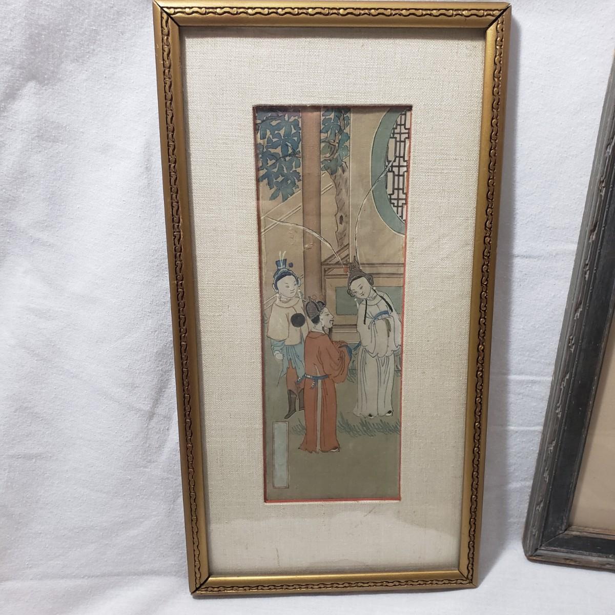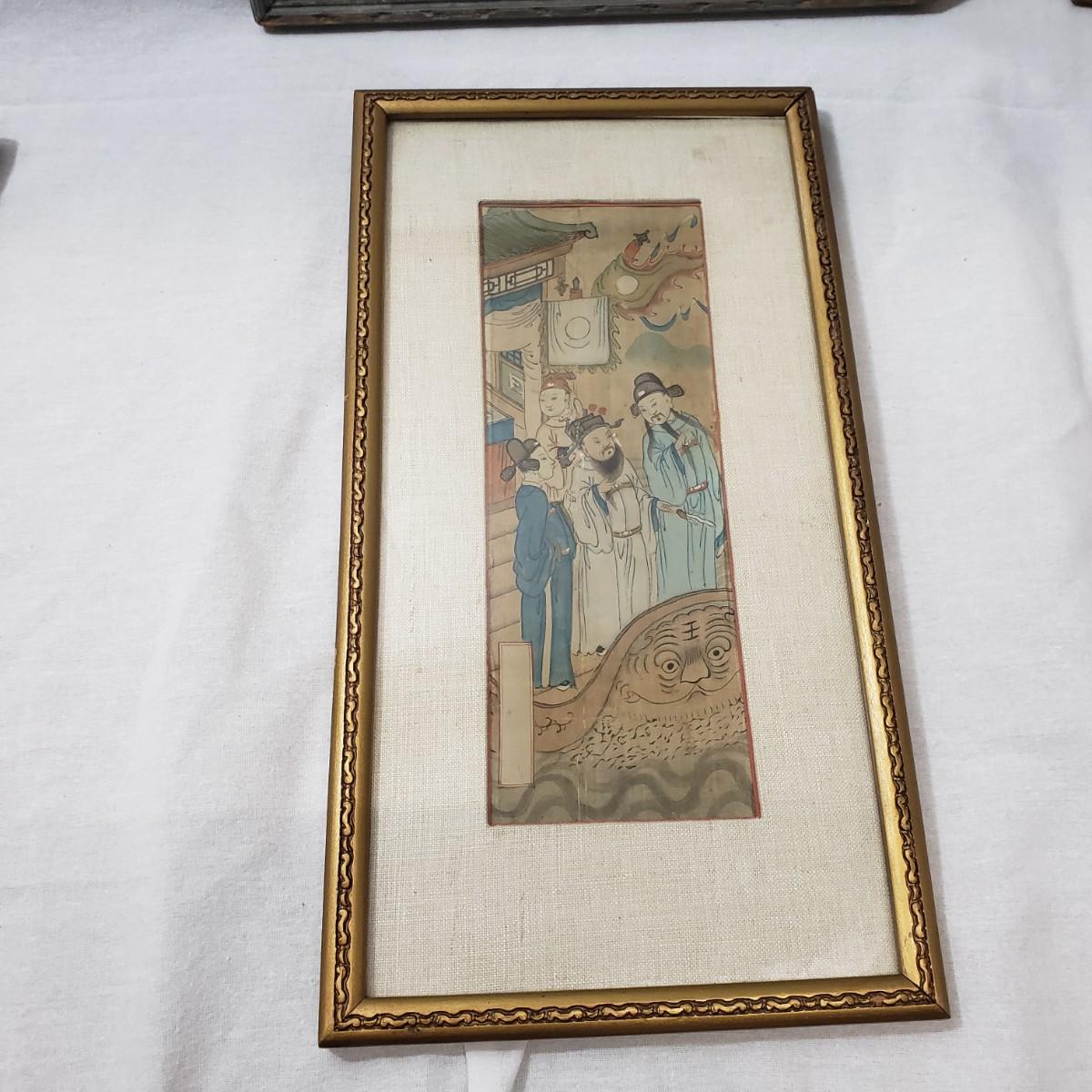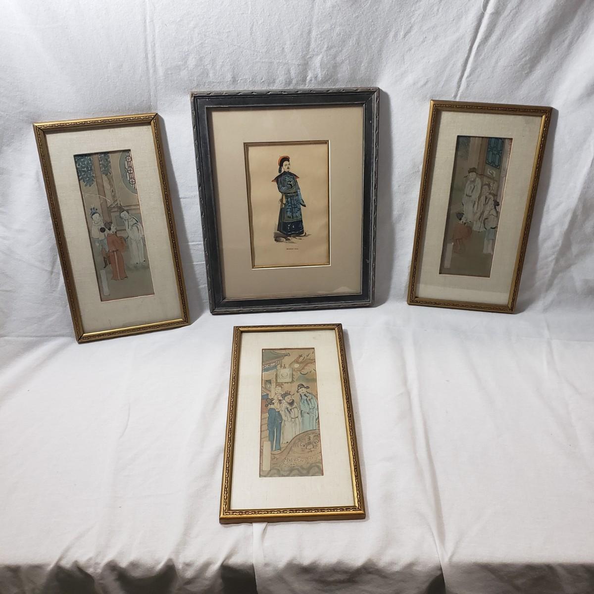 This lot features four Asian inspired artwork. The three matching, wooden gold frames with a tweed like matting are all under glass. It appears to be hand painted on canvas/cloth, see close up picture. Each piece measures approximately 7" x 14". There is some staining on the matting in one piece, see picture. The largest painting in a wooden grey toned frame is also under glass. This blue robed man painting has such fine details and the artist is, Pannemaler L.C., as we can make out from this piece, see pictures. This matted piece measures approximately 12" x 15". There is some wear on the frame, yet adds to this piece.