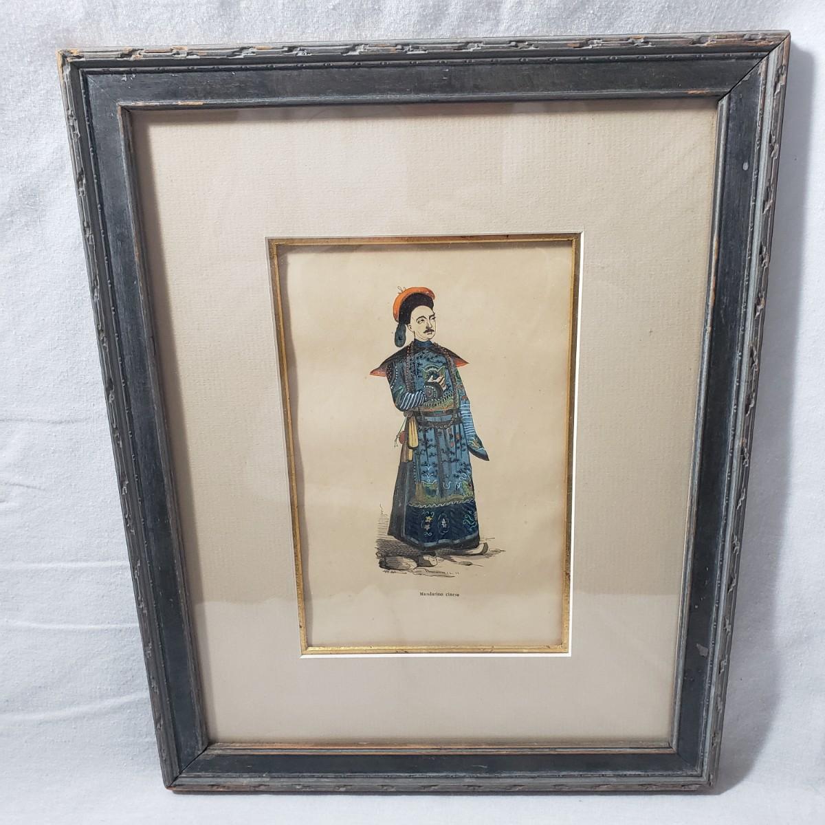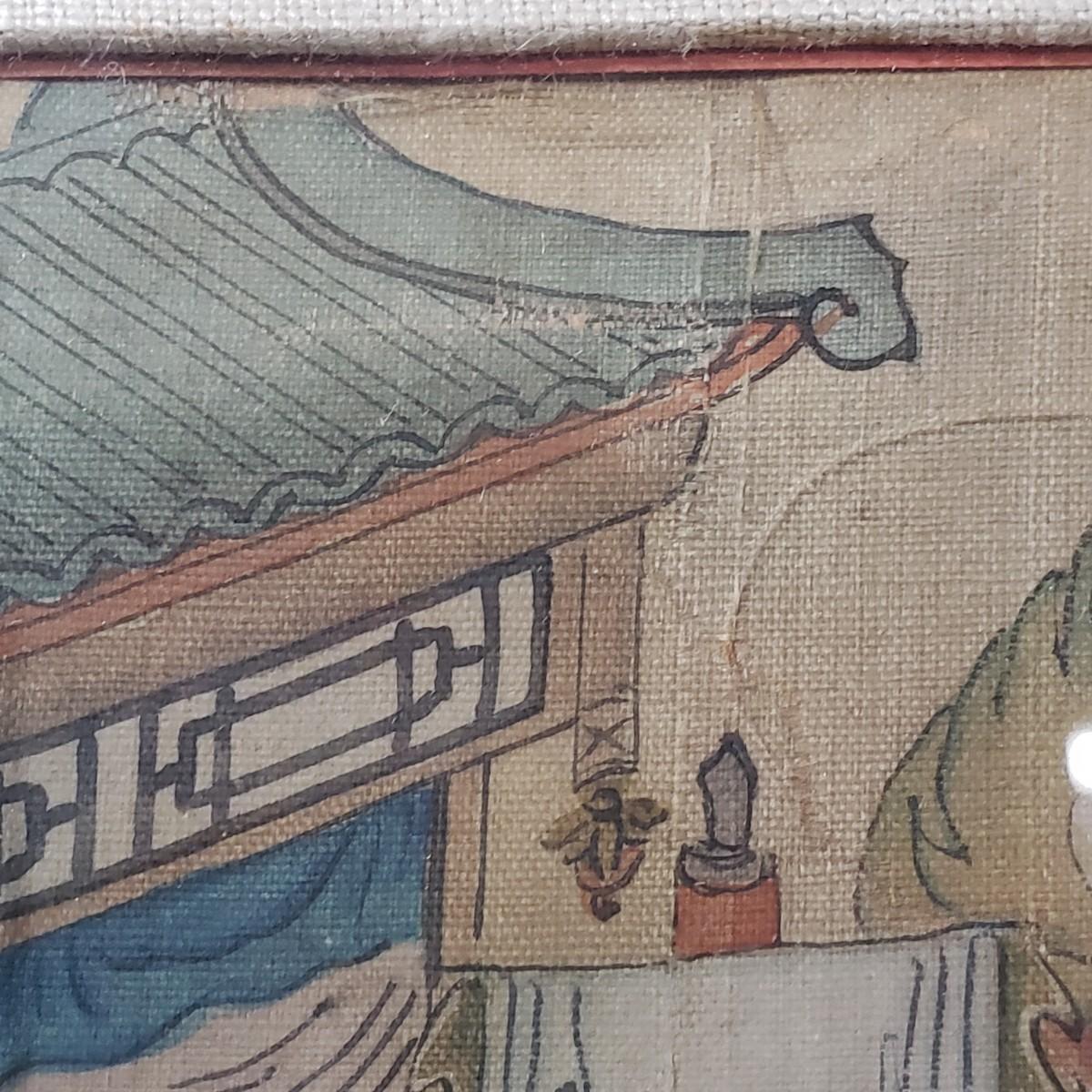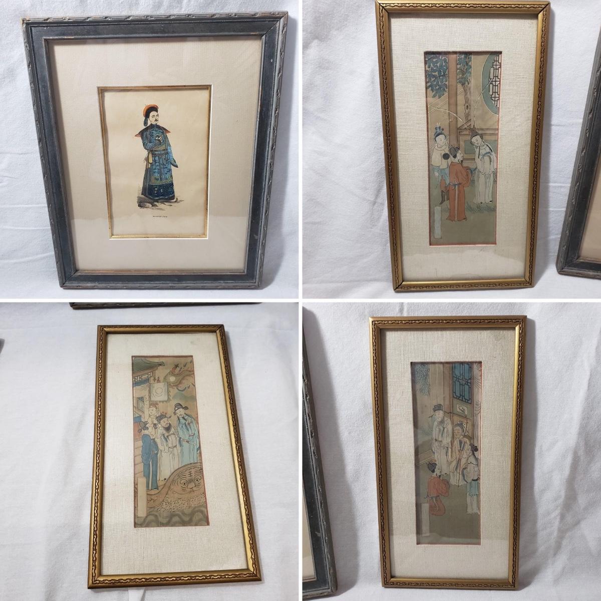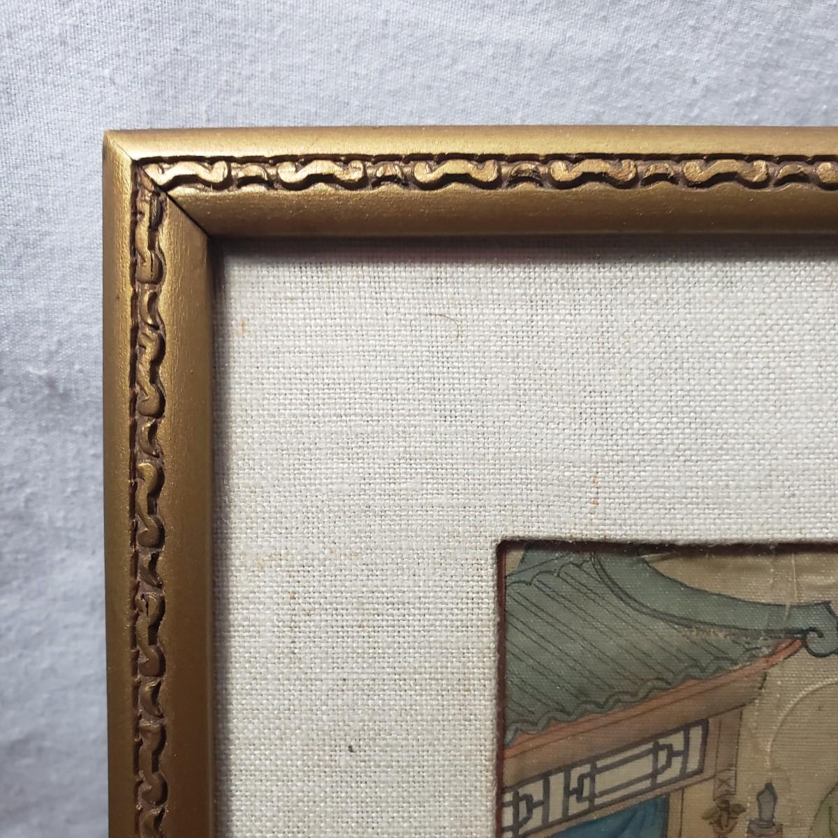 This lot features four Asian inspired artwork. The three matching, wooden gold frames with a tweed like matting are all under glass. It appears to be hand painted on canvas/cloth, see close up picture. Each piece measures approximately 7" x 14". There is some staining on the matting in one piece, see picture. The largest painting in a wooden grey toned frame is also under glass. This blue robed man painting has such fine details and the artist is, Pannemaler L.C., as we can make out from this piece, see pictures. This matted piece measures approximately 12" x 15". There is some wear on the frame, yet adds to this piece.
