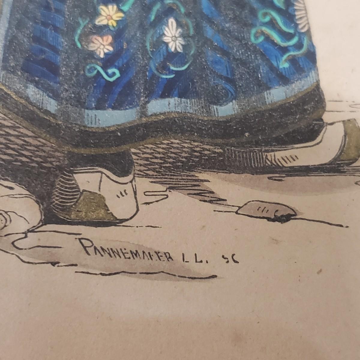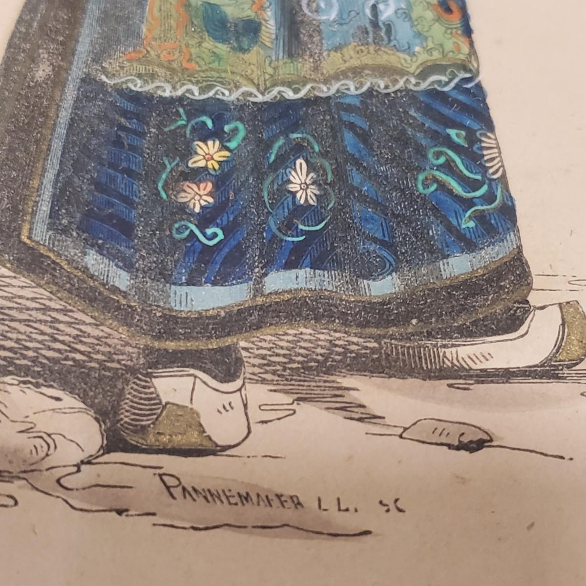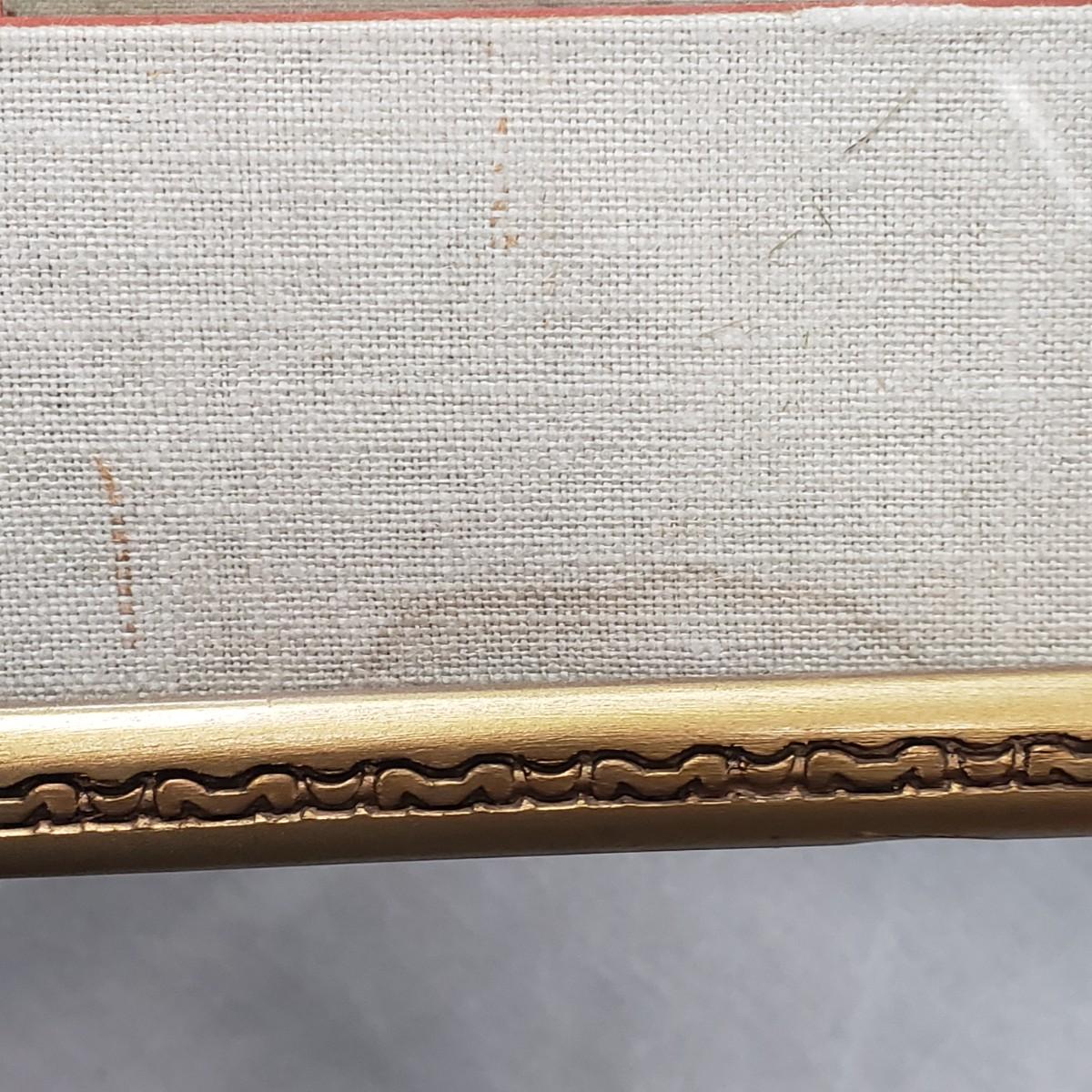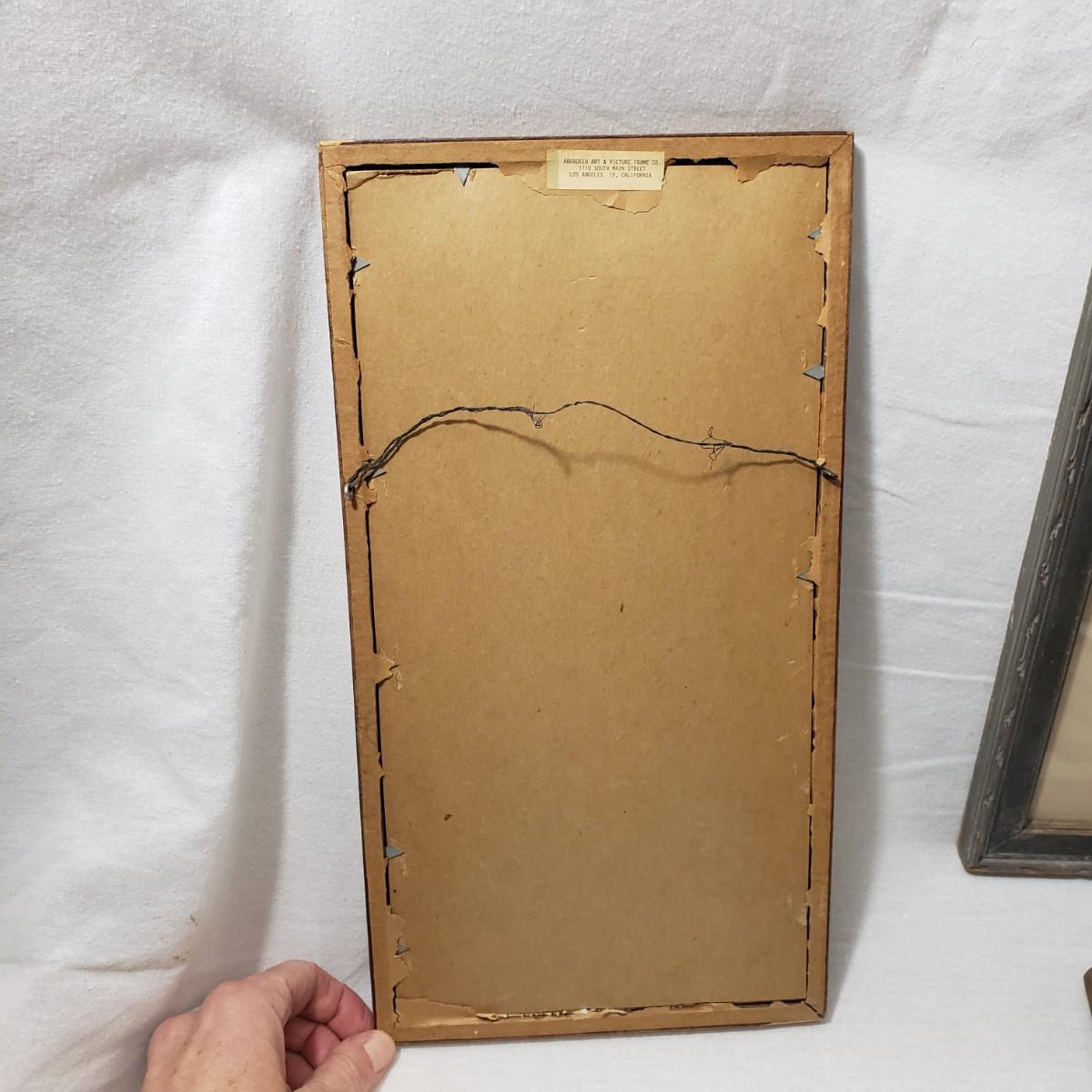 This lot features four Asian inspired artwork. The three matching, wooden gold frames with a tweed like matting are all under glass. It appears to be hand painted on canvas/cloth, see close up picture. Each piece measures approximately 7" x 14". There is some staining on the matting in one piece, see picture. The largest painting in a wooden grey toned frame is also under glass. This blue robed man painting has such fine details and the artist is, Pannemaler L.C., as we can make out from this piece, see pictures. This matted piece measures approximately 12" x 15". There is some wear on the frame, yet adds to this piece.