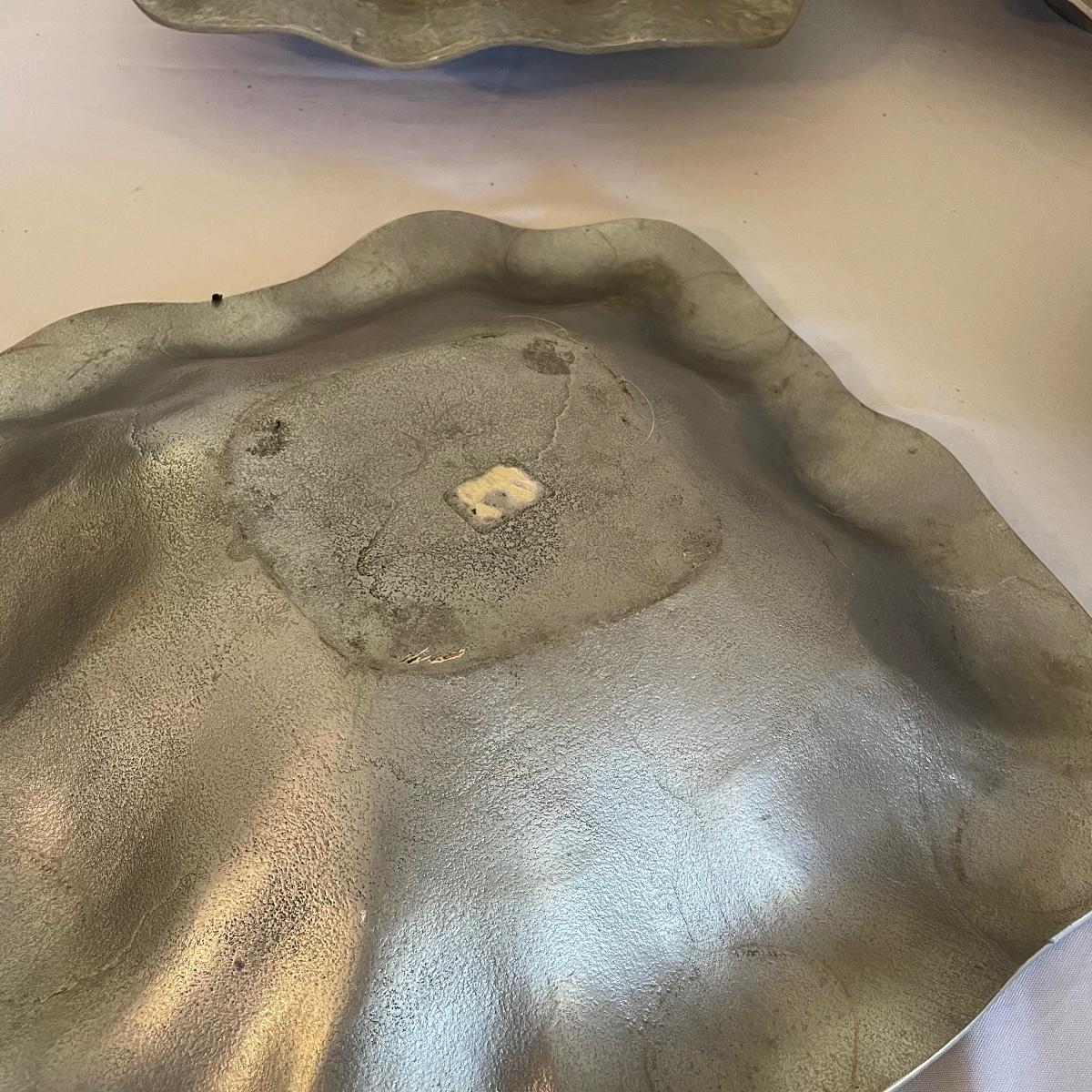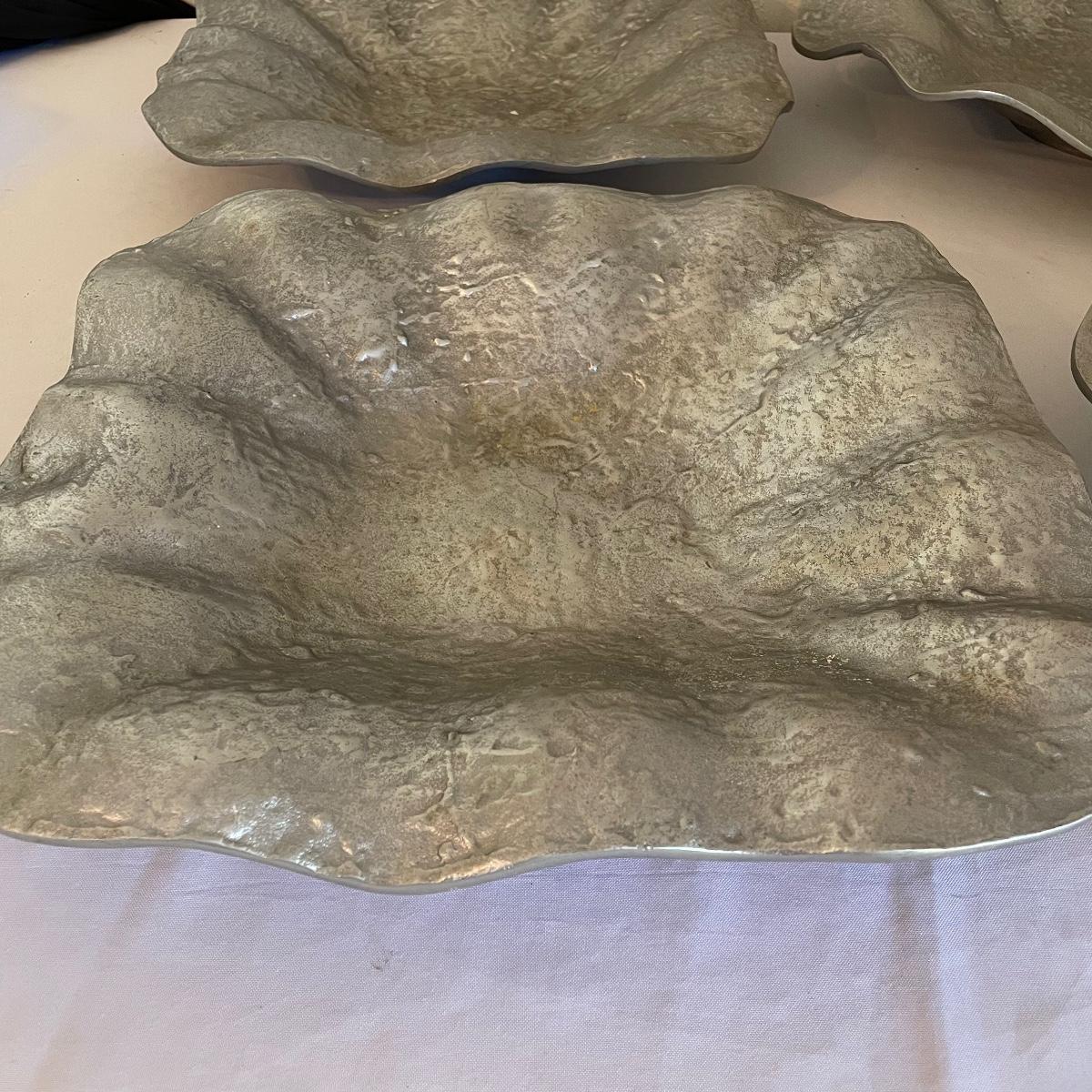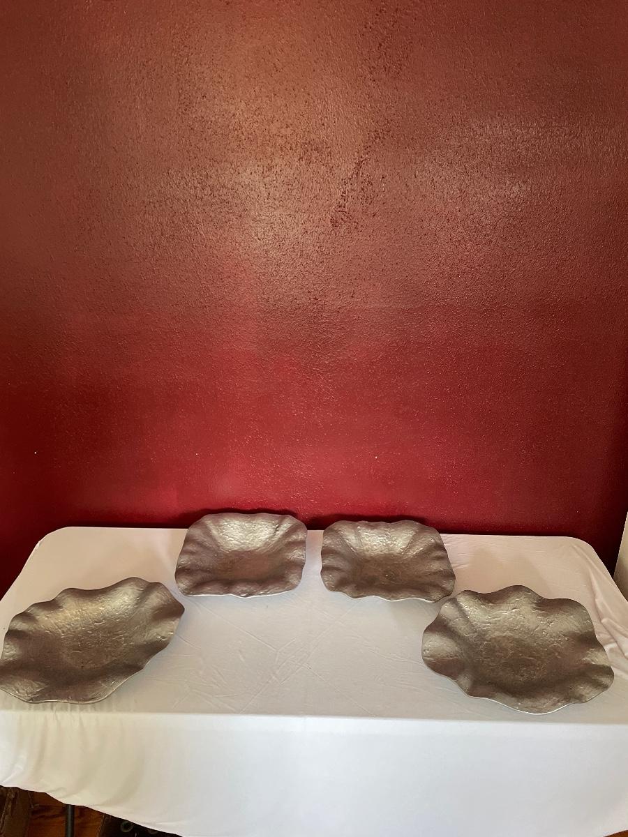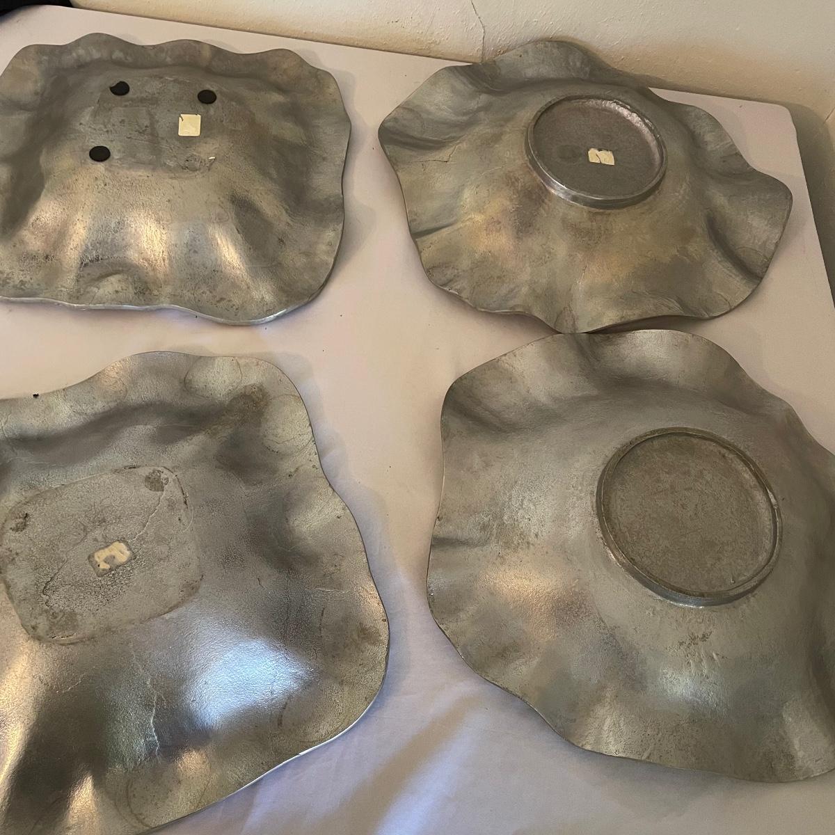 These four large platters appear to be pewter or pewter like. There are two round and two square.