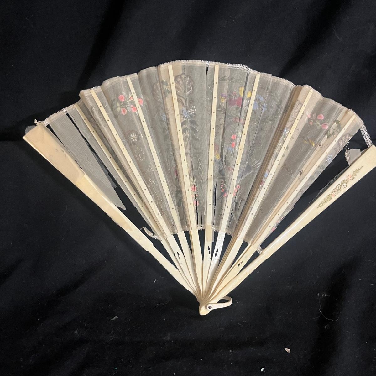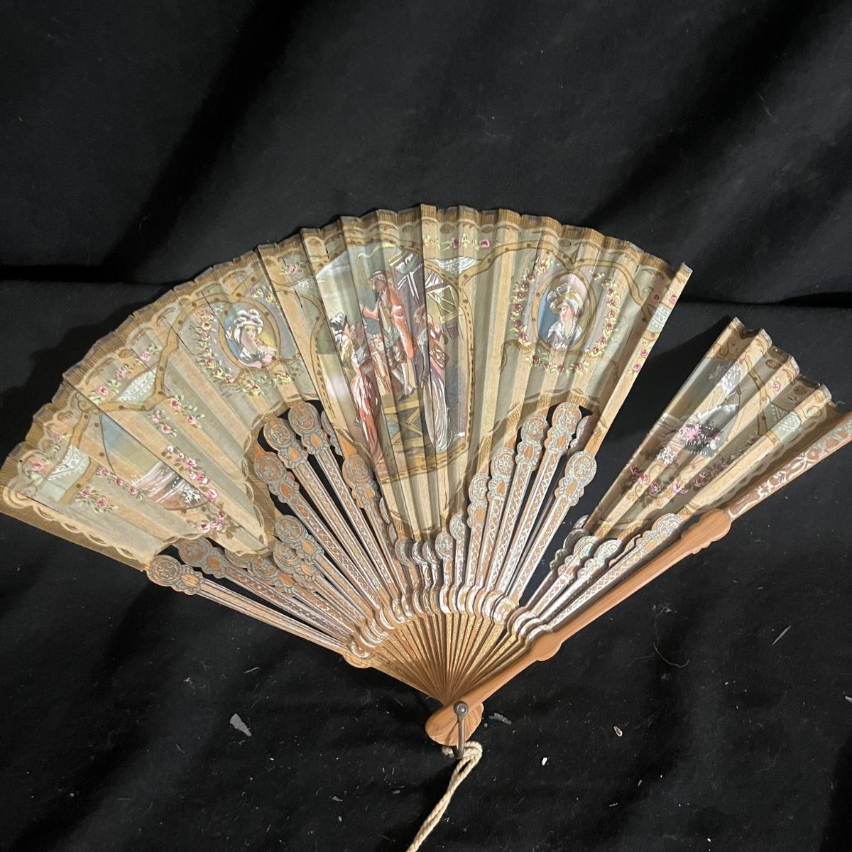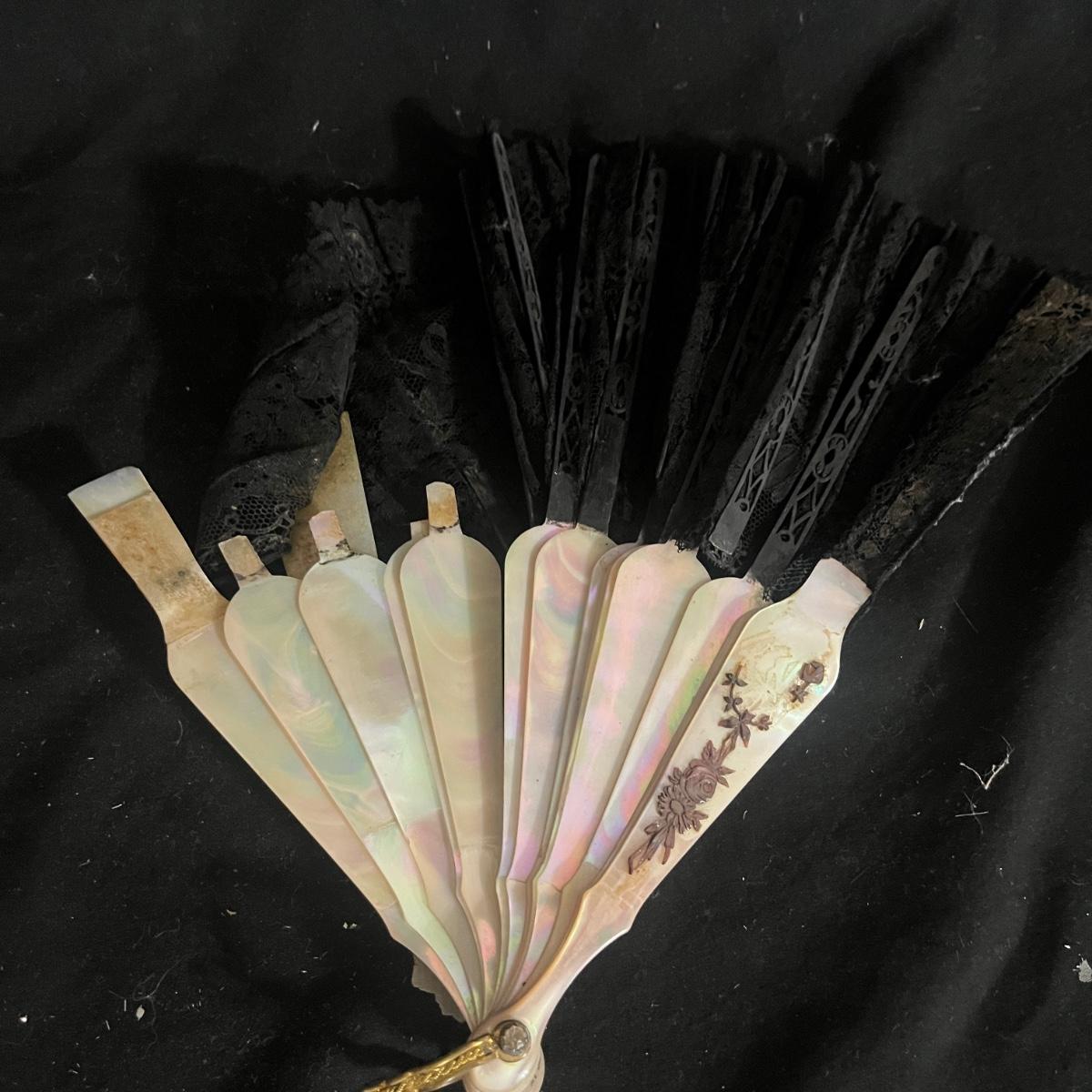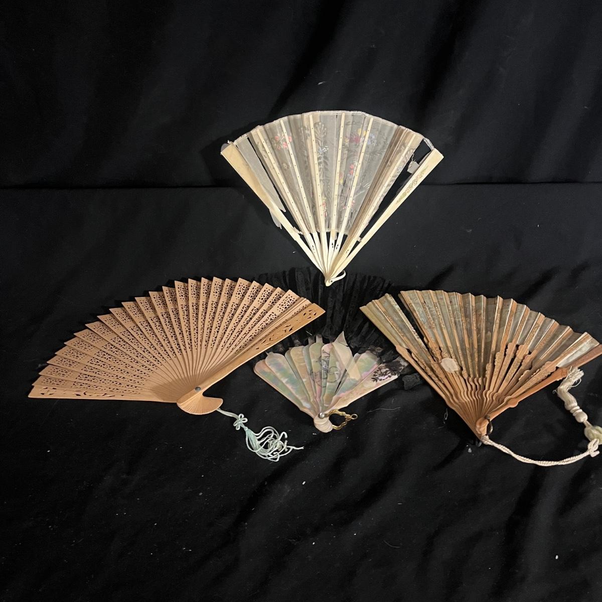 Lot contains four hand fans including one wooden fan, one wooden and fabric fan, one one fan that appears to be tortoise shell and fabric fans and a what appears to be mother of pearl and fabric fan. Wooden fan measures 14” x 1” x 8”H.