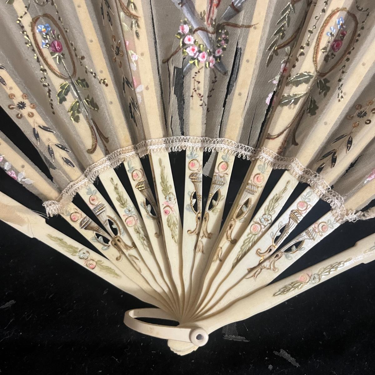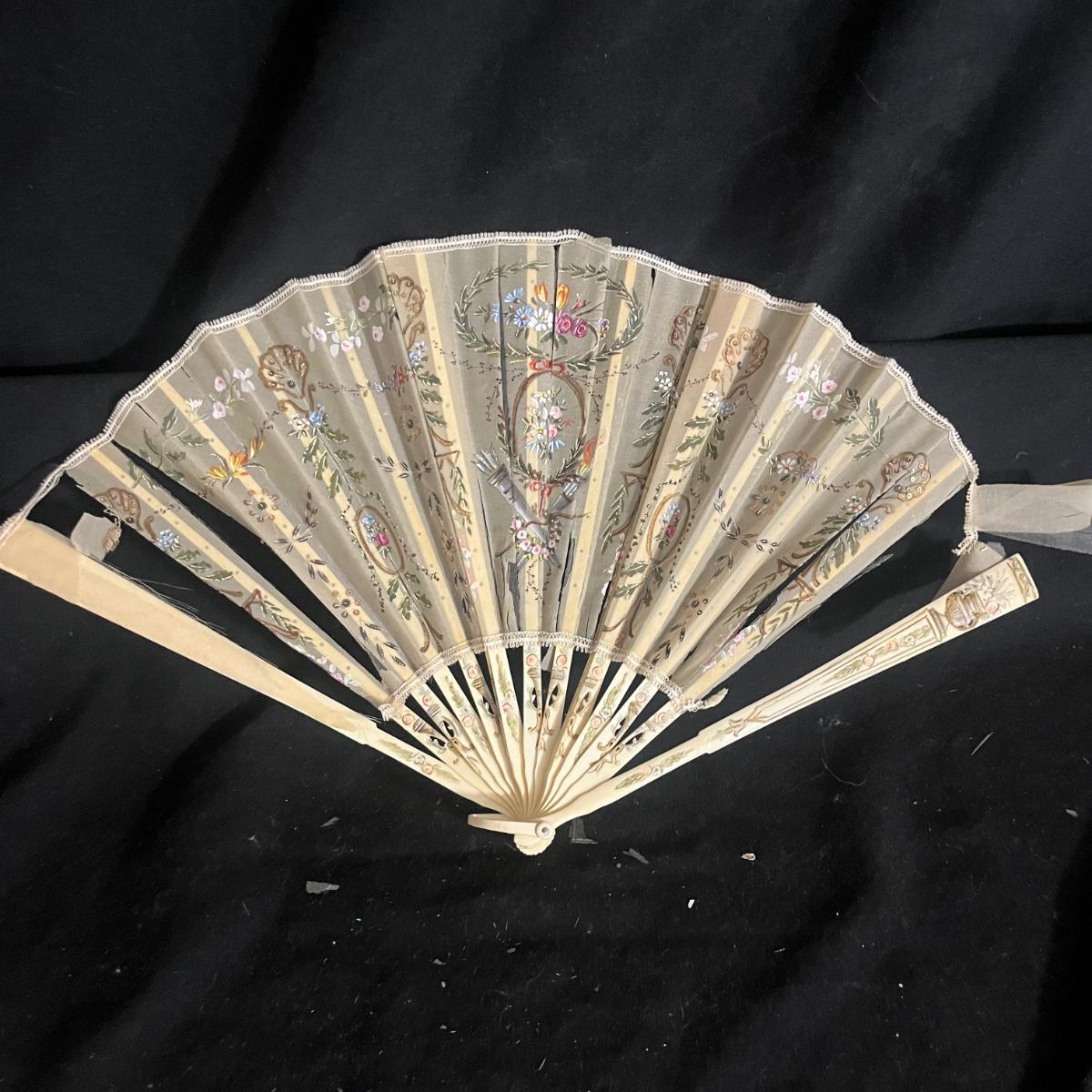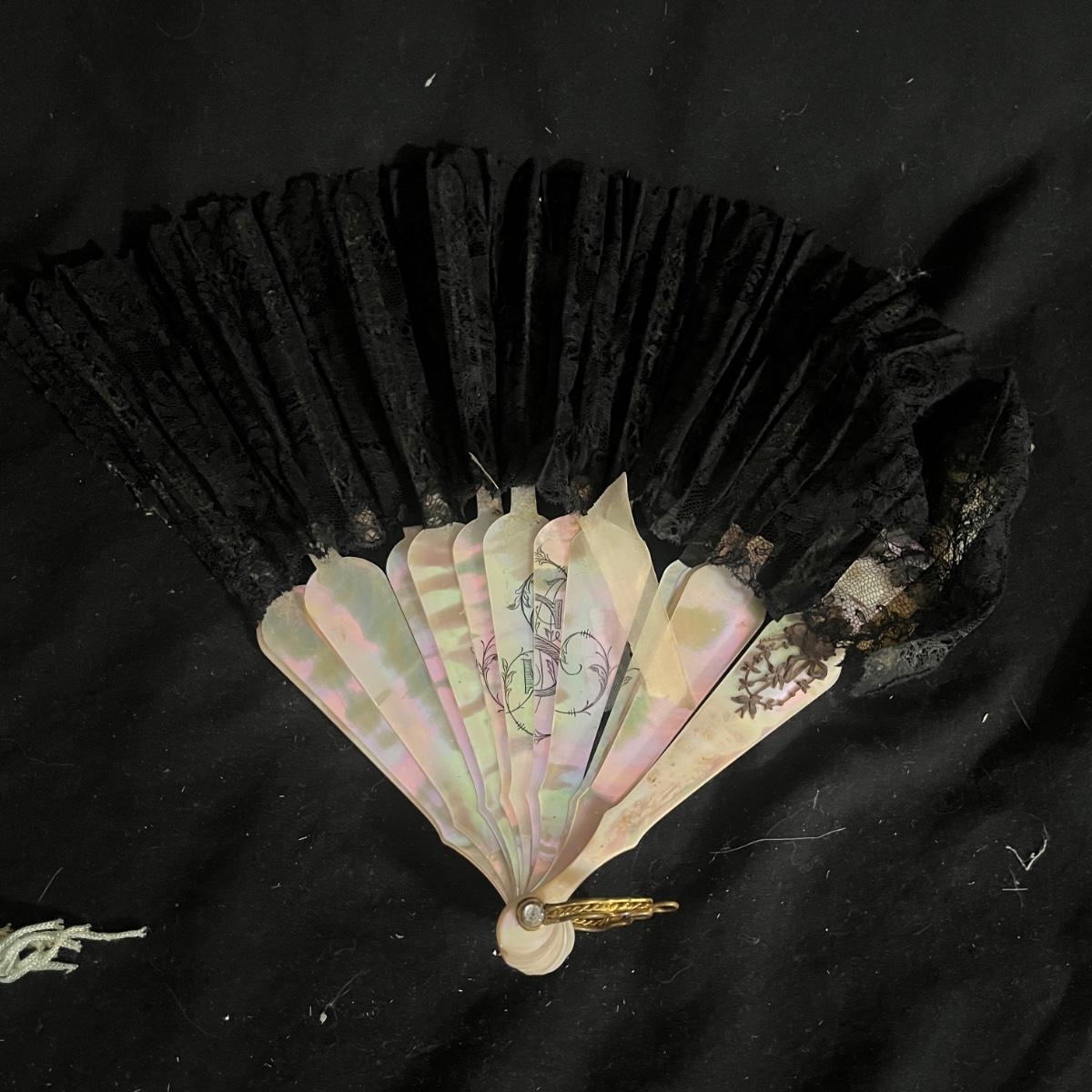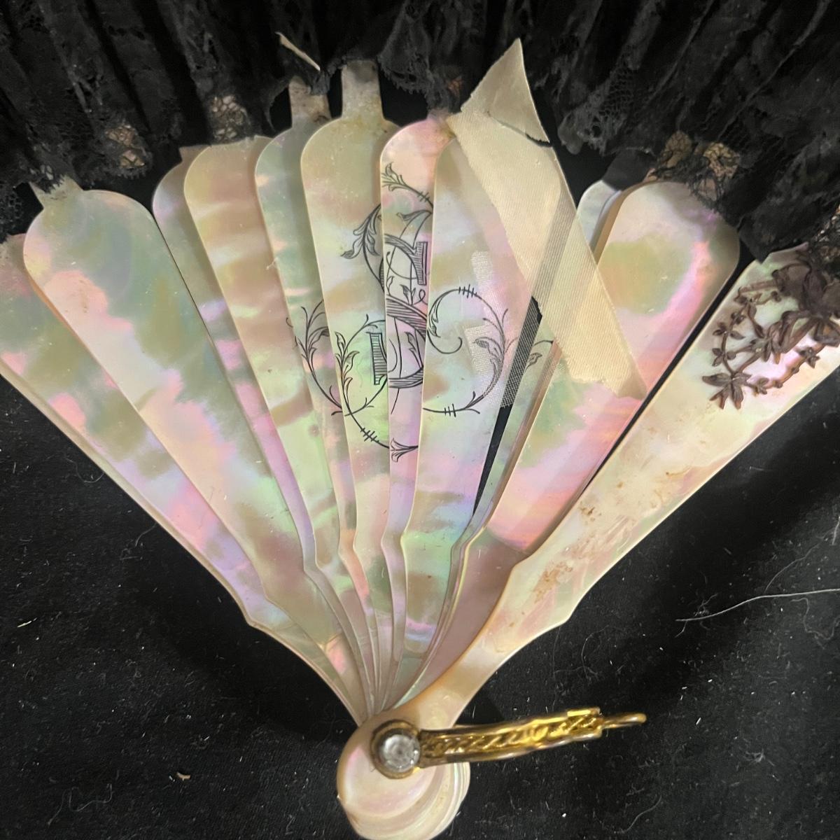 Lot contains four hand fans including one wooden fan, one wooden and fabric fan, one one fan that appears to be tortoise shell and fabric fans and a what appears to be mother of pearl and fabric fan. Wooden fan measures 14” x 1” x 8”H.