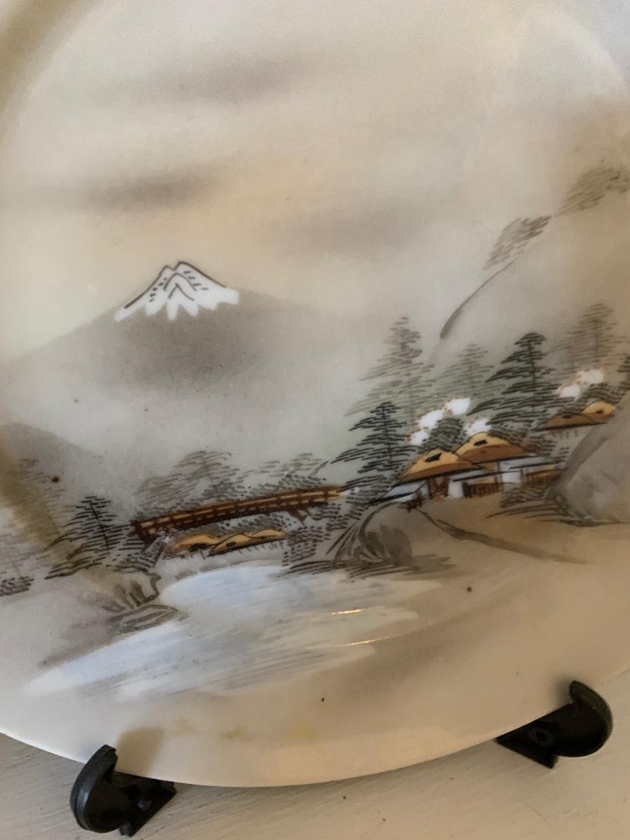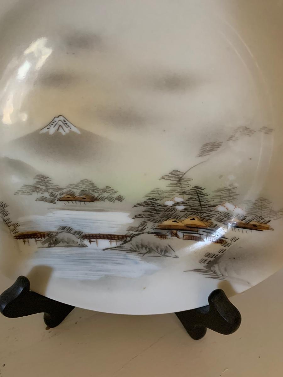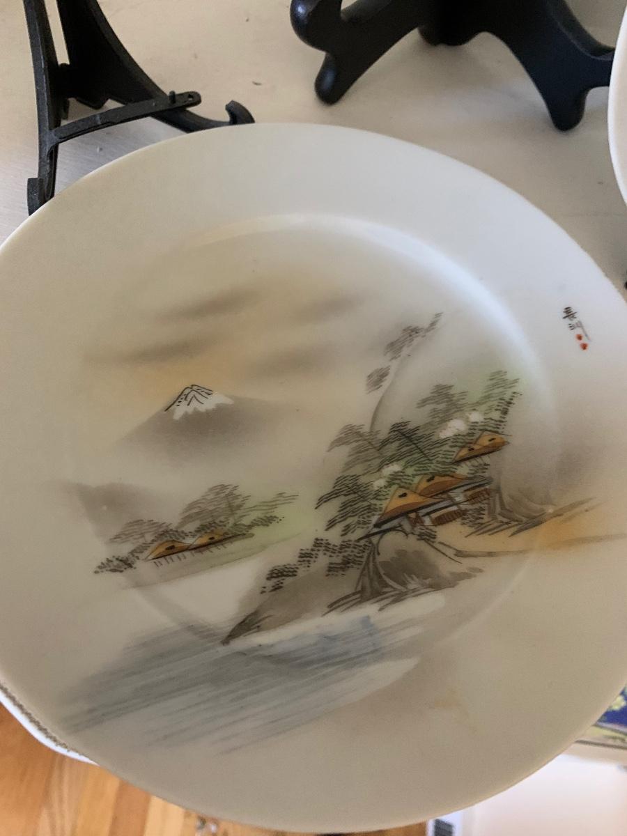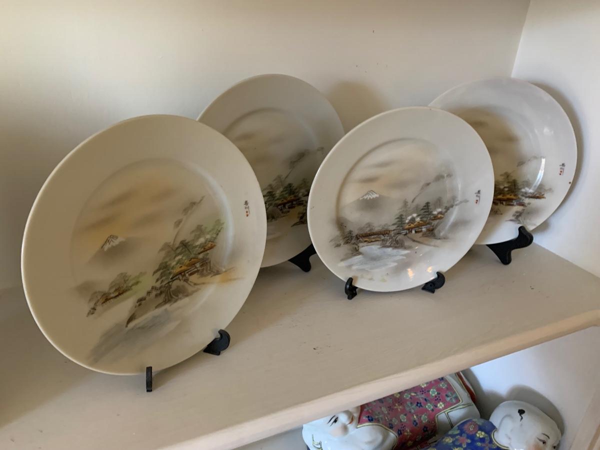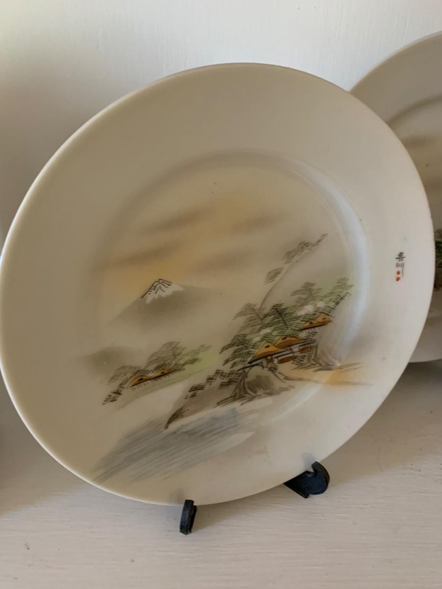 FOUR Signed Hand Painted Japan Scenes Mount Fuji 7” Plates w/ Stands