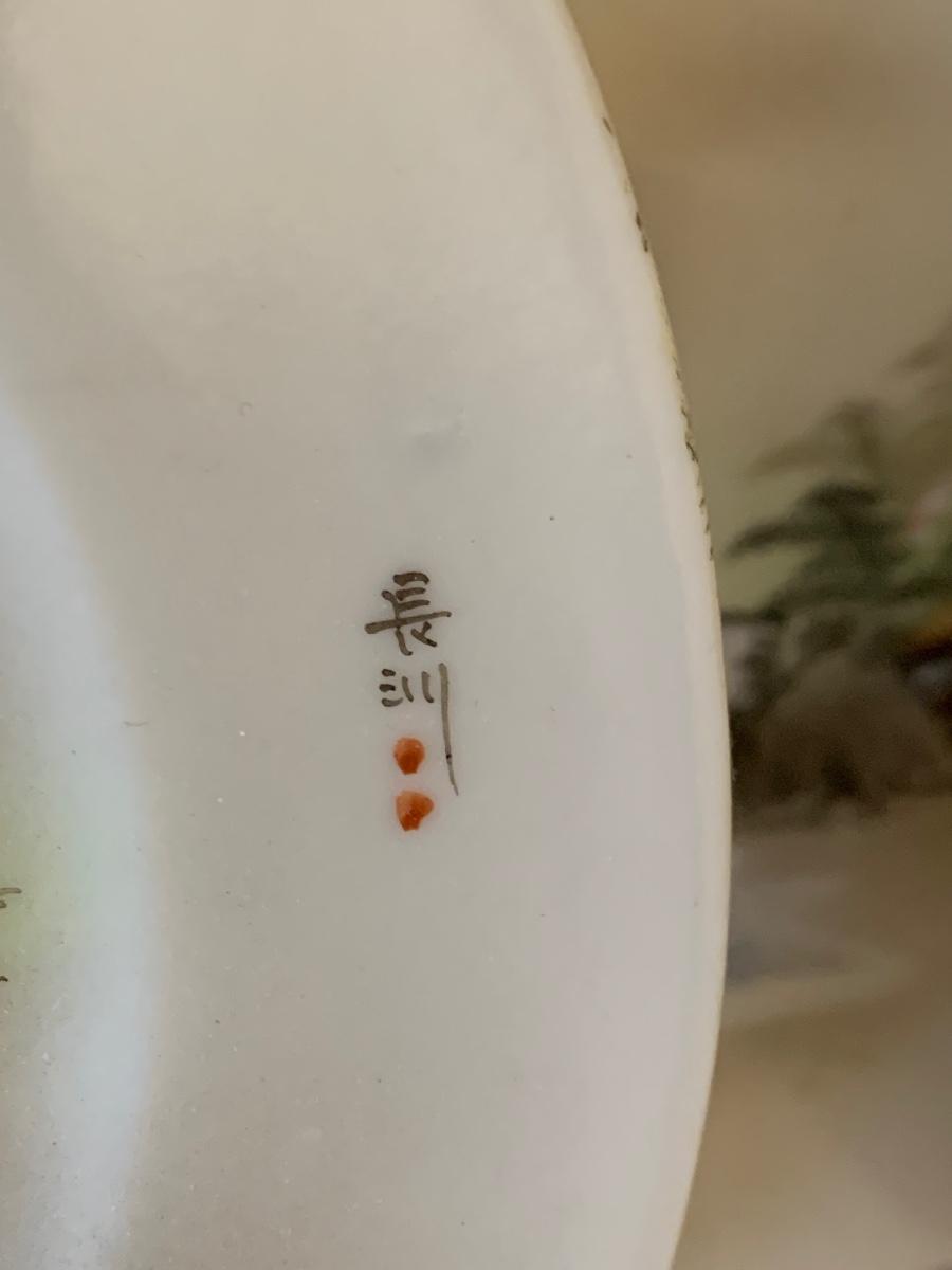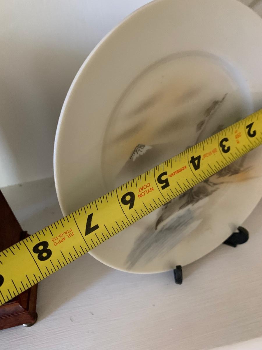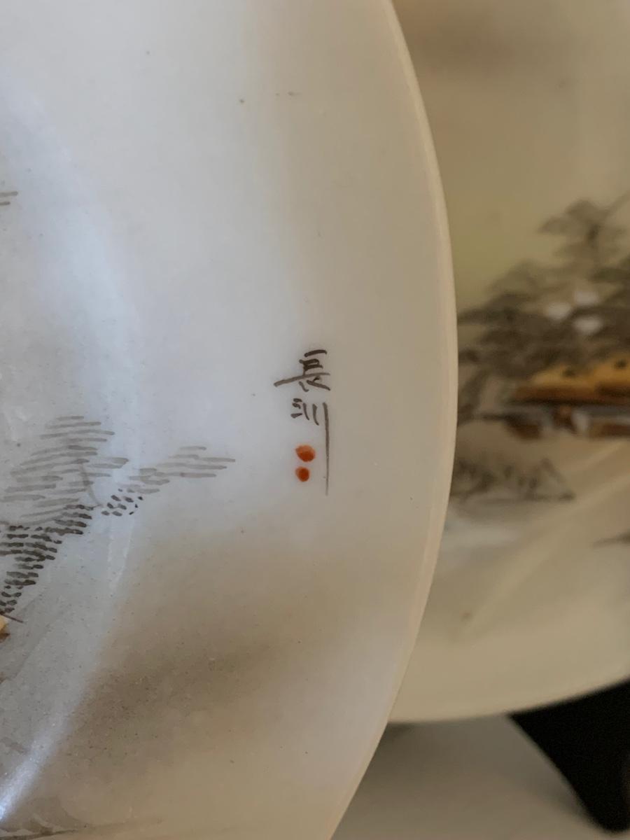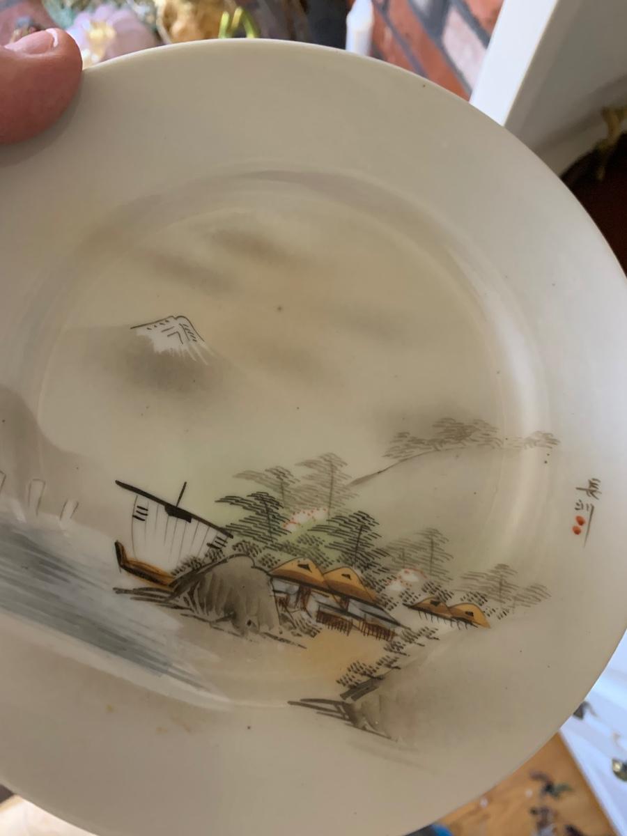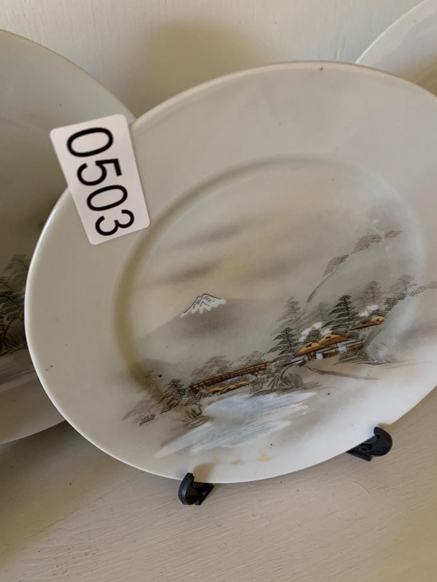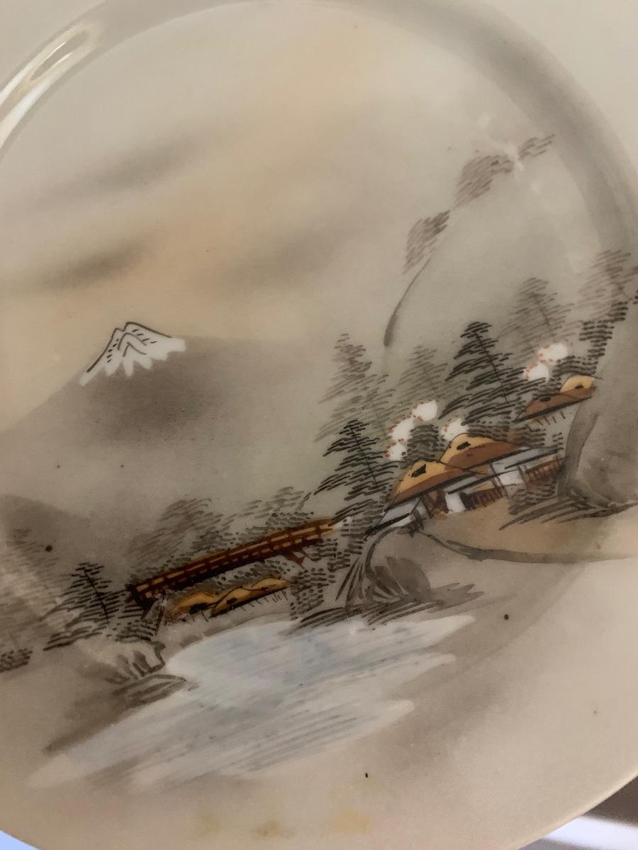 FOUR Signed Hand Painted Japan Scenes Mount Fuji 7” Plates w/ Stands